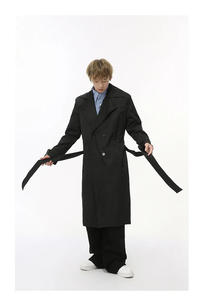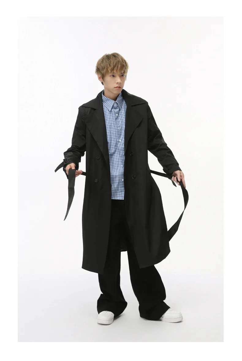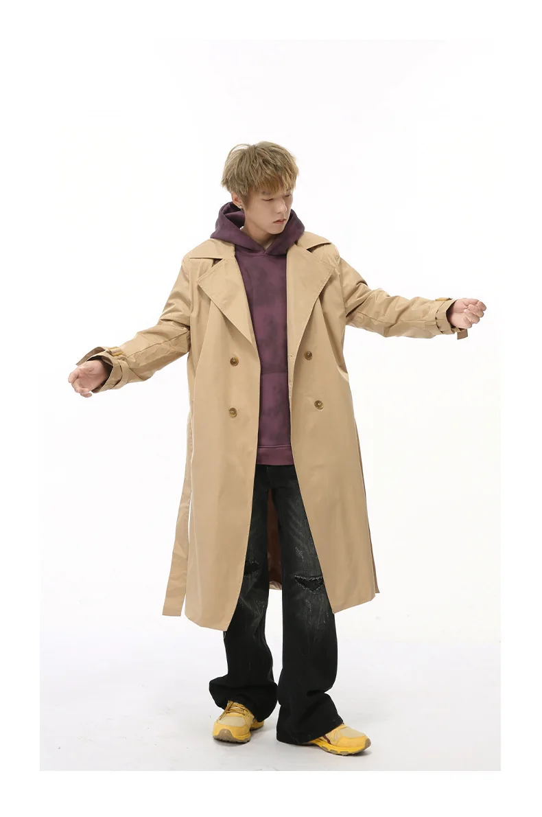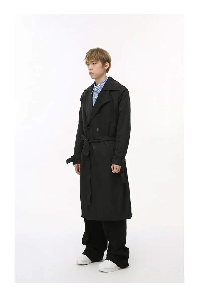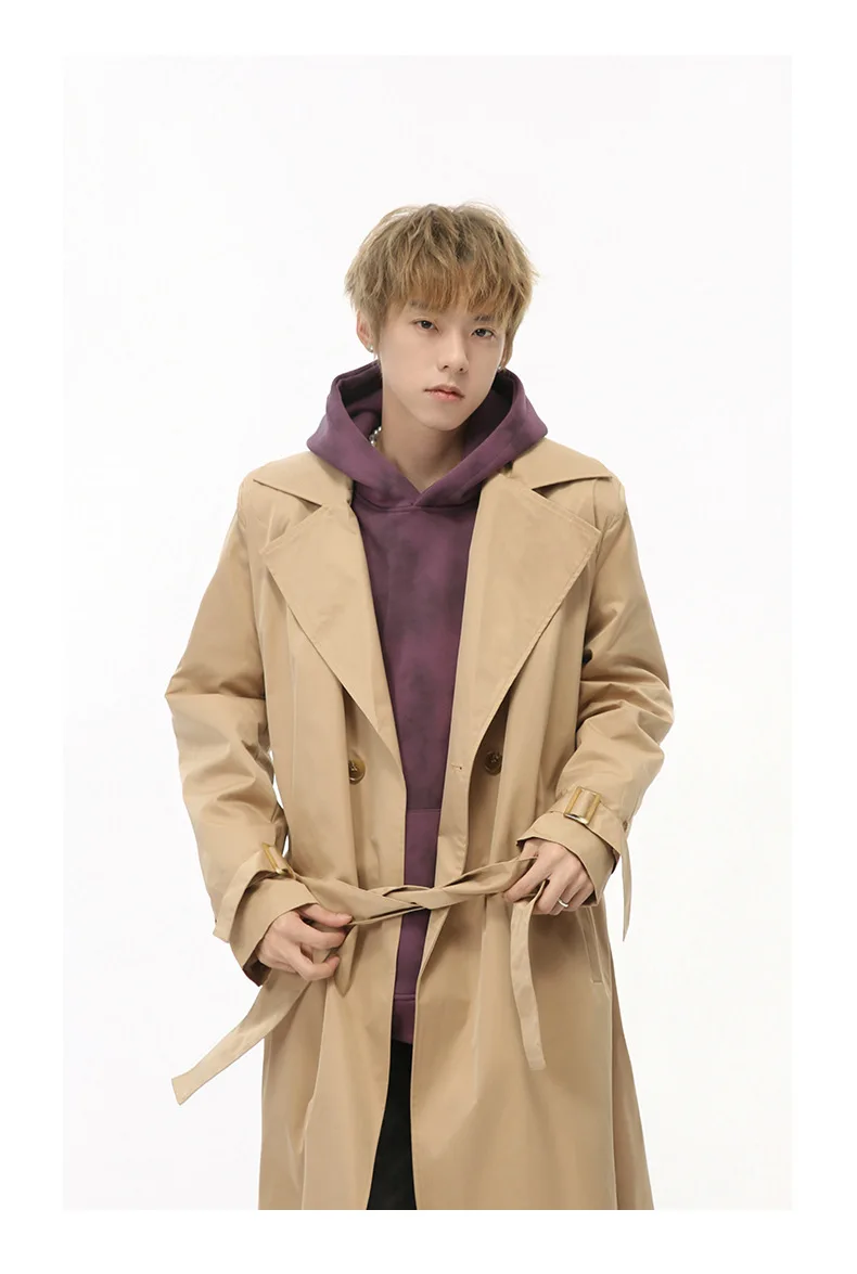Double Breasted Men's Trench Belt Solid Color Long Menwear Korean Style Overknee Male Windbreakers New Simple