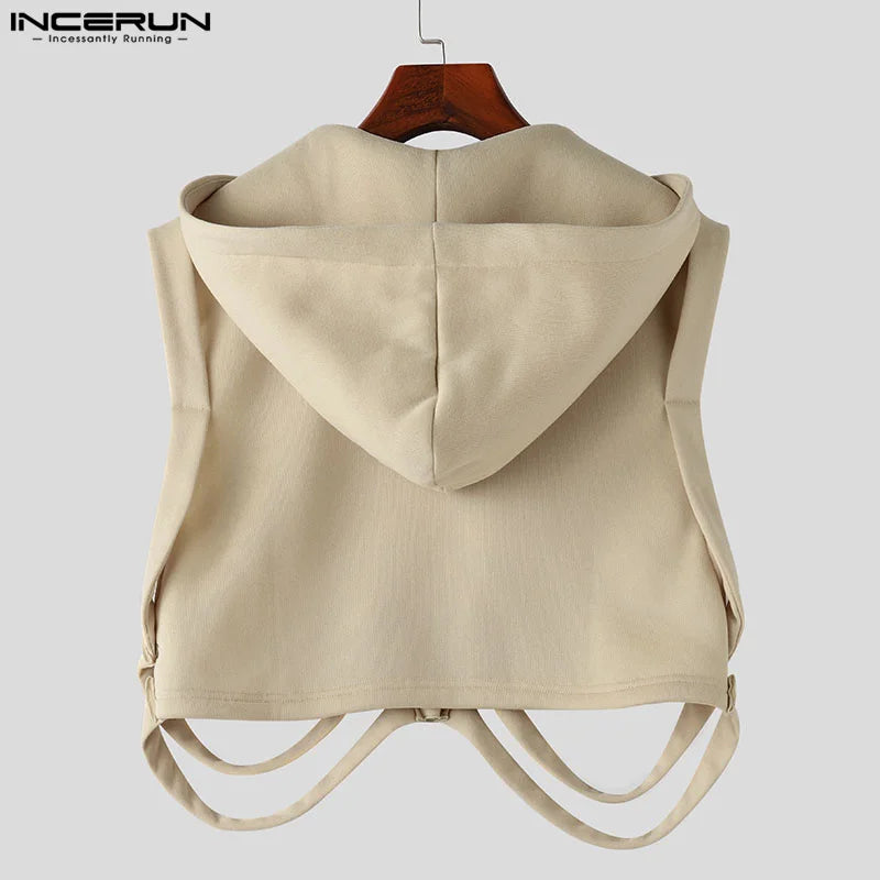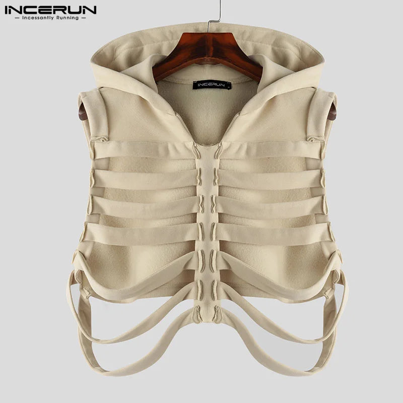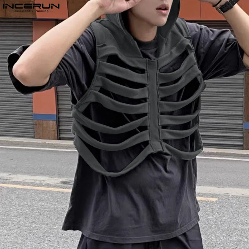 Fashion Casual Style Tops New Men's Funny Bone Deconstruction Design Vests Personality Solid Hooded Waistcoat S-5XL