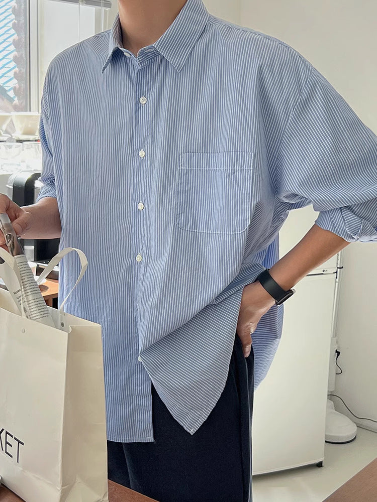 90s fashion men Korean Style Casual Shirt Light Mature Loose Blue Loose Long Sleeve Shirt Thin Striped Spring and Autumn New Men's Korean Style