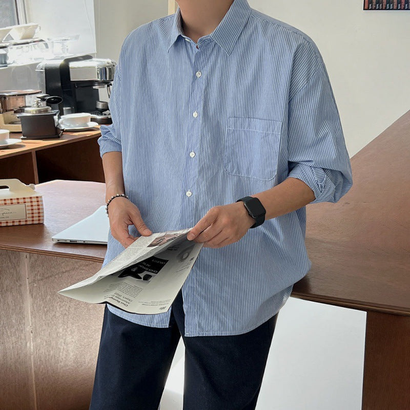 Gotmes-shop 90s fashion men Myq Blue Striped Shirt Men's Autumn New Korean Style Loose Long Sleeve Shirt High-Grade Shirt