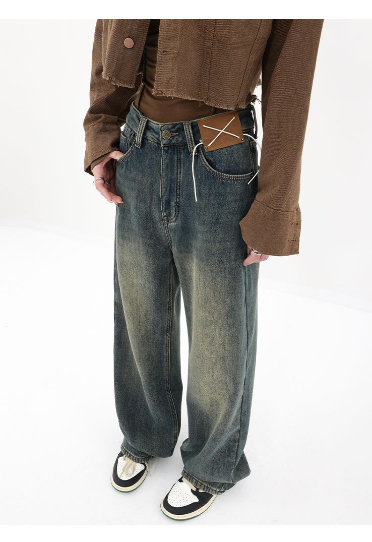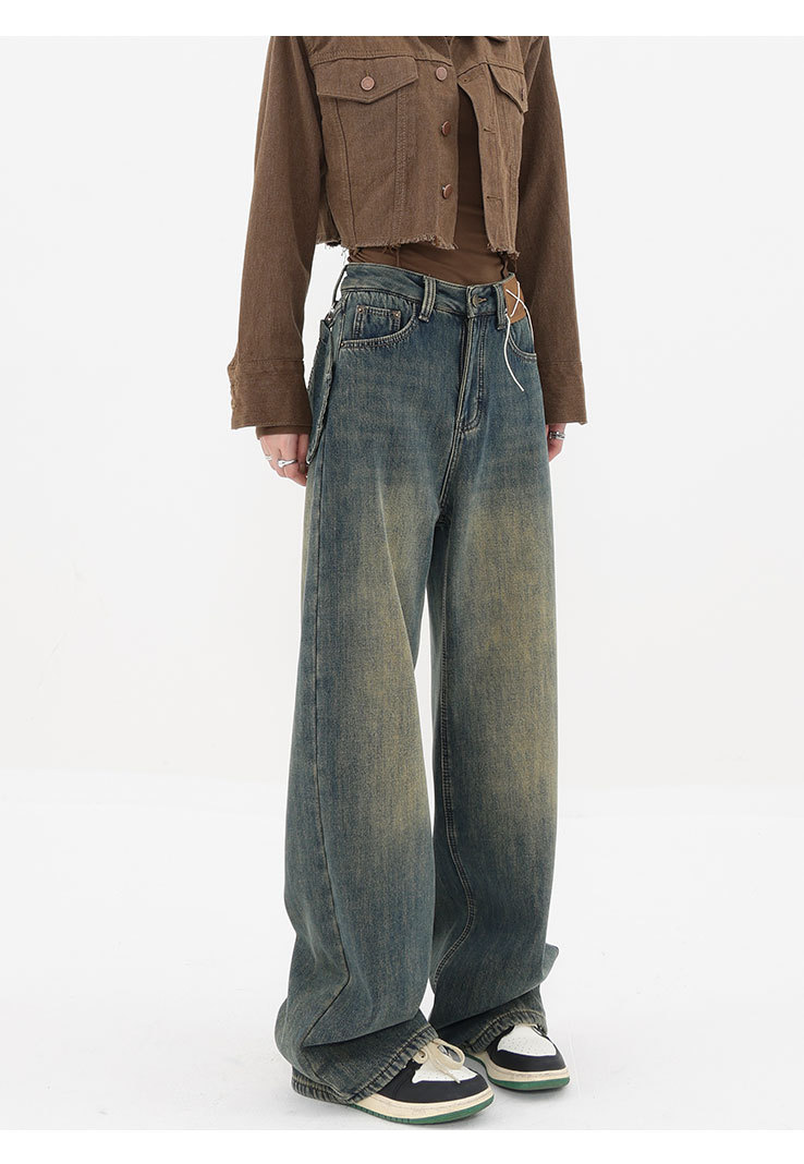 90s streetwear Summer New Retro Washed Distressed Straight Jeans Women's High Waist Loose All-Match Wide-Leg Mopping Pants