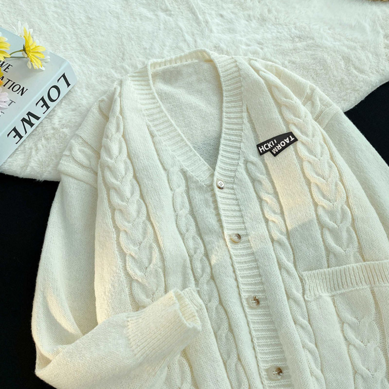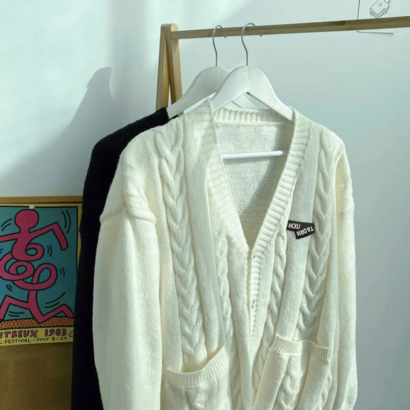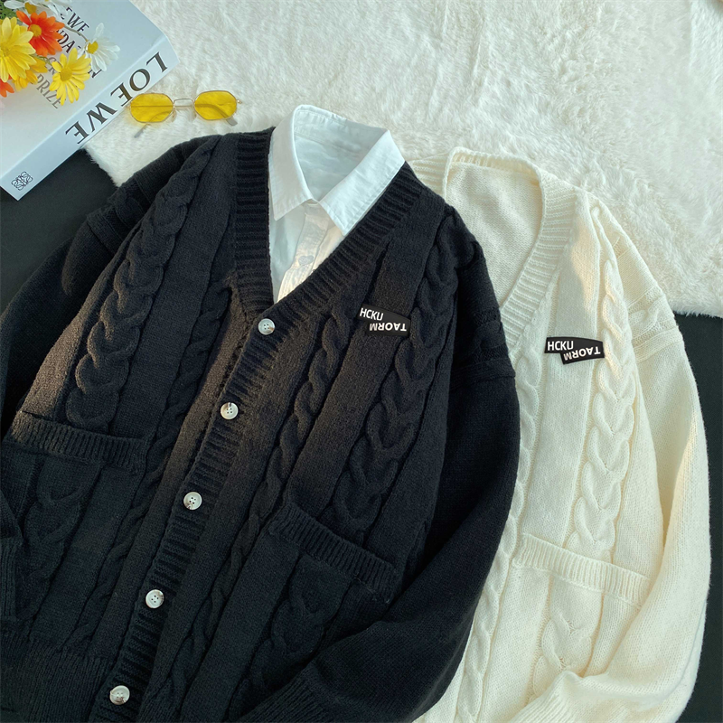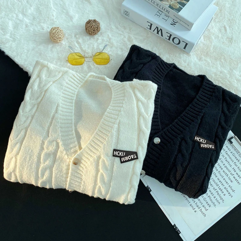 Letter Twists Cardigan Sweater Men New Preppy Grunge Cityboy Knit Jacket Japan Couple Casual V-neck Sweater Coat