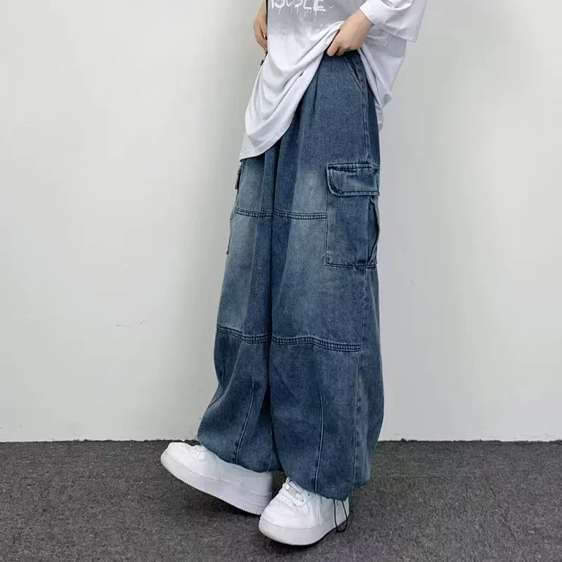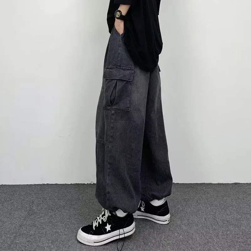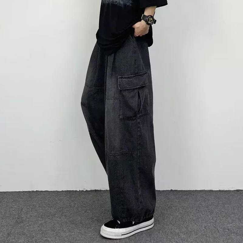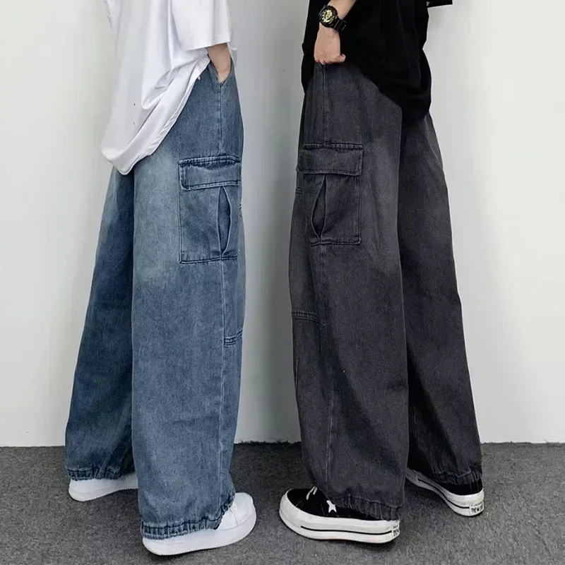 Men New Street Vintage Jeans Male Wide Leg Big Pocket Overalls Y2K Neutral Loose Straight Leg Casual High Street Hip Hop Pants