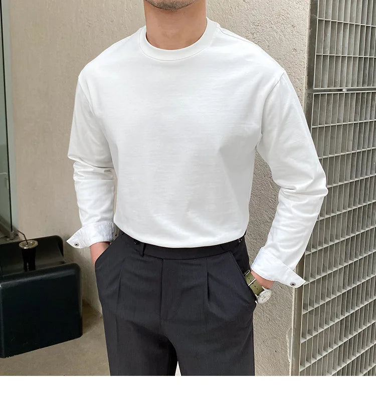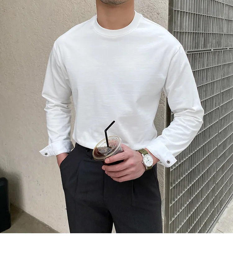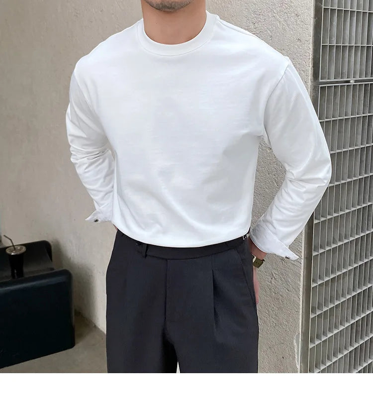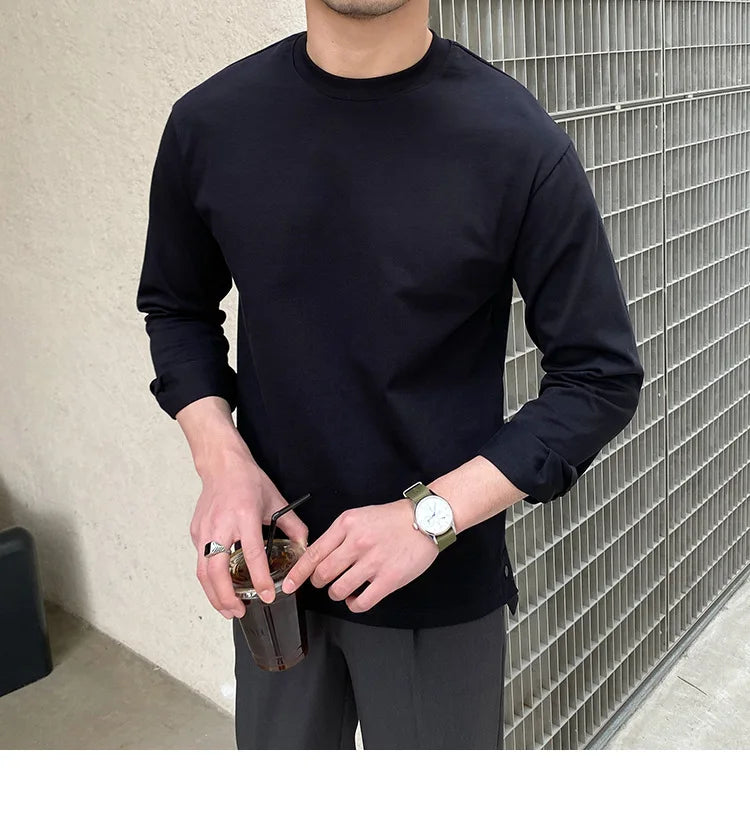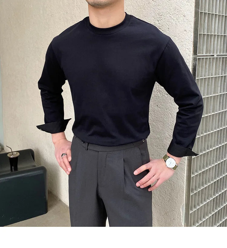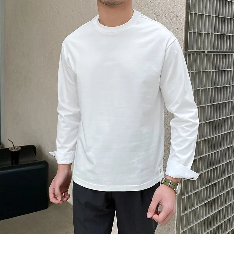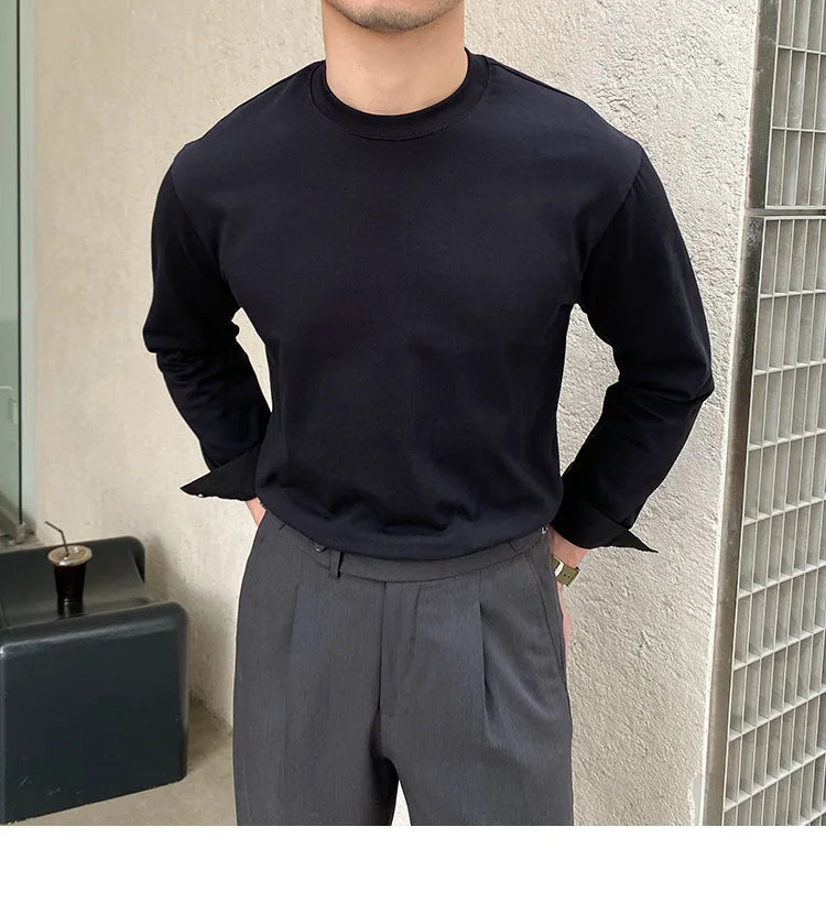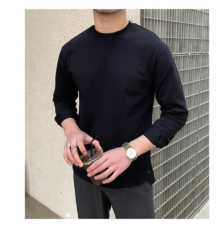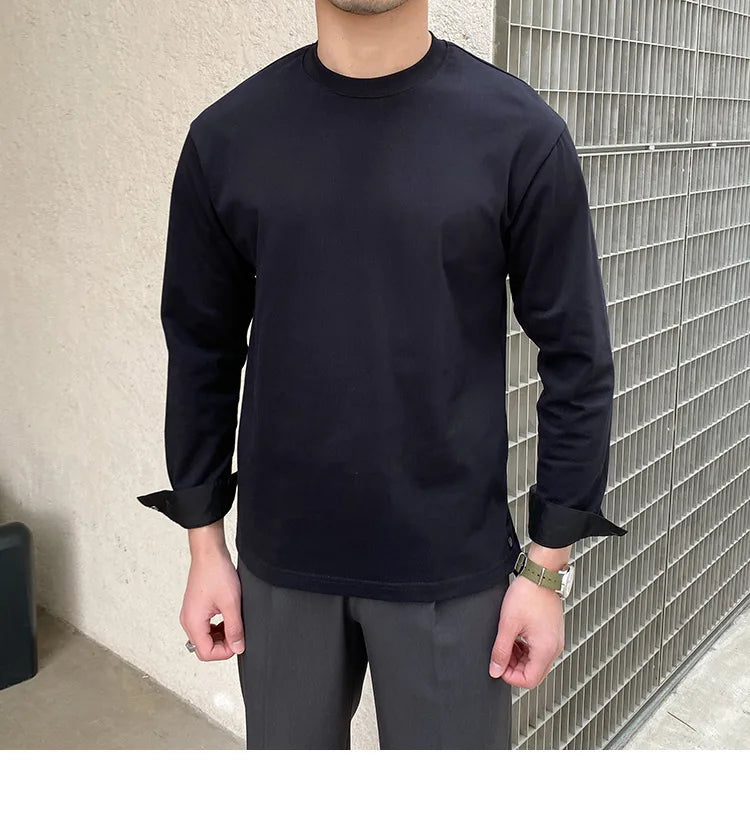 New Autumn Fashion Men T-shirt Light Luxury Solid Color Long Sleeve Tops Leisure Streetwear Casual O Neck Basic Shirts M-3XL