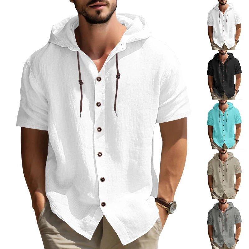 New Casual Solid Color Men's Shirt Summer Street Simple Style Hooded Drawstring Cotton Hemp Cardigan Loose Short Sleeve T-shirt