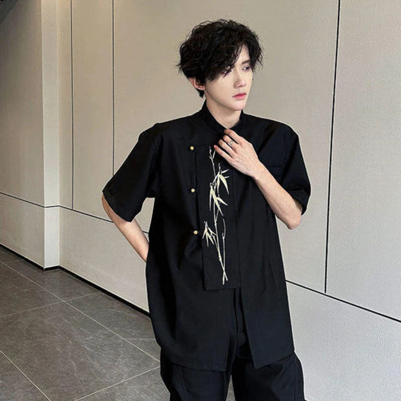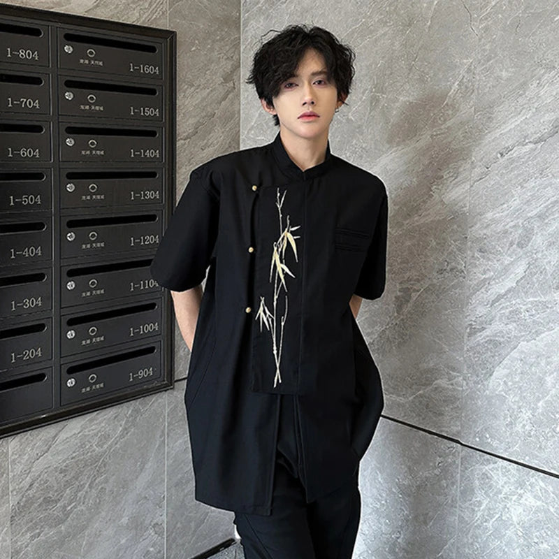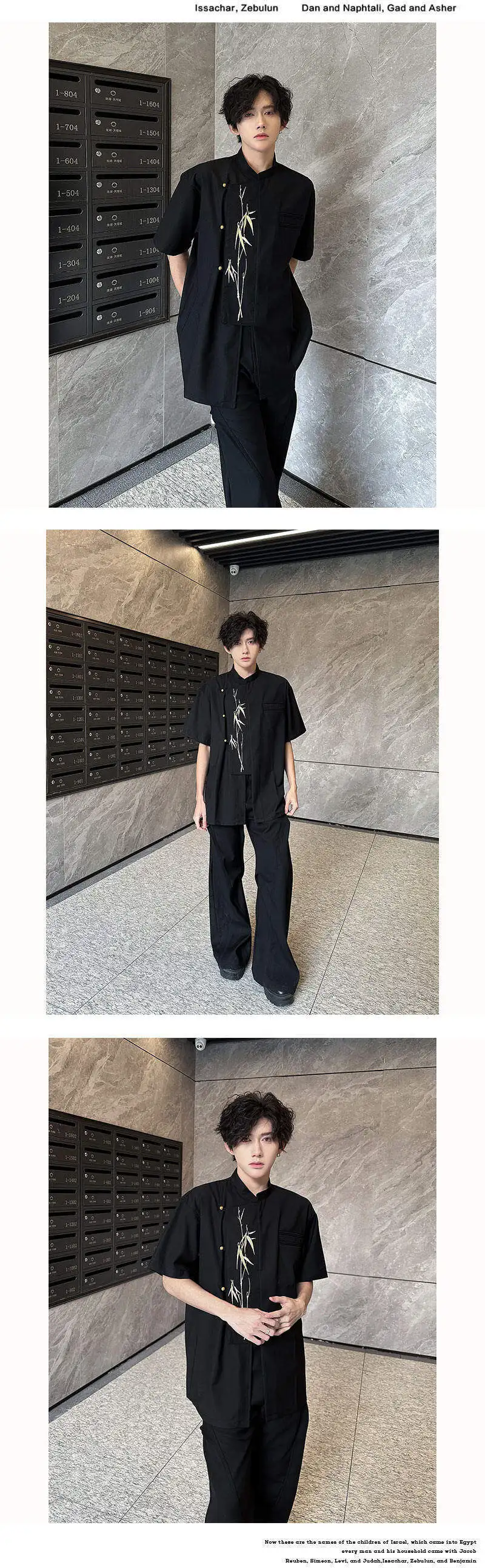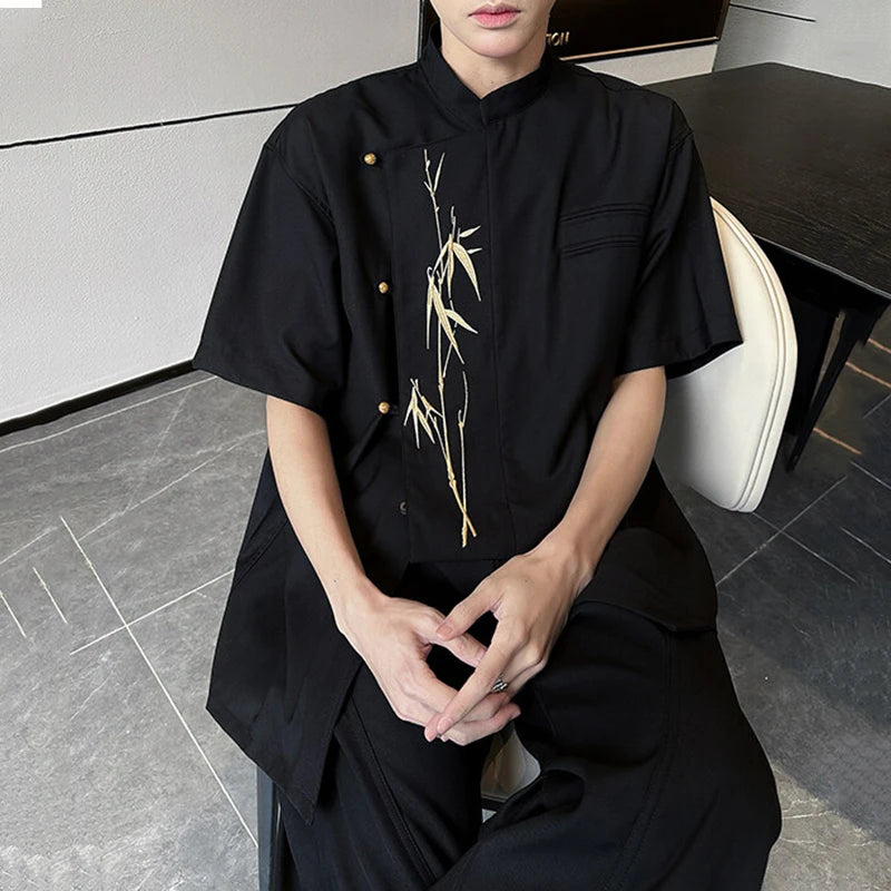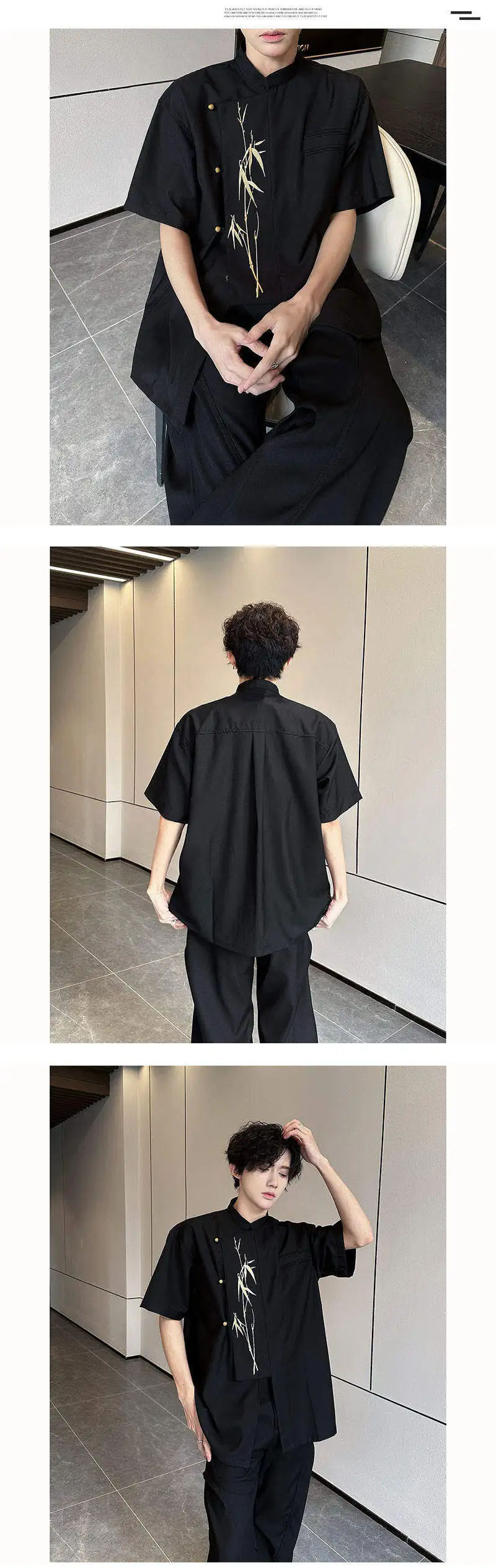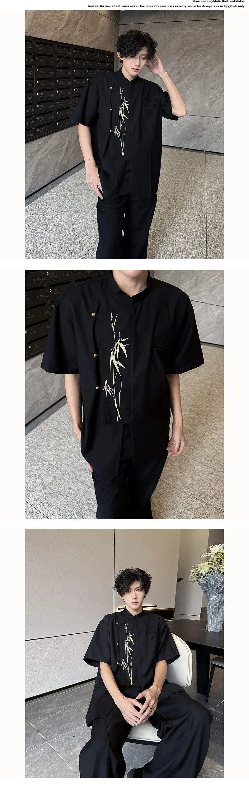 New Chinese Style Embroidery Short Sleeve Shirt Men Wear Bamboo Leaf Pattern Shoulder Pad Male Shirts Loose Fit