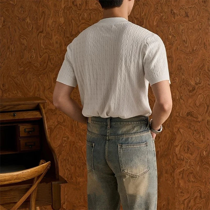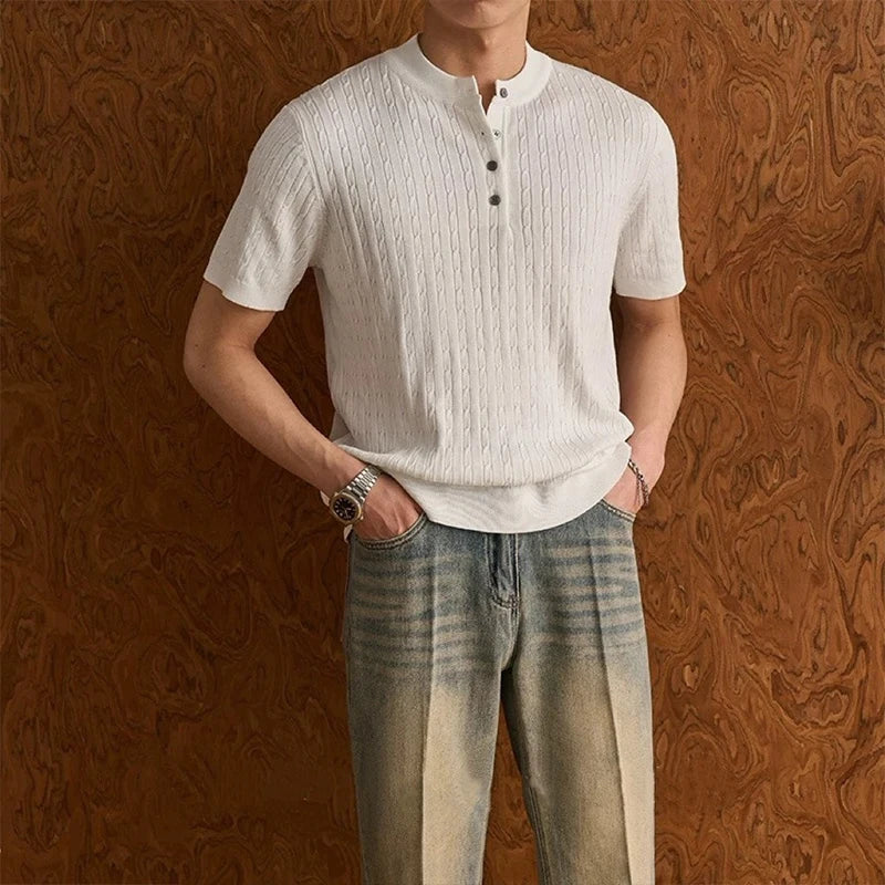 New Fashion American Style Men T-shirt Luxury Jacquard Knitted Henry Collar Tees Casual Solid Color Short Sleeve Breathable Tops