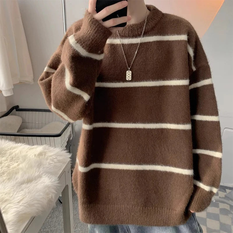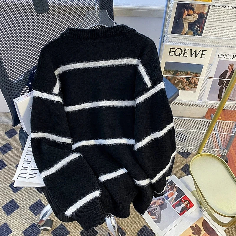 New Korean Trendy Men Sweater Light Luxury Knitted Drooping Stripe O Neck Long Sleeve Pullover Casual High Street Knitwear M-3XL