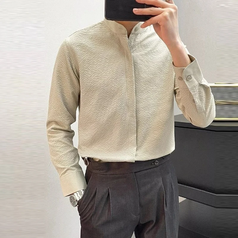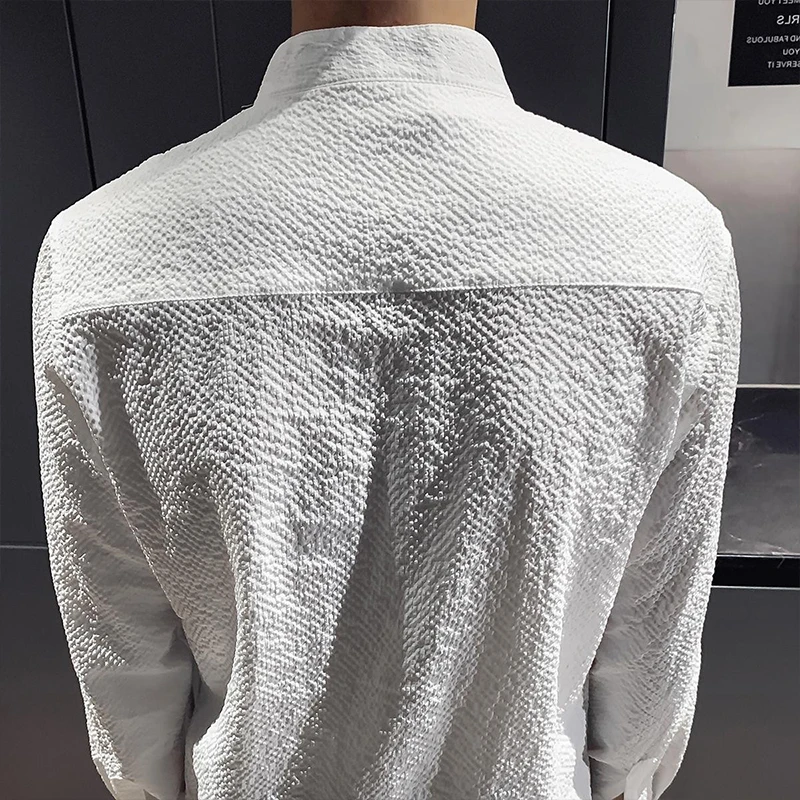 New Men Fashion Seersucker Shirts Long Sleeve Stand Collar Casual Drapped Solid Color Button-down Cardigan Japanese Style Tops