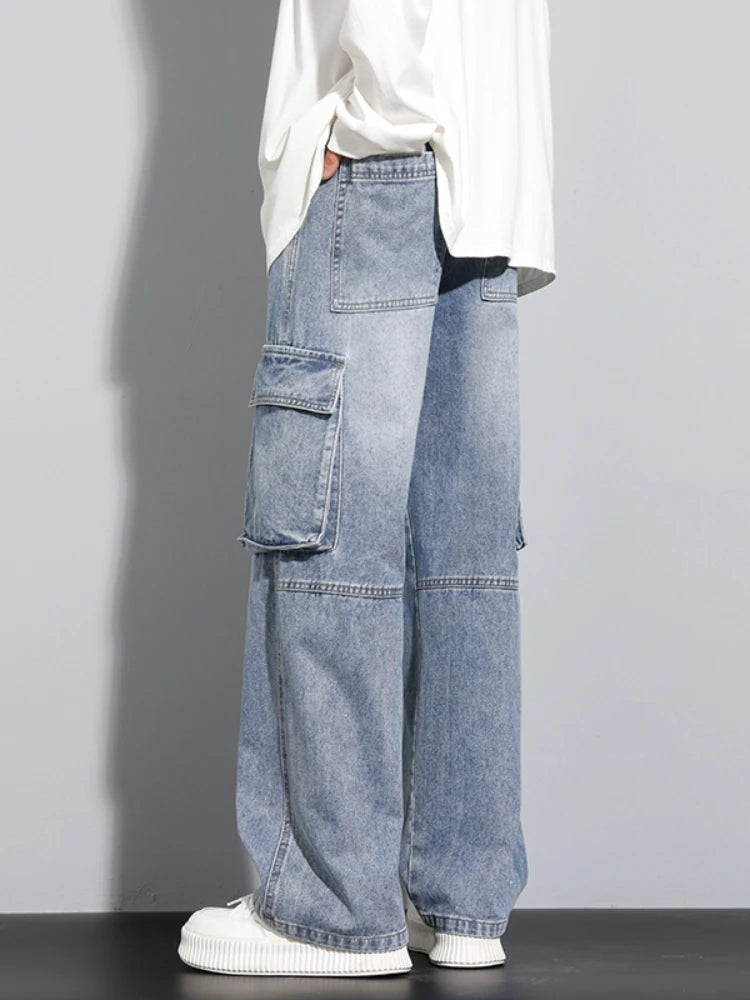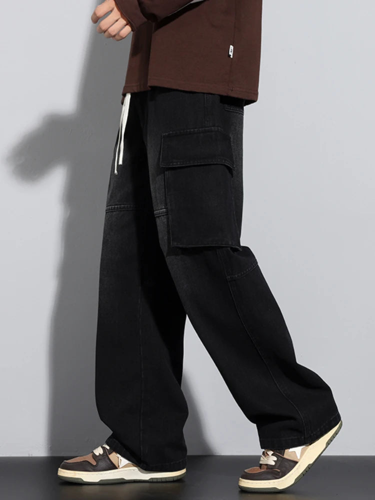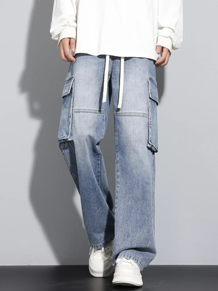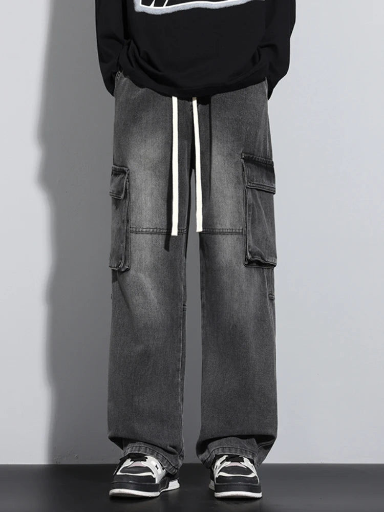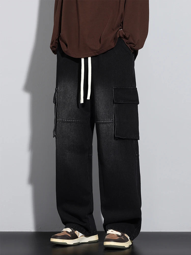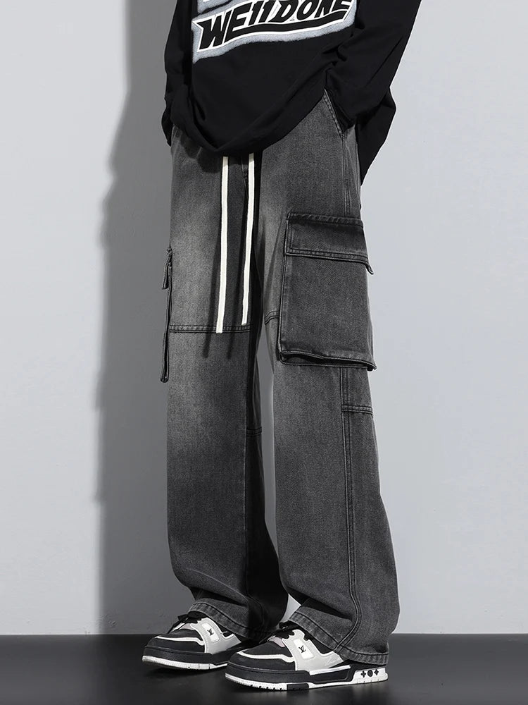 New Men's Baggy Straight Cargo Jeans Elastic Waist Vintage Blue Black Smoky gray Denim Pants Fashion High Street Male Trousers