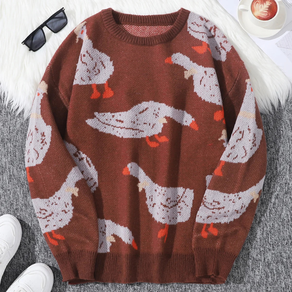 New Popular Autumn Winter Cute Duck Jacquard Pattern Pullover Sweater Casual Round Neck Contrast Color Knitted Men's Pullover