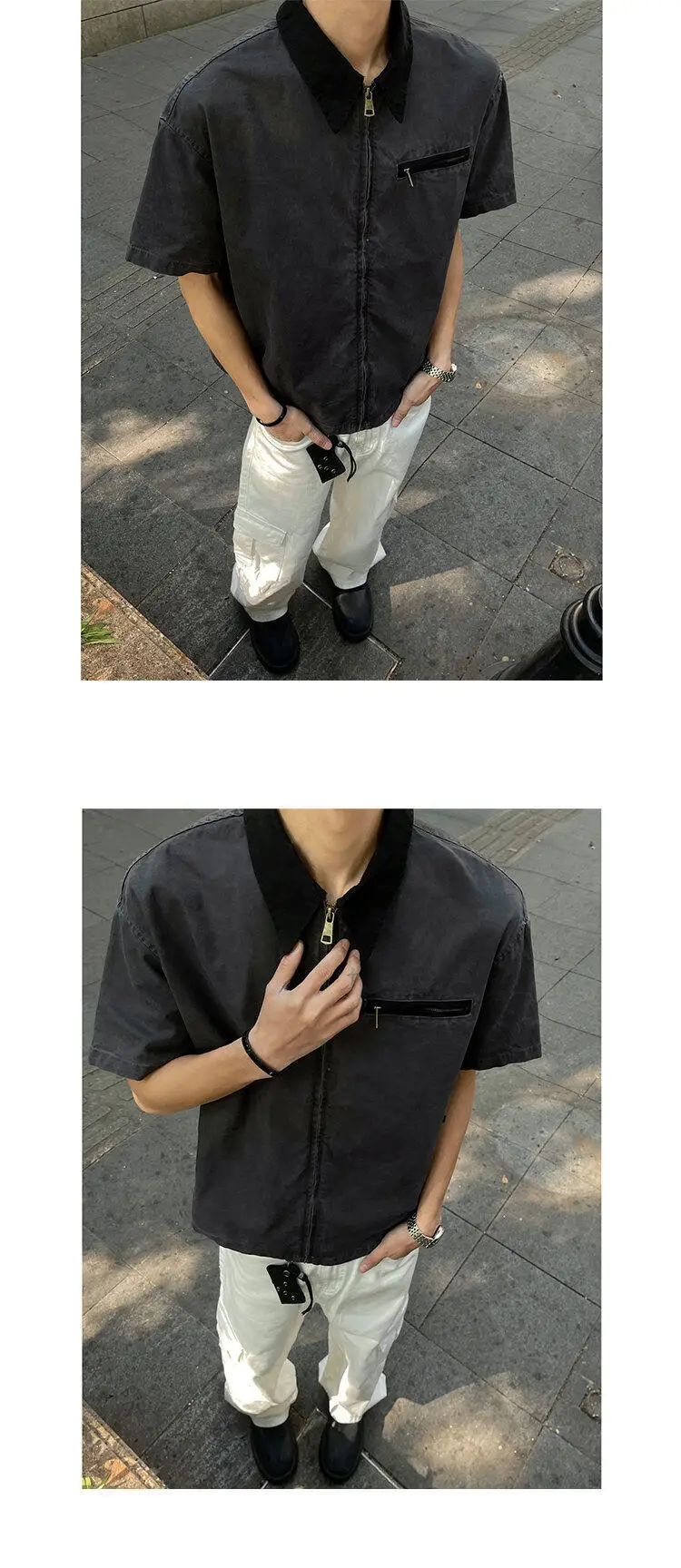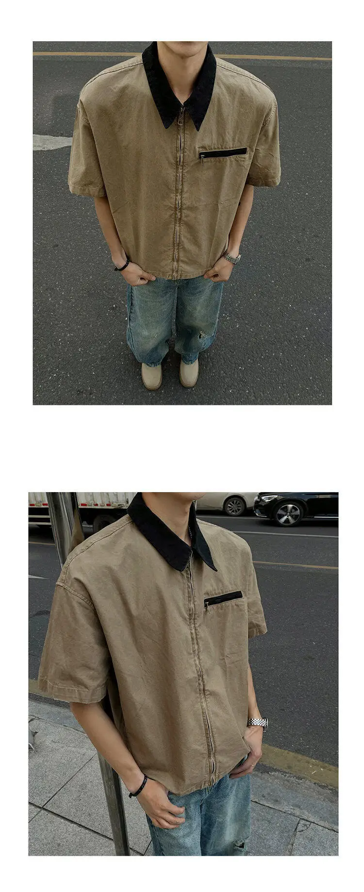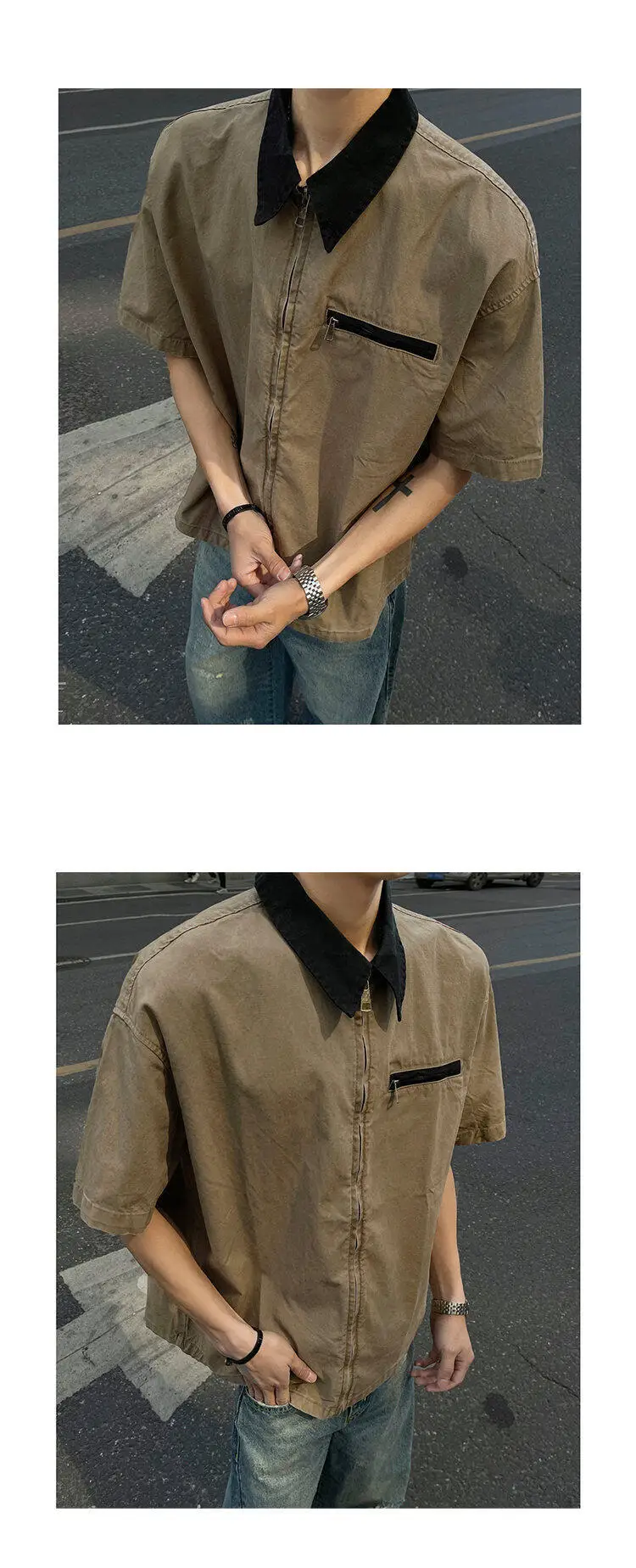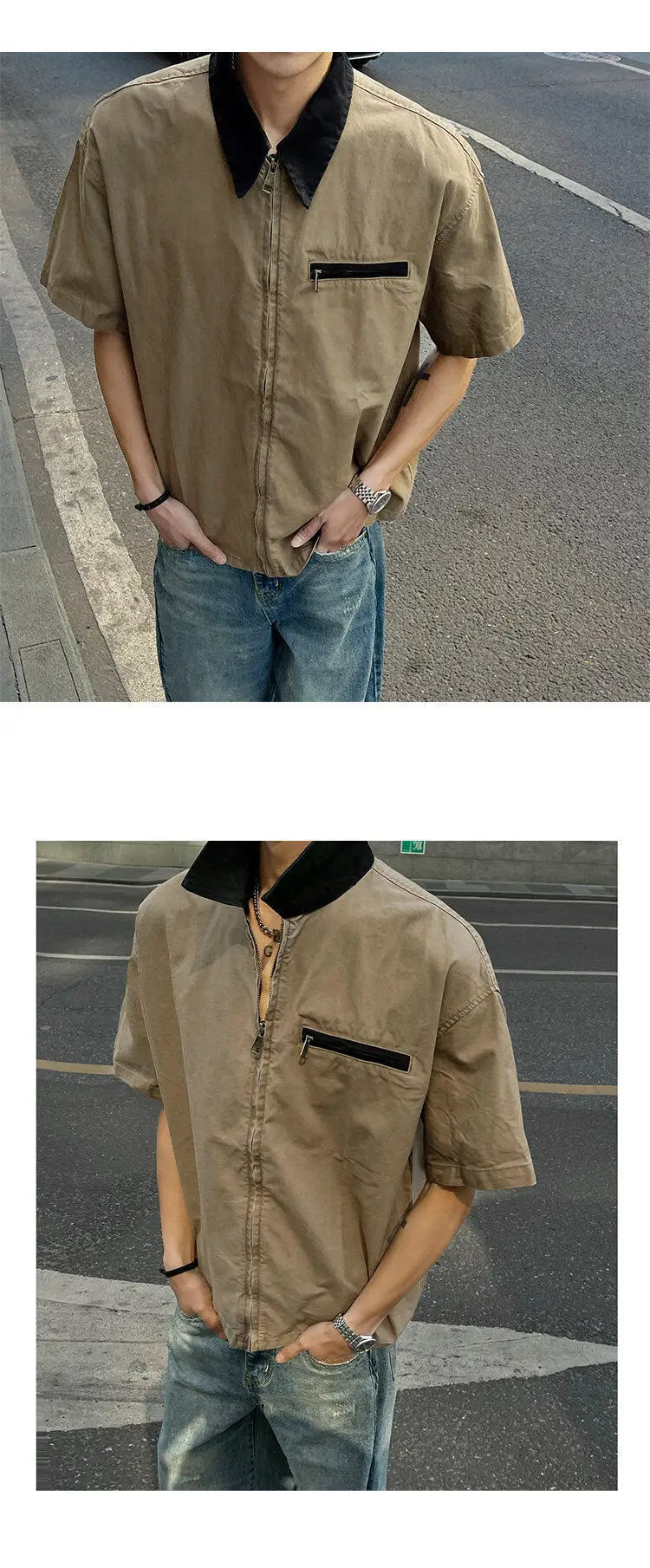 New Stylish Men's Shirt Short Sleeve Lapel Patchwork Collar Male Zipper Shirts Washed Summer Men Clothing Loose Fit