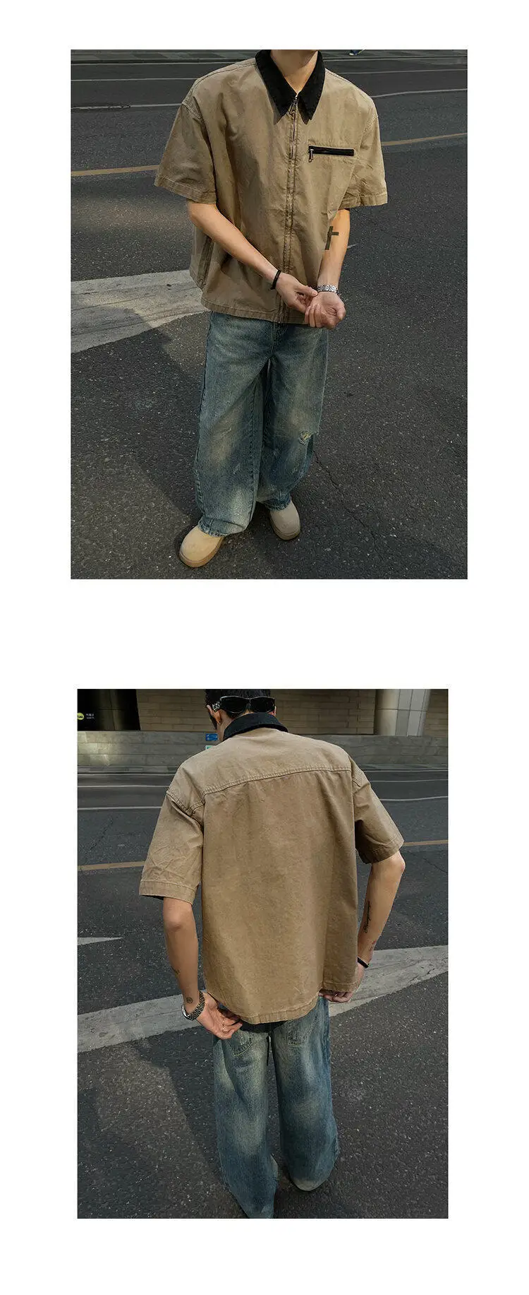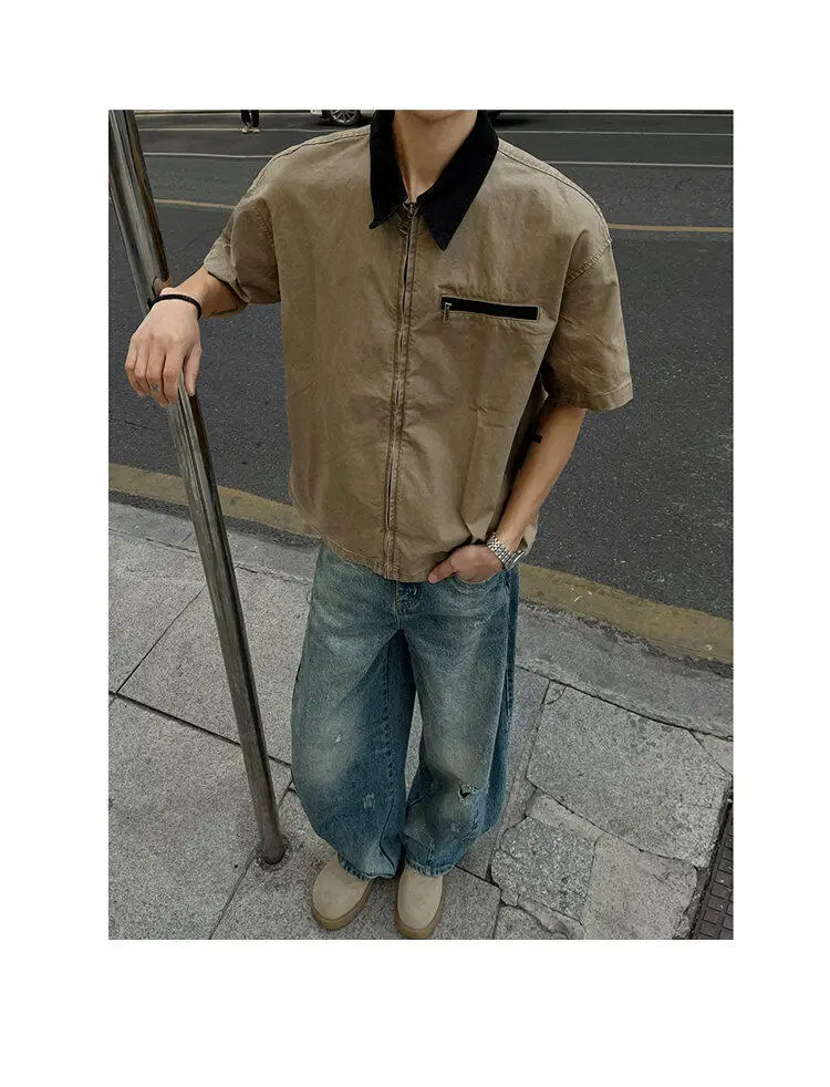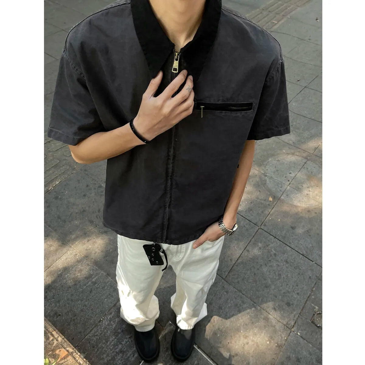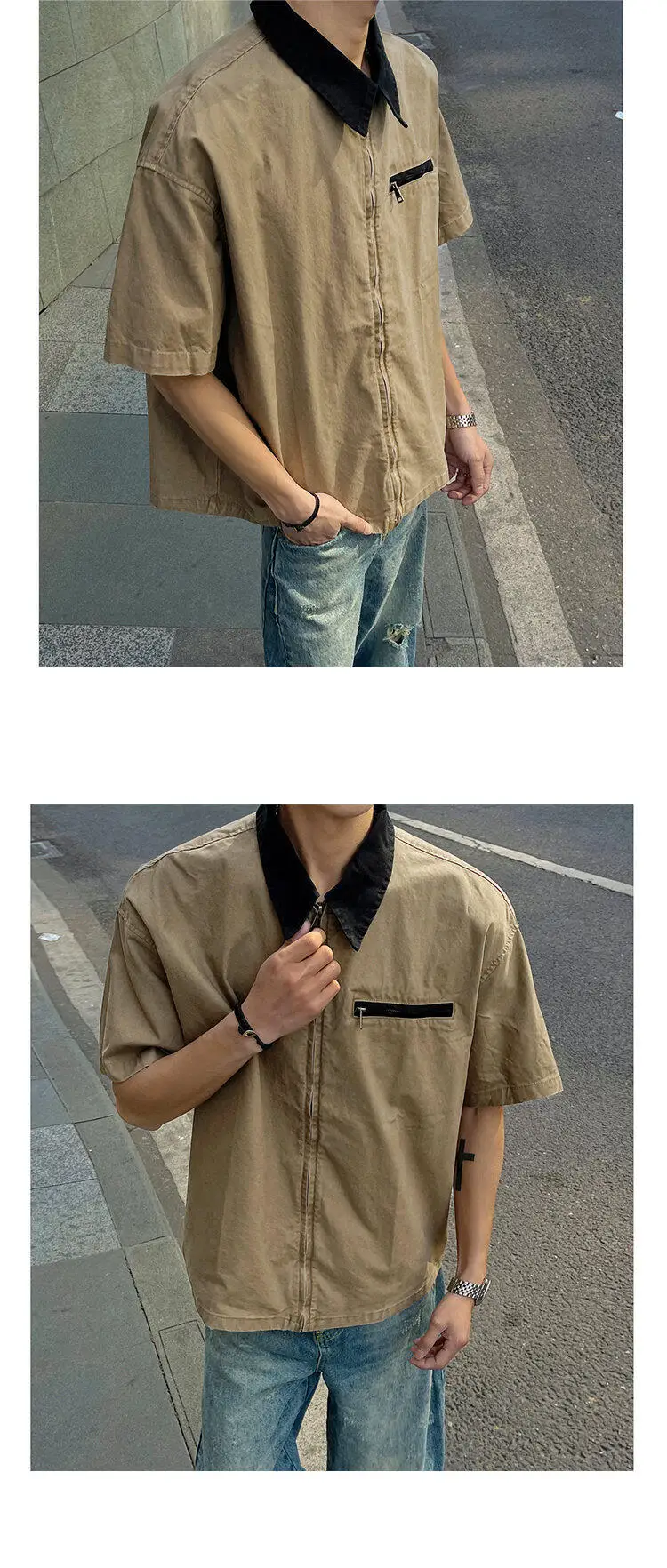 New Stylish Men's Shirt Short Sleeve Lapel Patchwork Collar Male Zipper Shirts Washed Summer Men Clothing Loose Fit