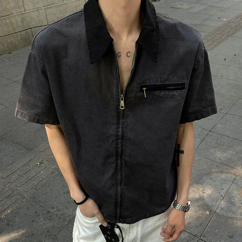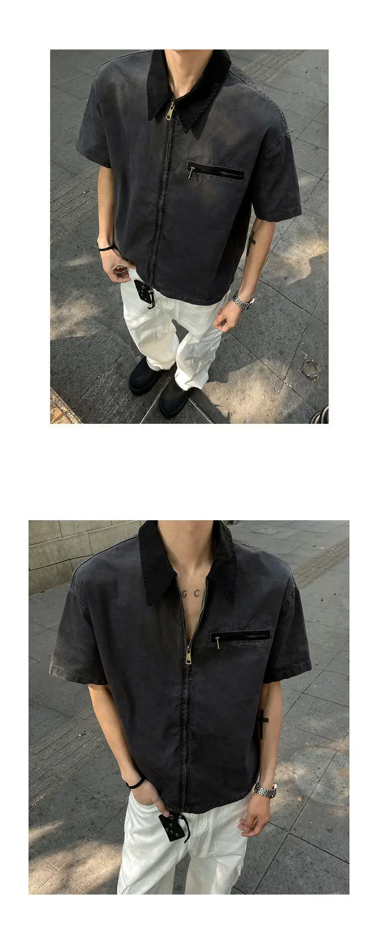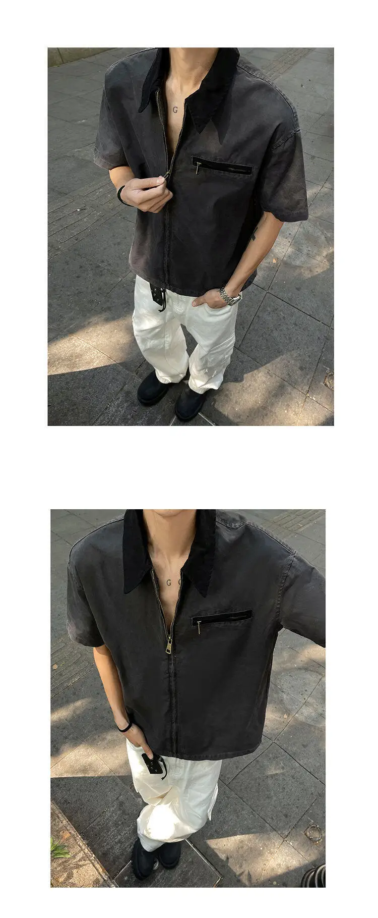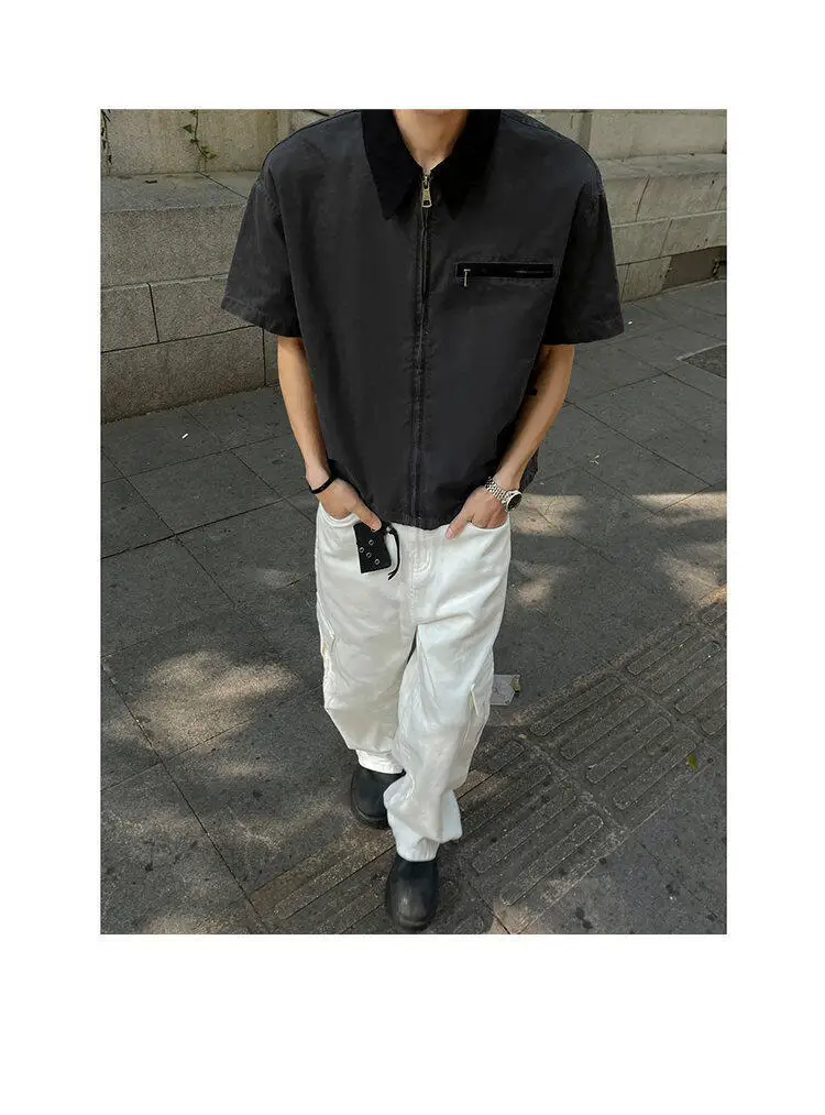New Stylish Men's Shirt Short Sleeve Lapel Patchwork Collar Male Zipper Shirts Washed Summer Men Clothing Loose Fit