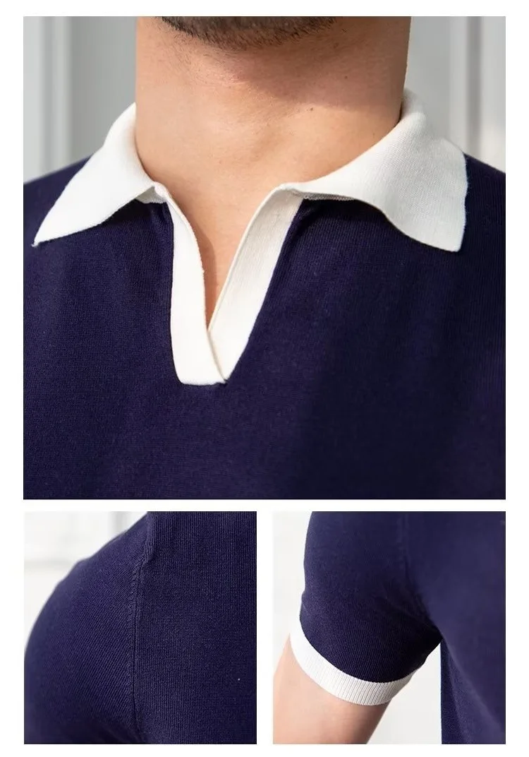 New Trend Men Business Polo Shirt Light Luxury Popular Slim V Neck T-shirt Leisure Patchwork Short Sleeve Tops Retro Knitwear
