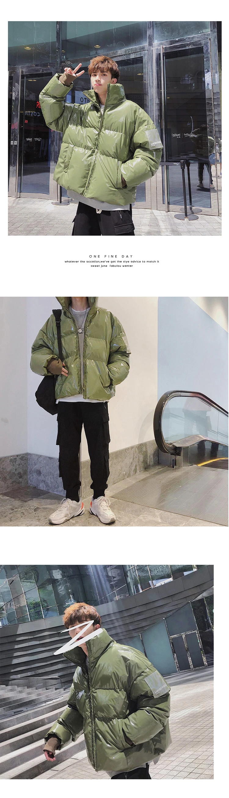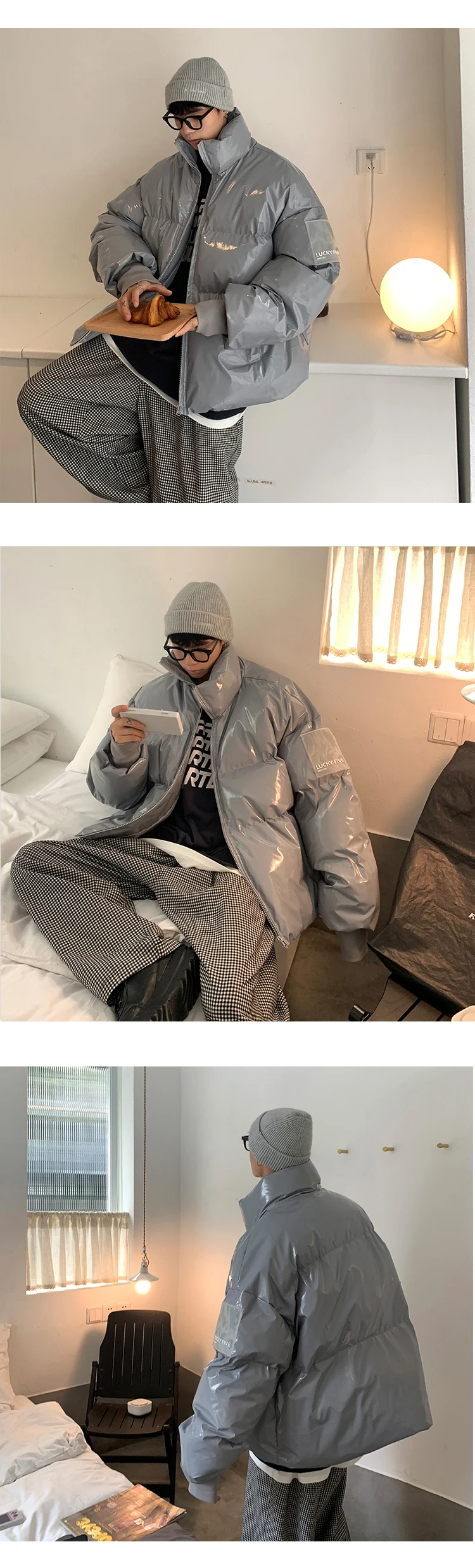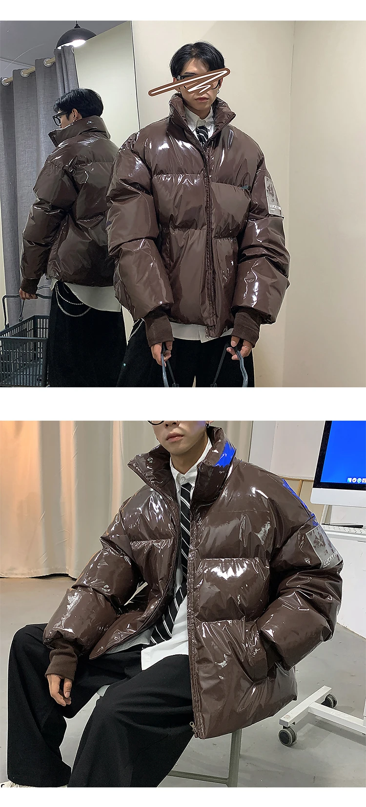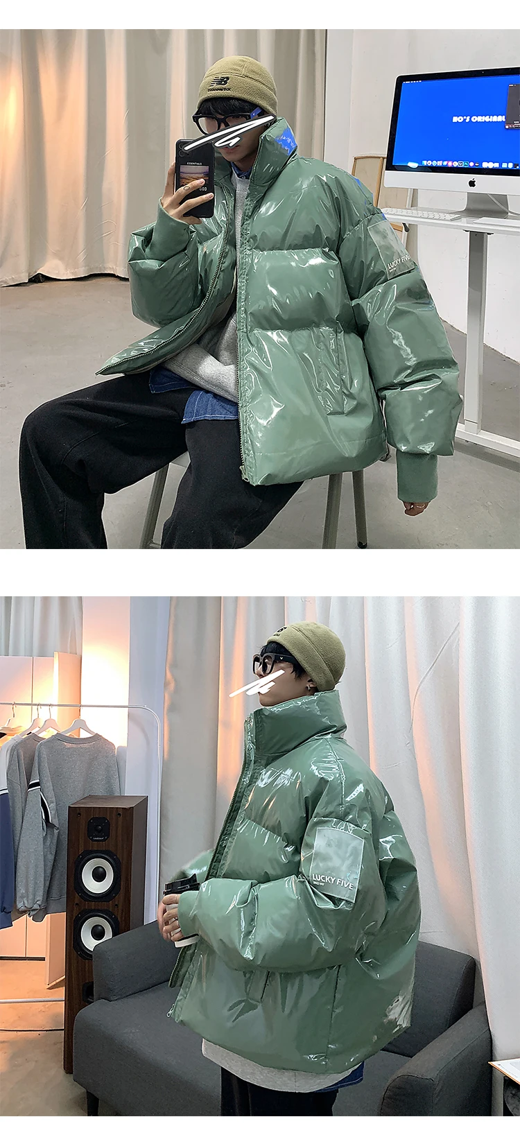 New Winter Stand Collar Loose Bright Leather Fabric Puffer Jacket Men Couple Thick Warm Cotton Padded Coat Men's Warm Parkas