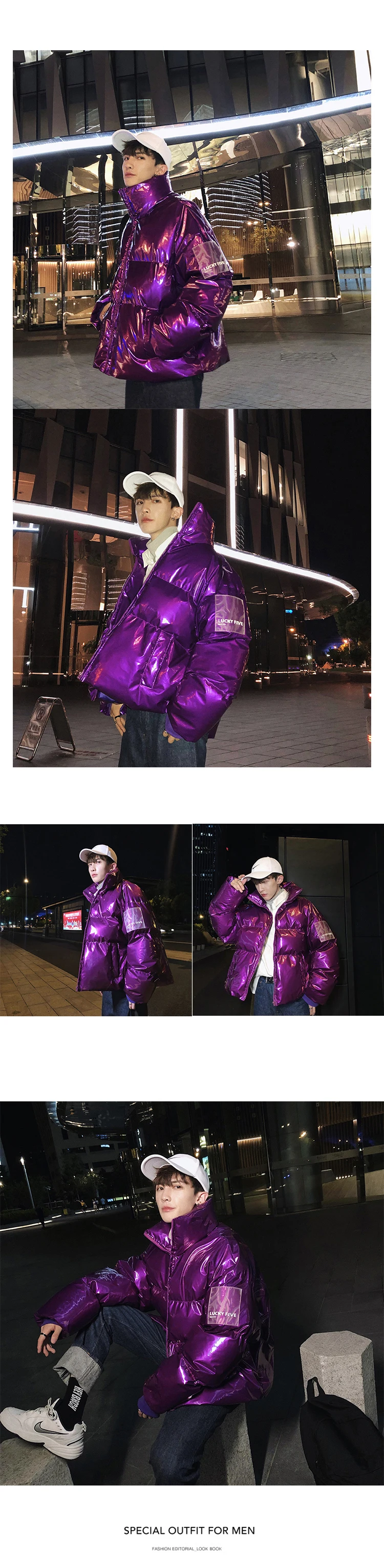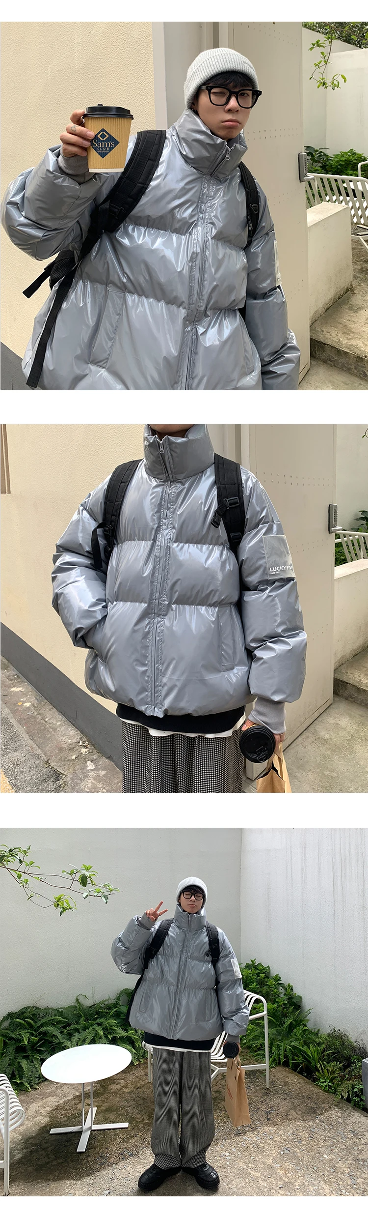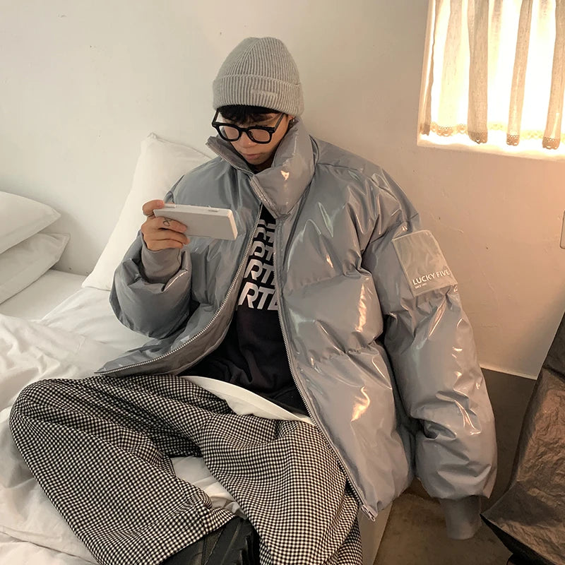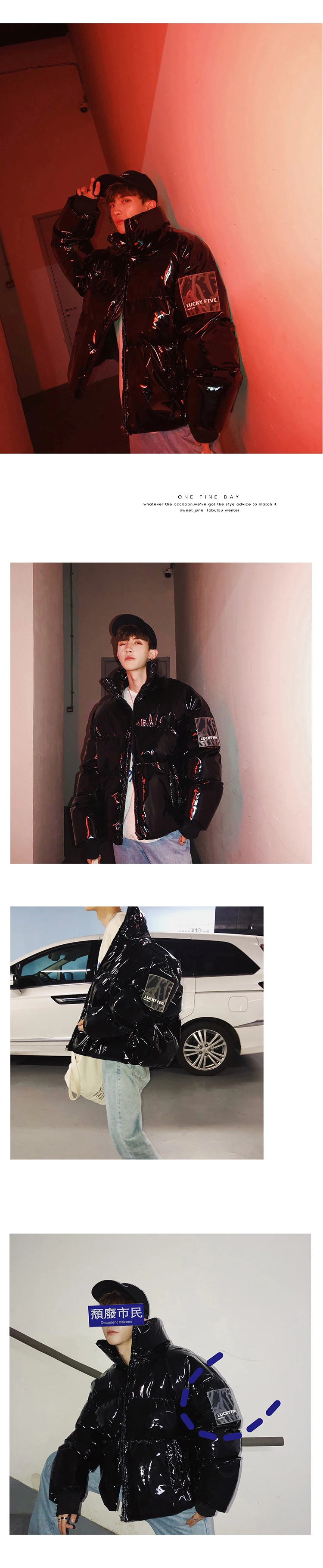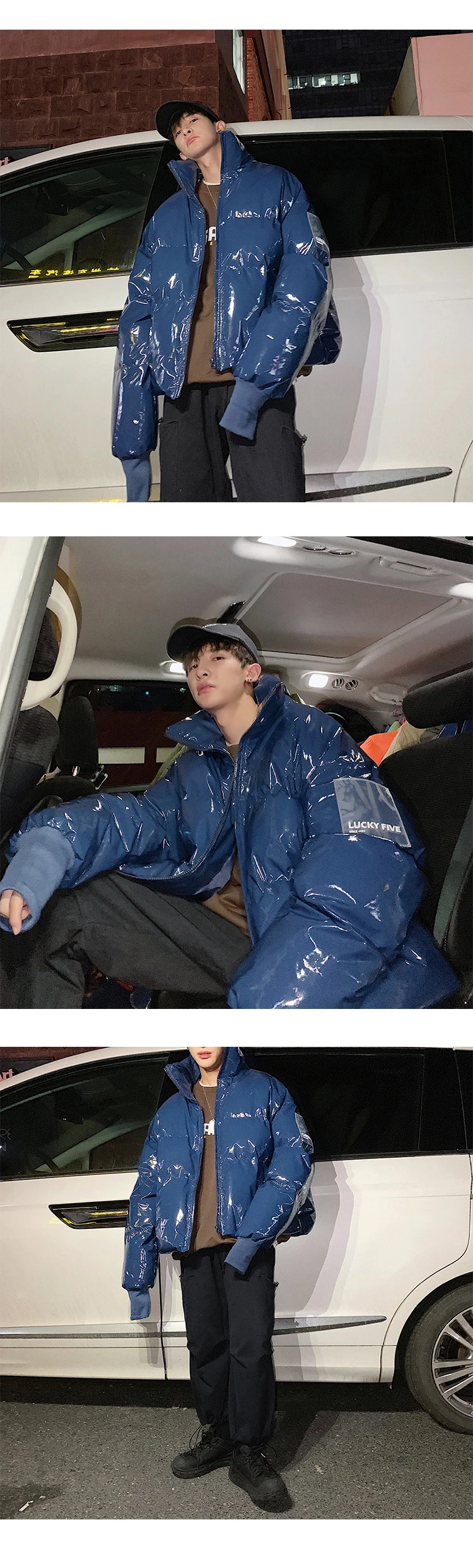 New Winter Stand Collar Loose Bright Leather Fabric Puffer Jacket Men Couple Thick Warm Cotton Padded Coat Men's Warm Parkas