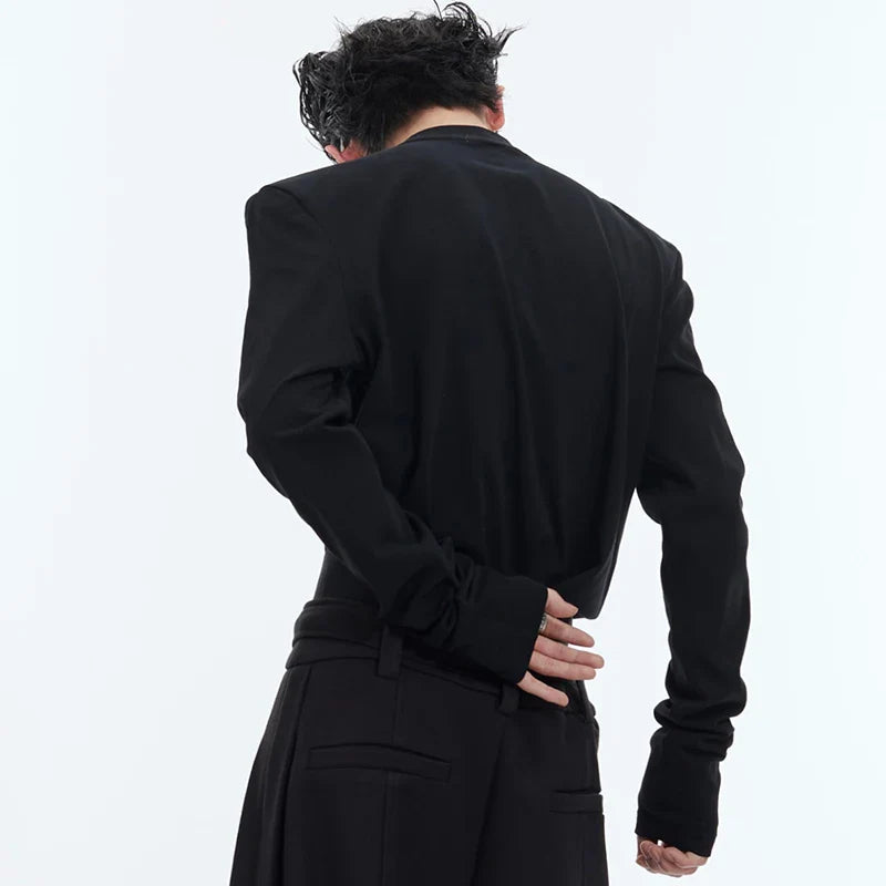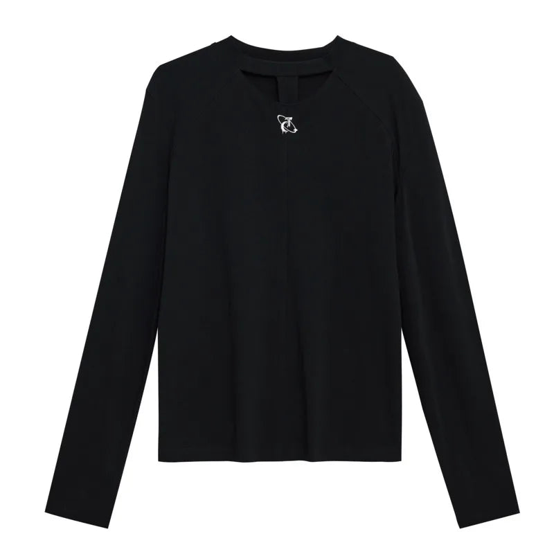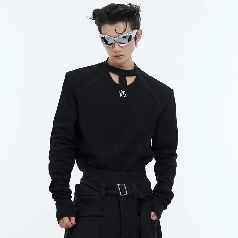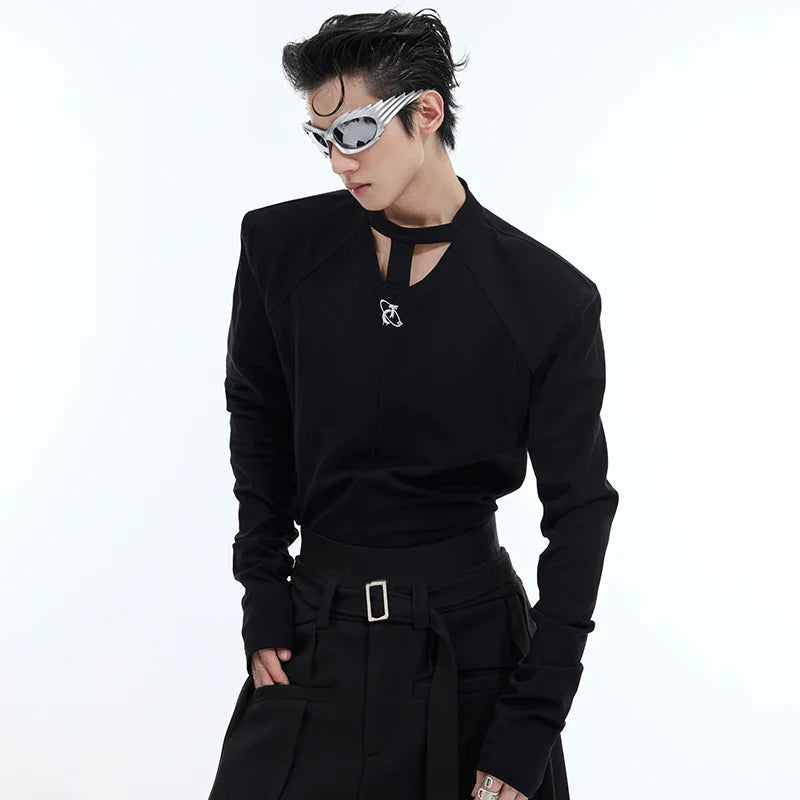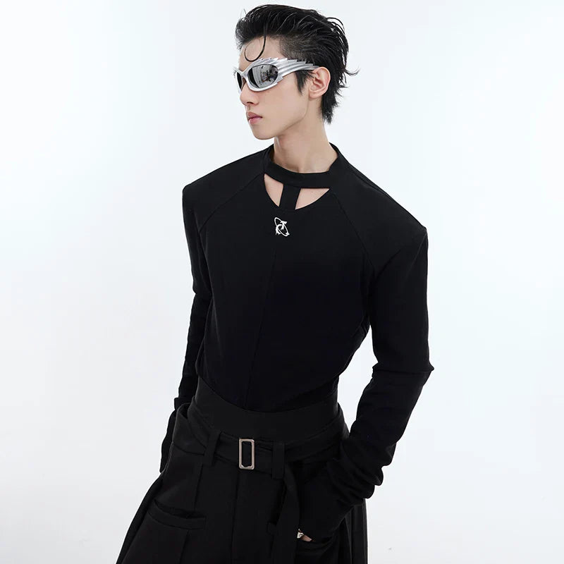 Round Collar Male T-shirt Personalized Hollow Out Shoulder Design Solid Color Slim Men's Long Sleeve Tops Spring New