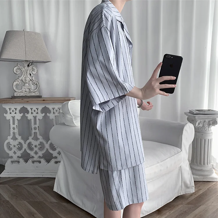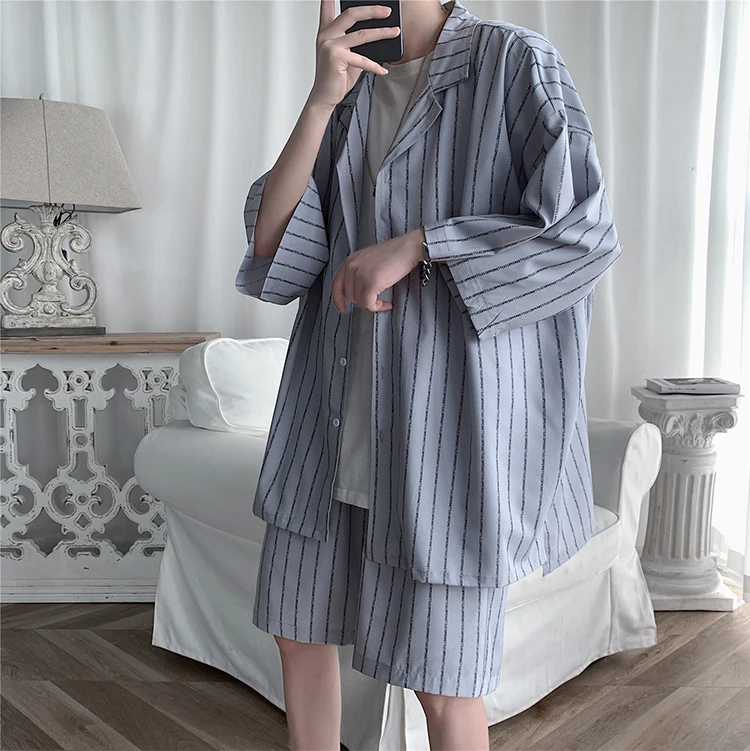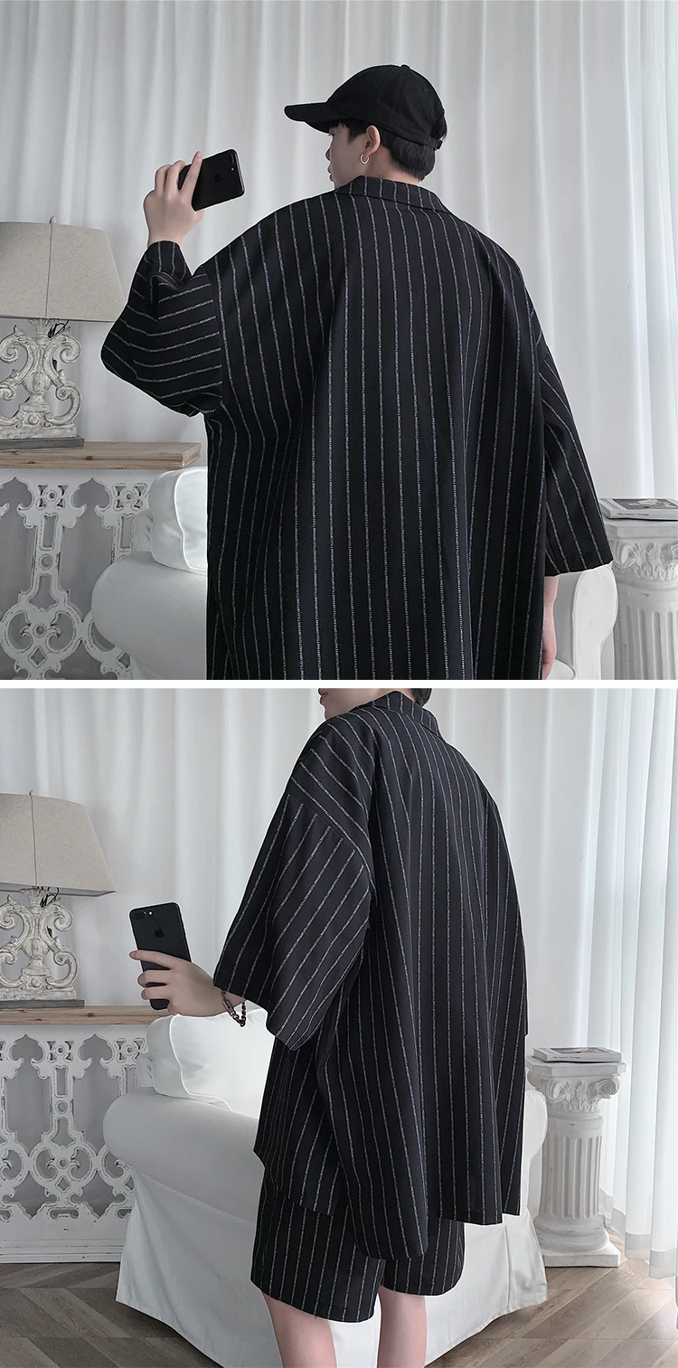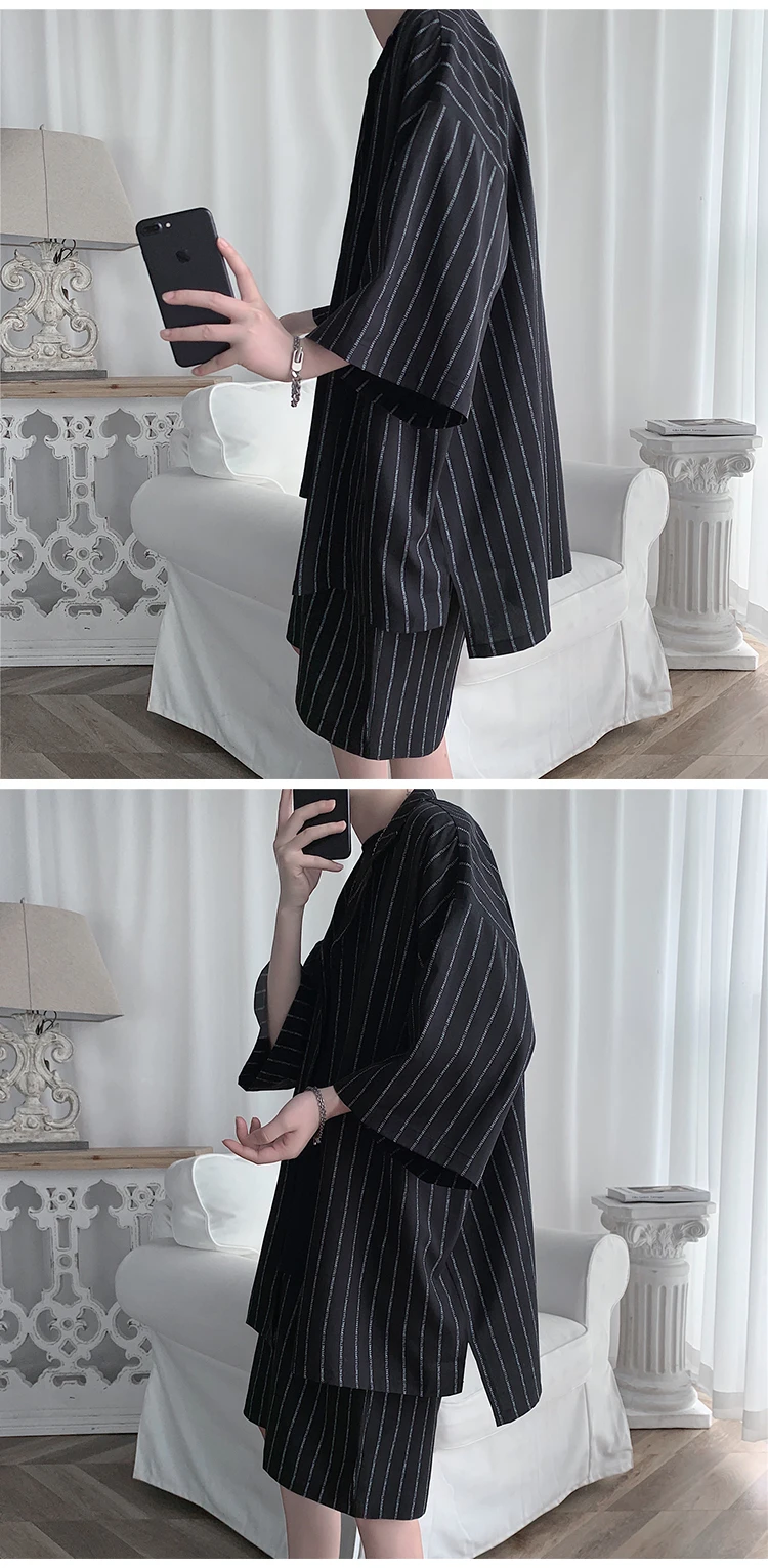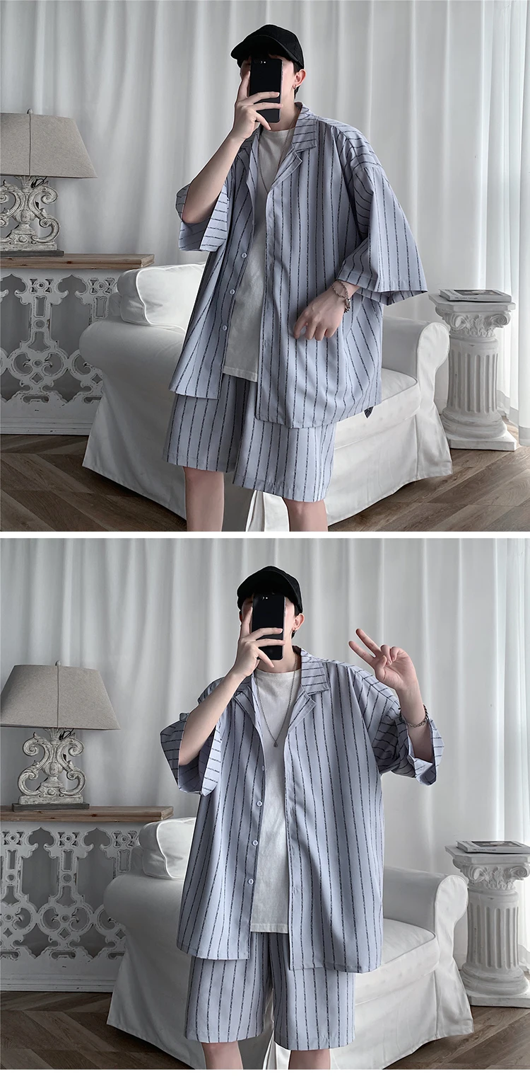 Shirts Shorts Sets Men Striped Design Simple Fashion Ulzzang Oversize Summer New Popular Loose Breathable Student Notched Casual