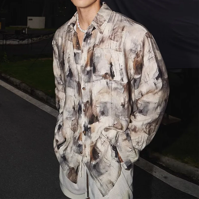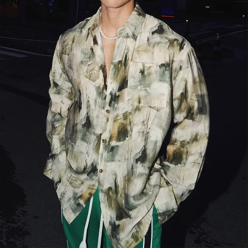 Spring New Casual Mens Long Sleeve Shirt Vacation Beach Leisure Breathable Shirts For Men Stylish Tie-dye Printing Shirts