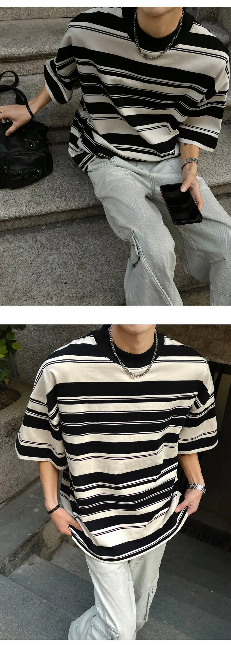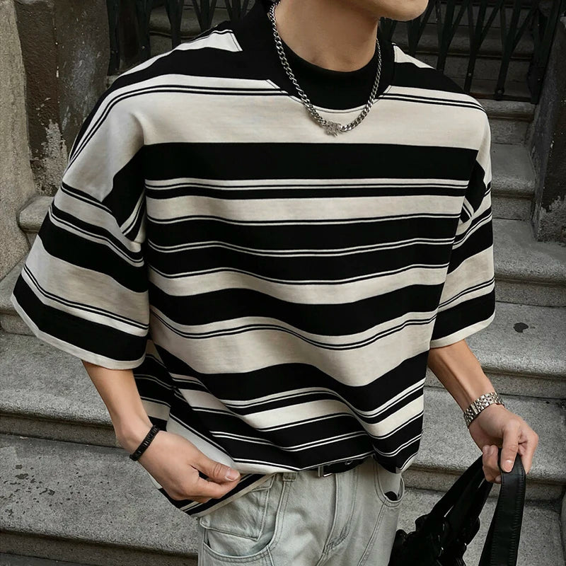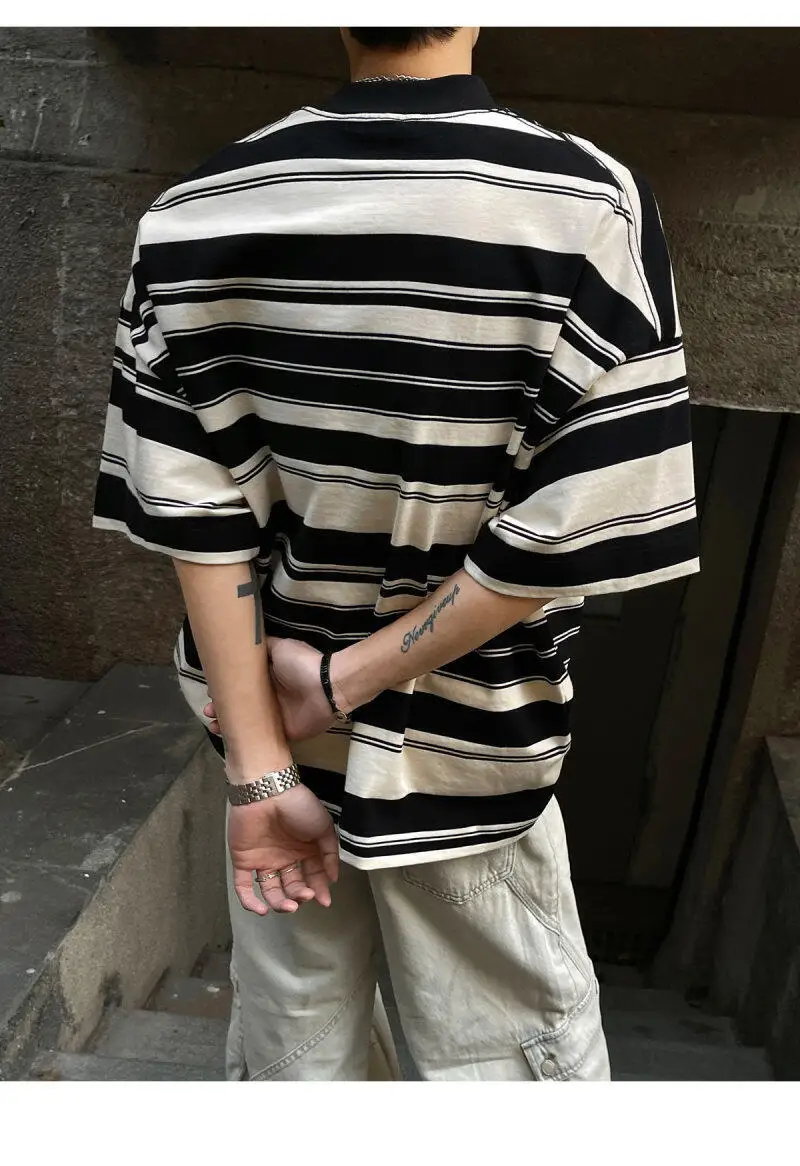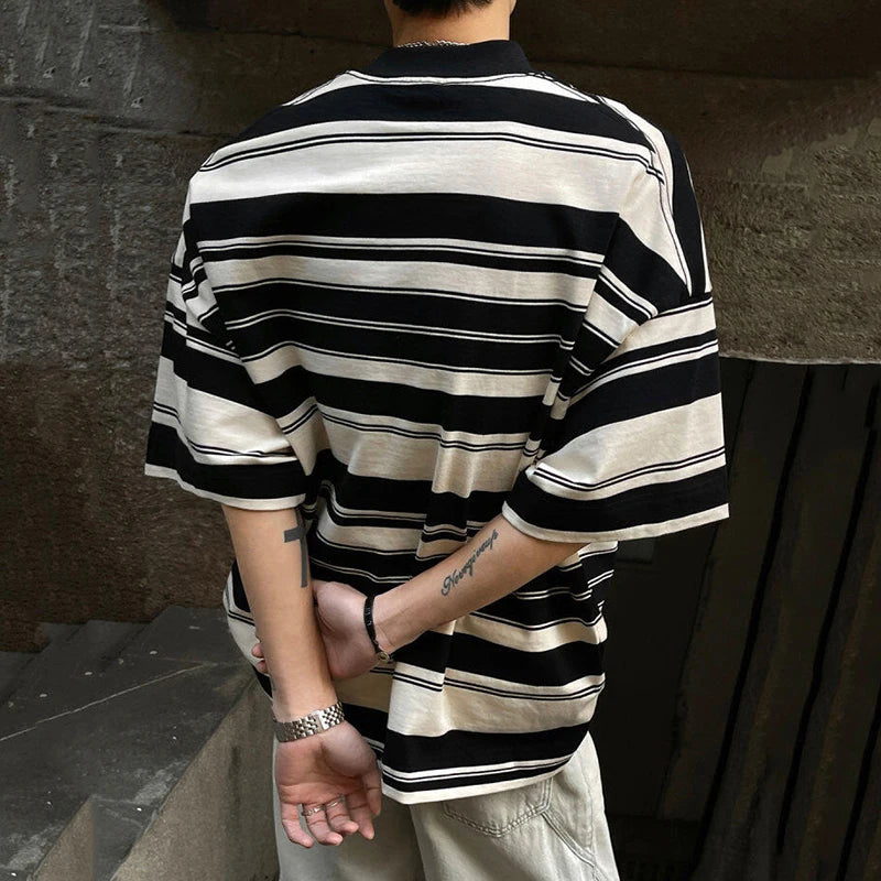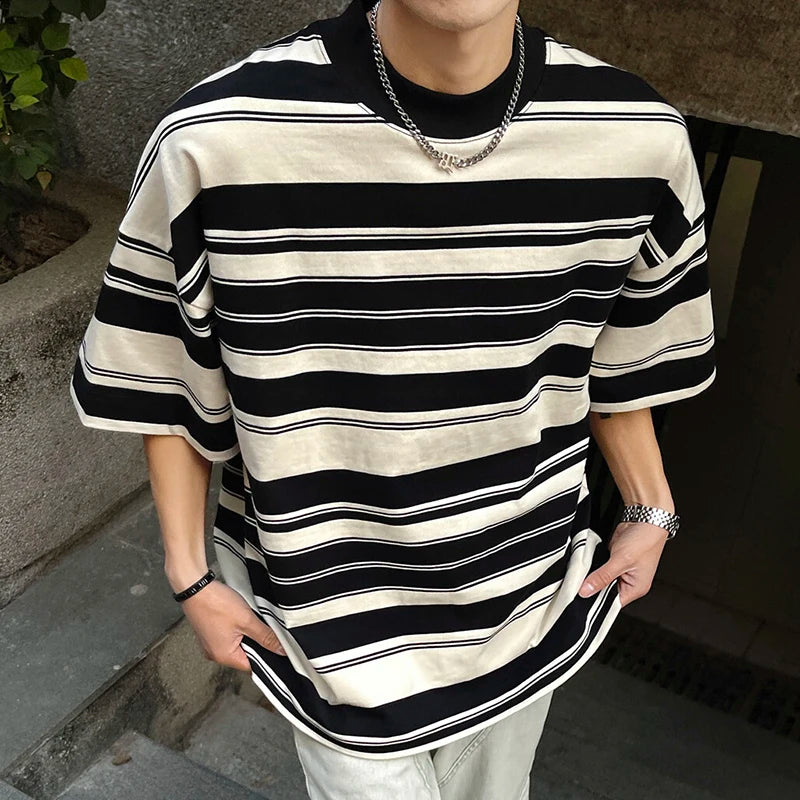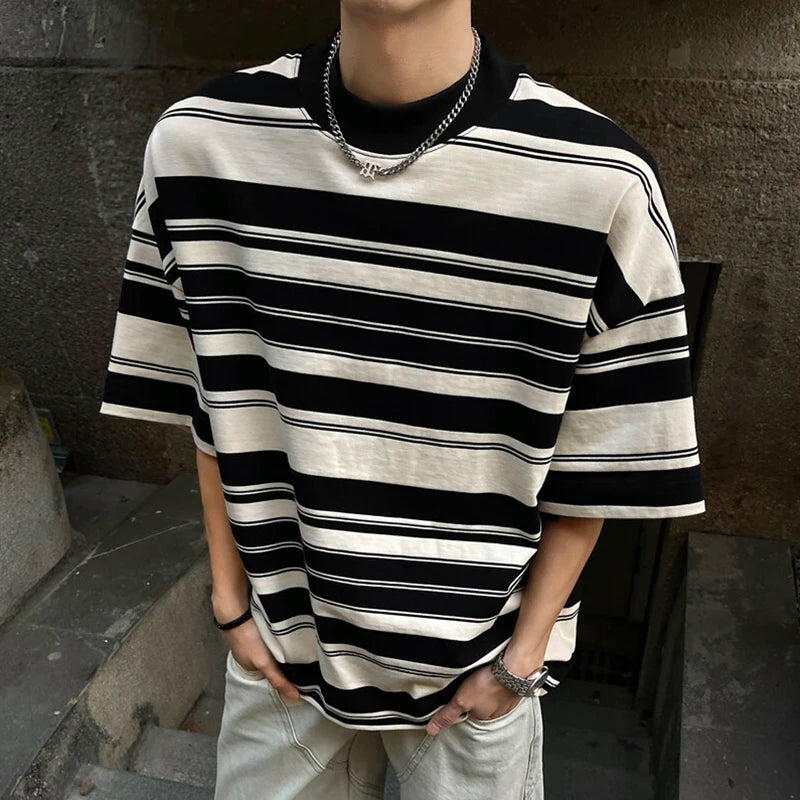 Summer New Male Striped T-shirt Half Turtleneck Loose Short Sleeve Contrast Color O-neck Pullover Male Tees 2025