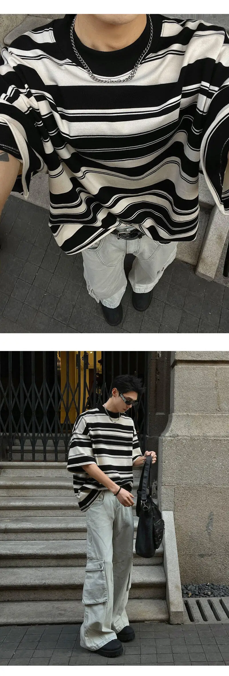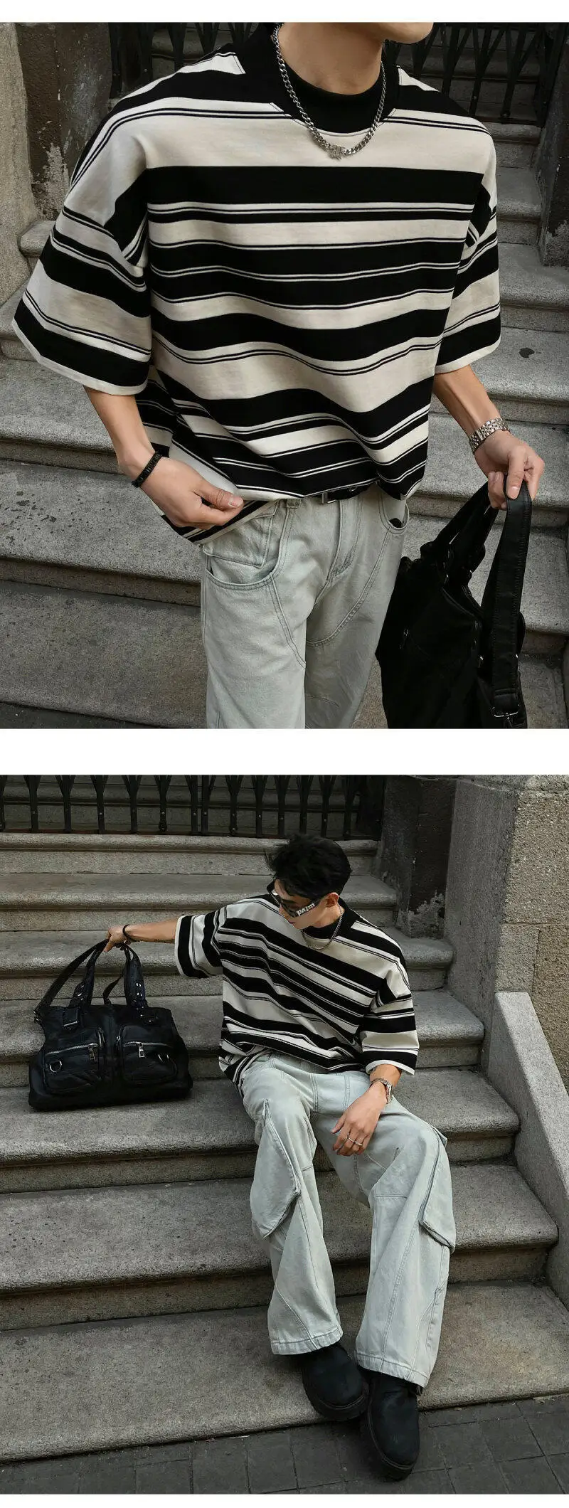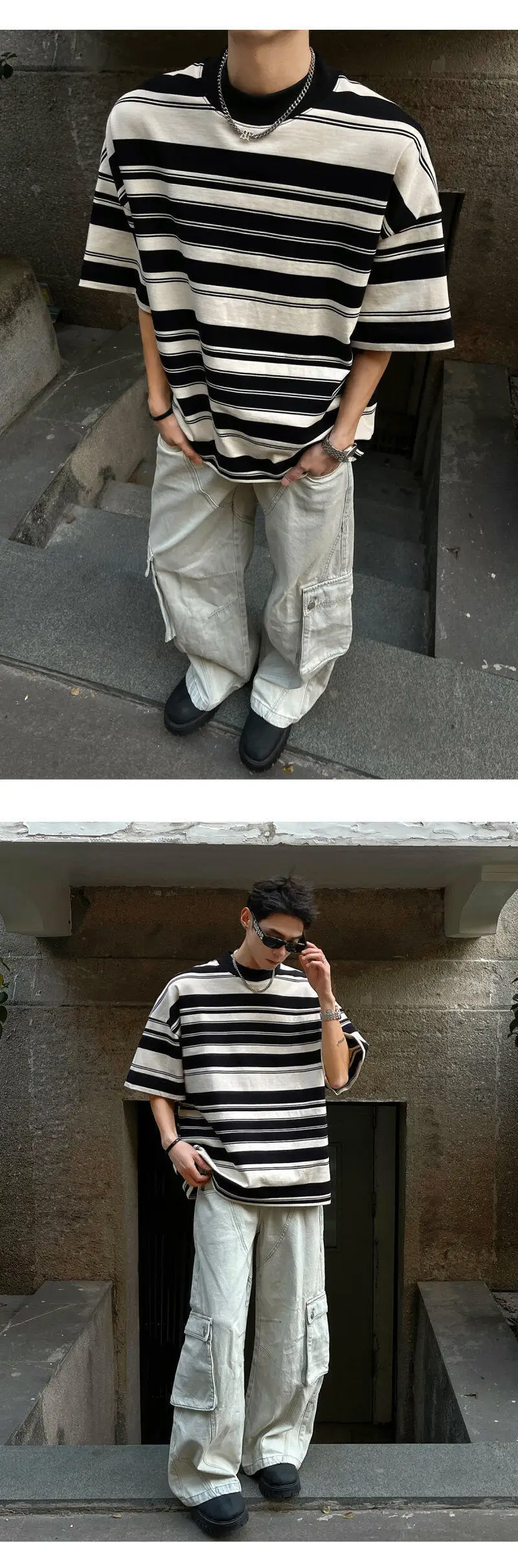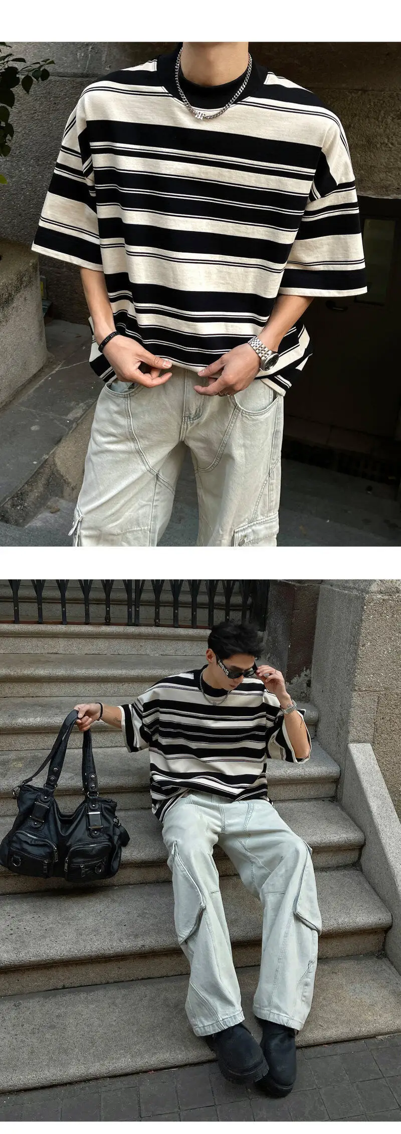 Summer New Male Striped T-shirt Half Turtleneck Loose Short Sleeve Contrast Color O-neck Pullover Male Tees 2025