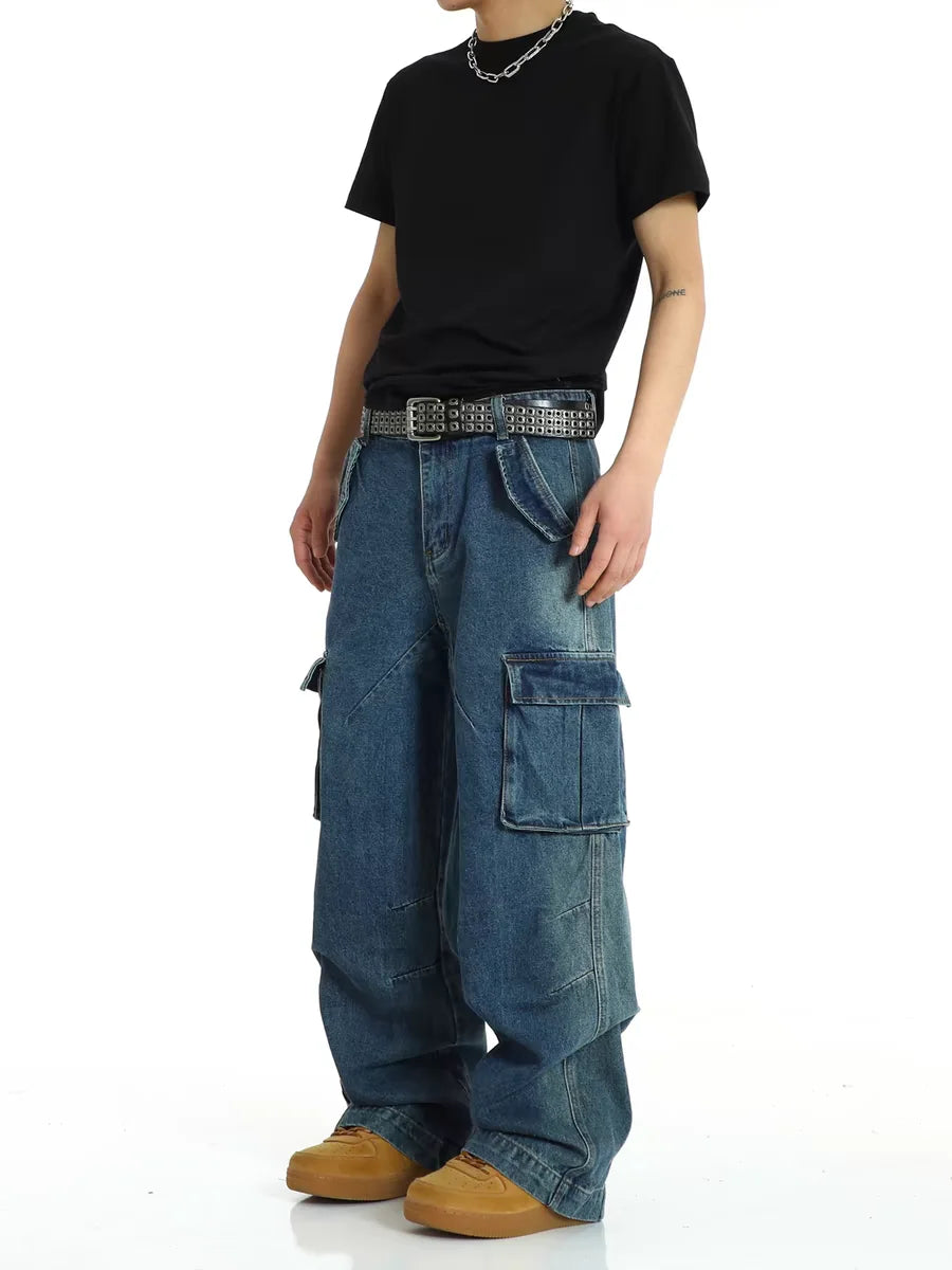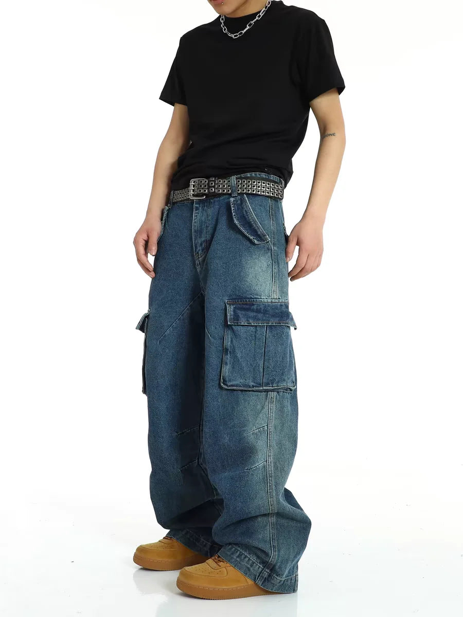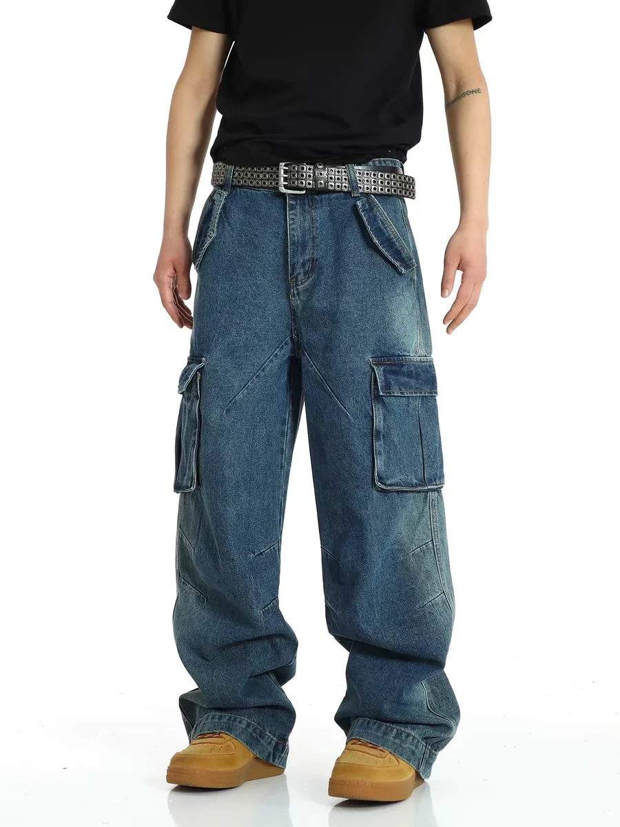 Vintage Men's Baggy Denim Trousers New Big Pocket Y2K Harajuku High Street Hip Hop Jeans Casual Stretch Fabric Denim Pants