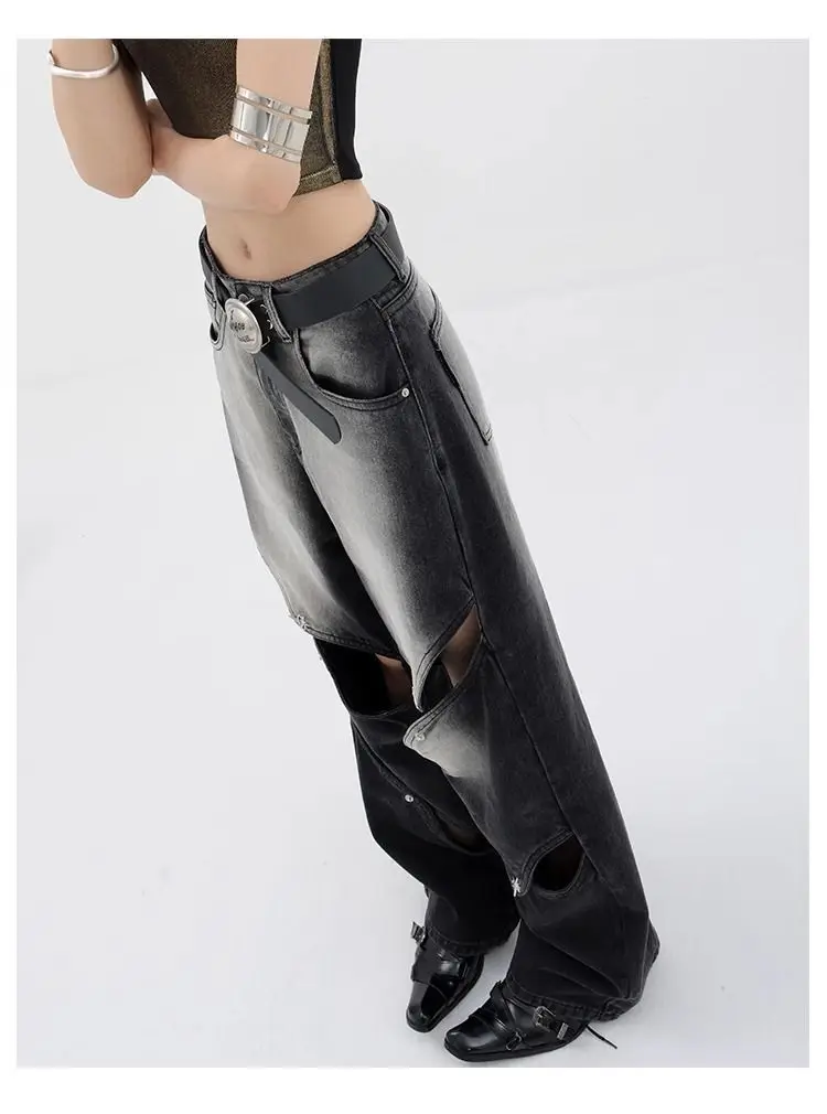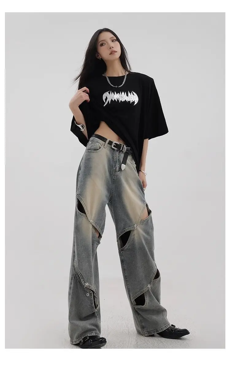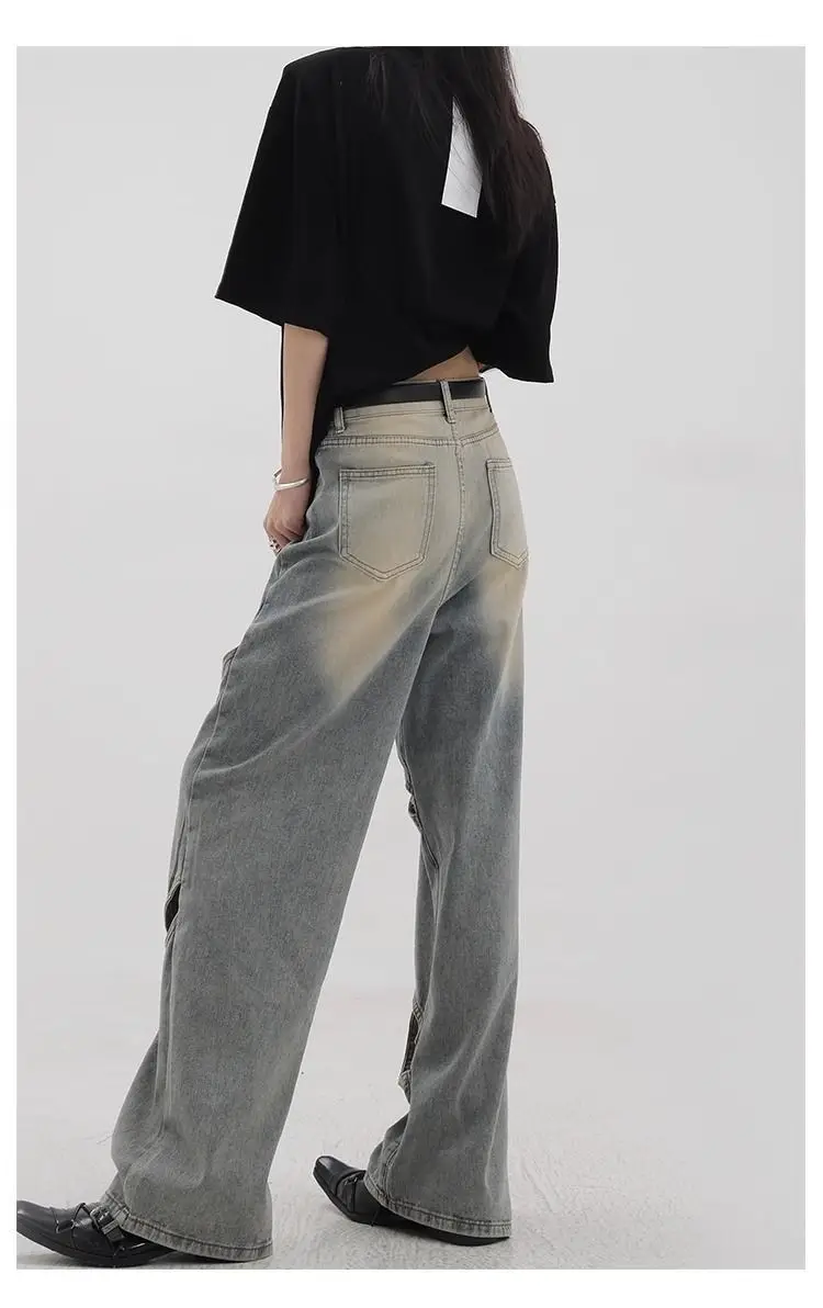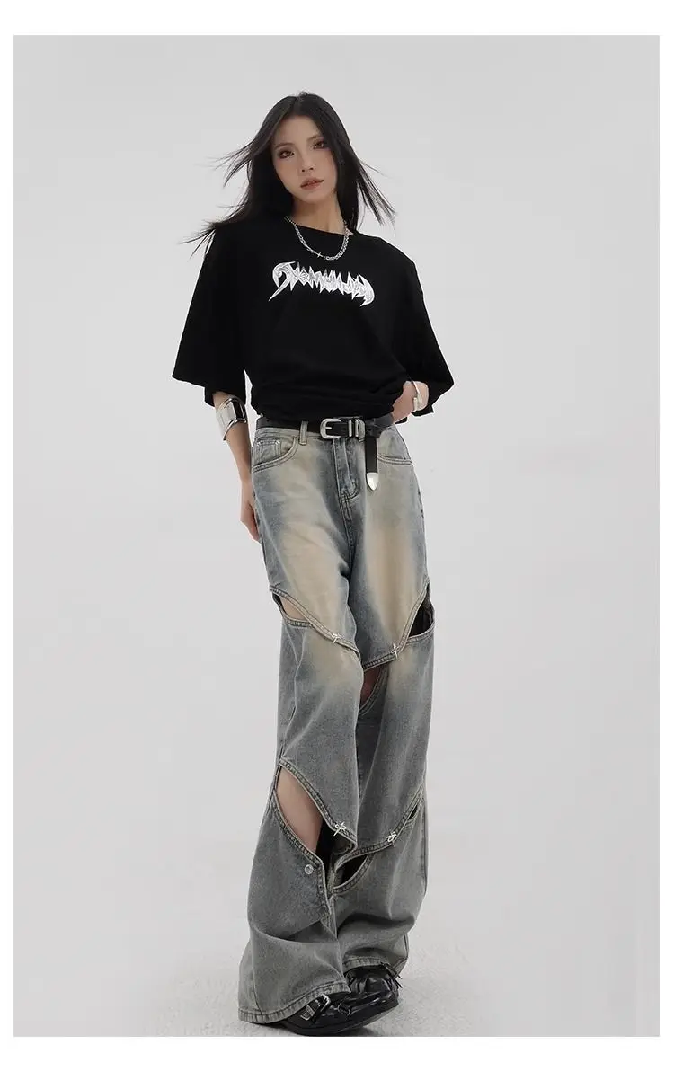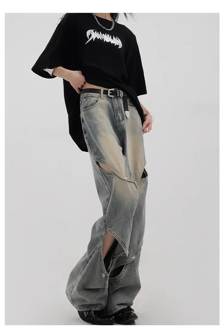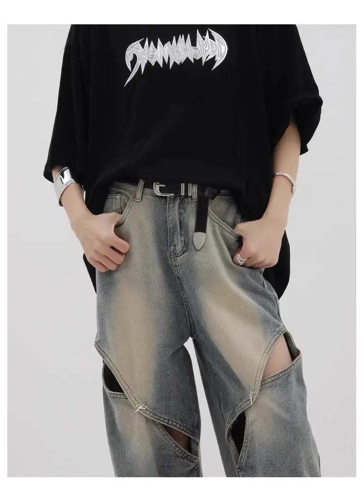 European hip-hop high street men and women trend deconstruction design straight leg jeans couple loose retro casual pants y2k