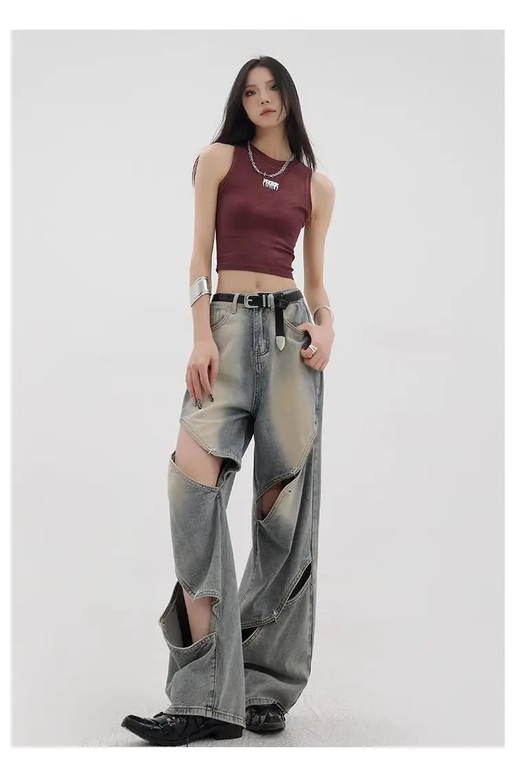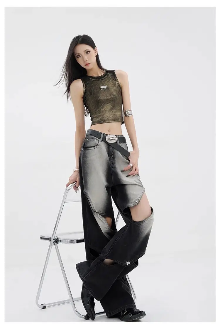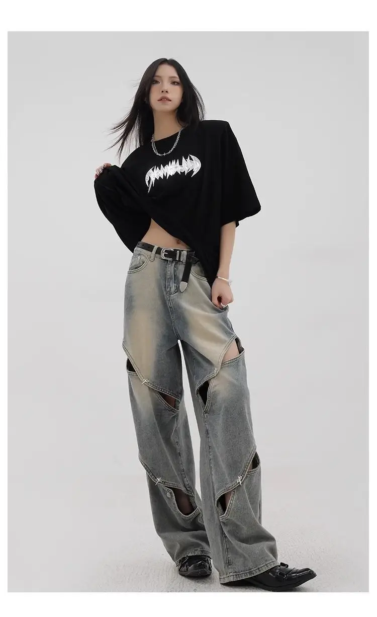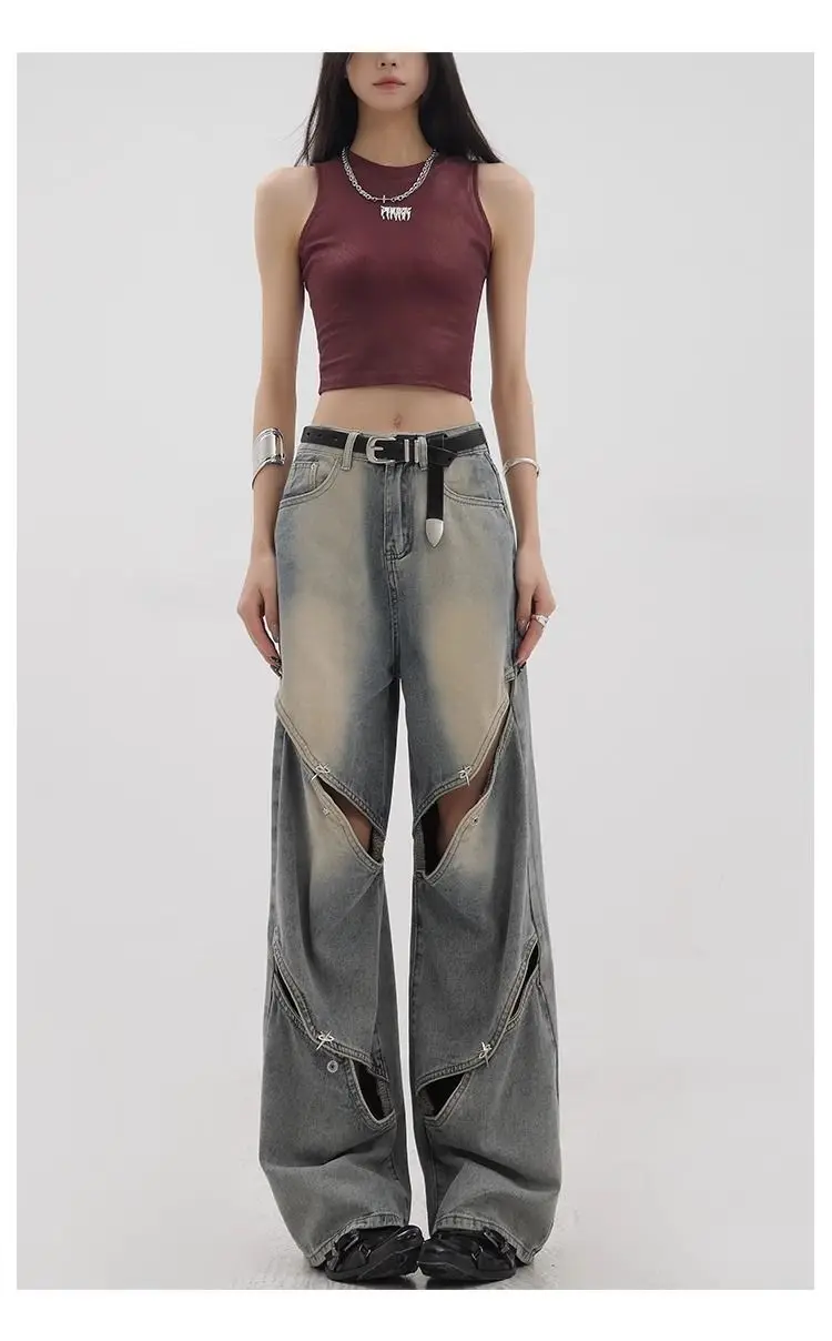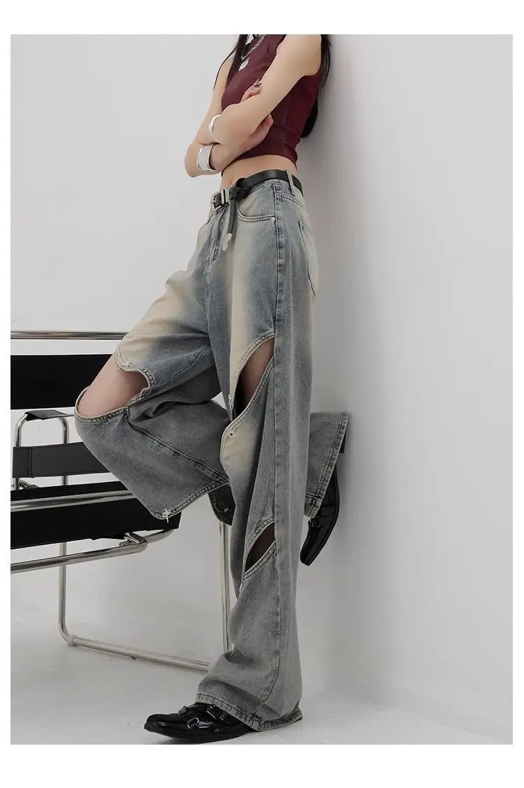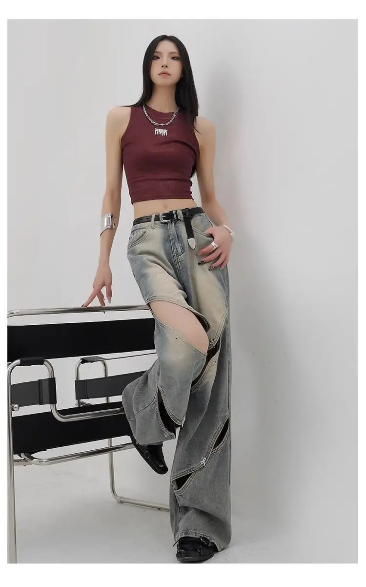 European hip-hop high street men and women trend deconstruction design straight leg jeans couple loose retro casual pants y2k