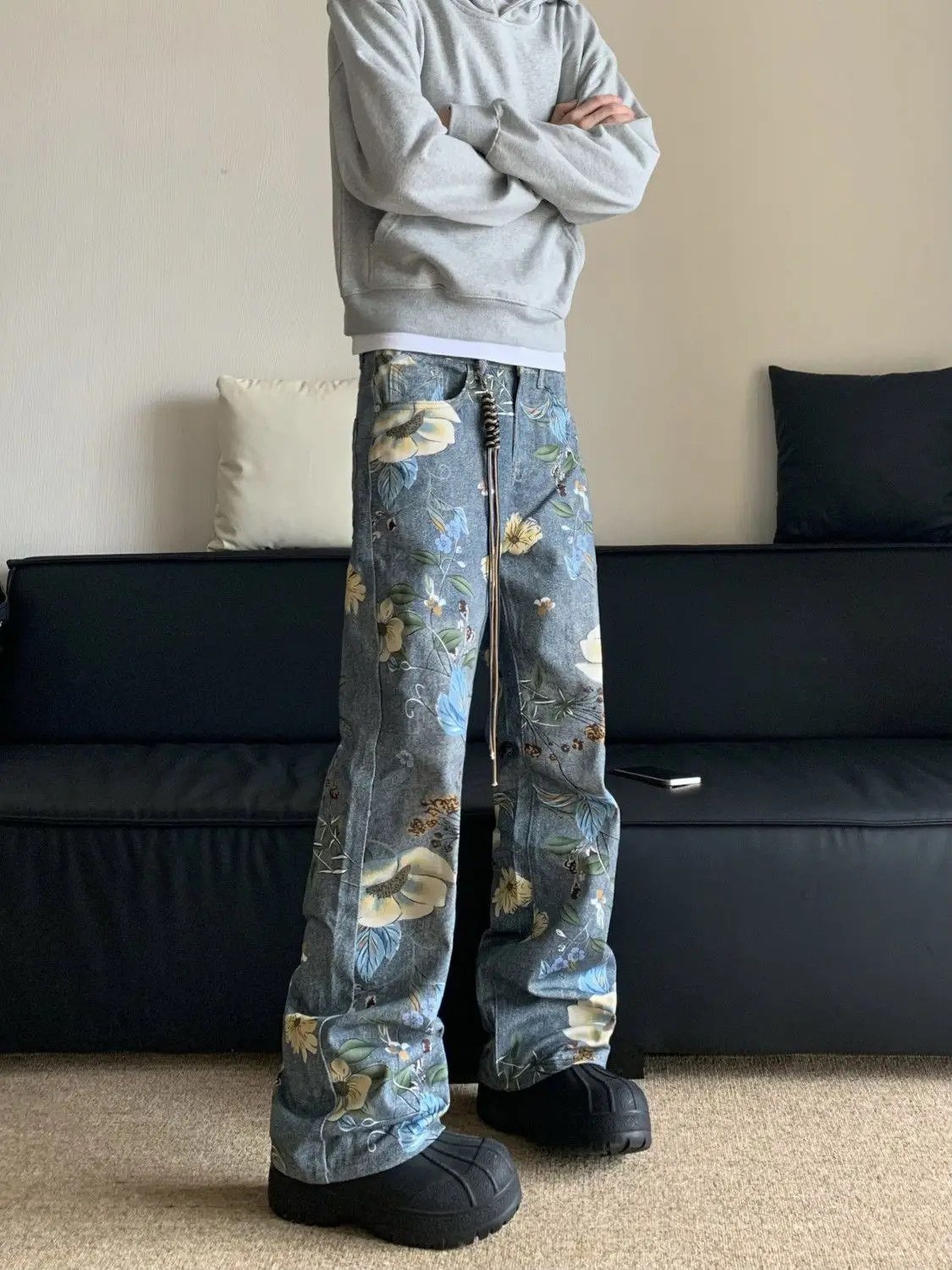 Hip hop trend men and women street personality straight tube flower print washed jeans for couples loose retro casual pants y2k