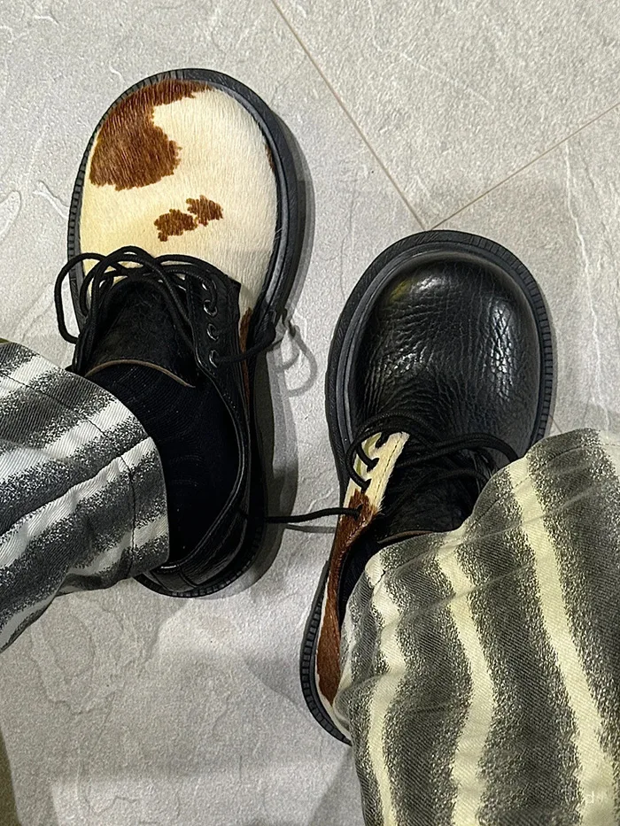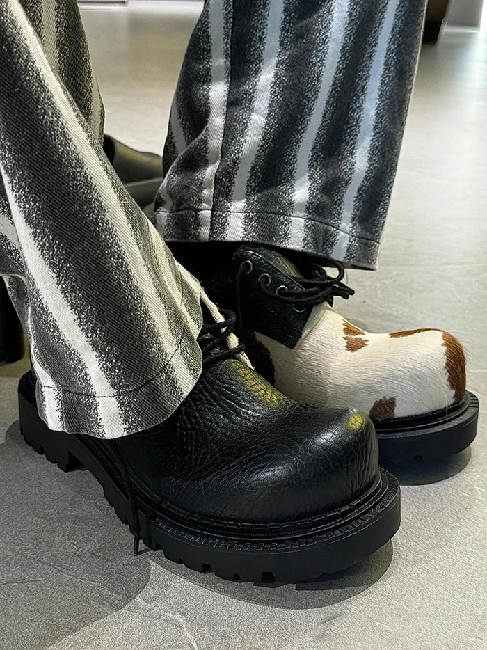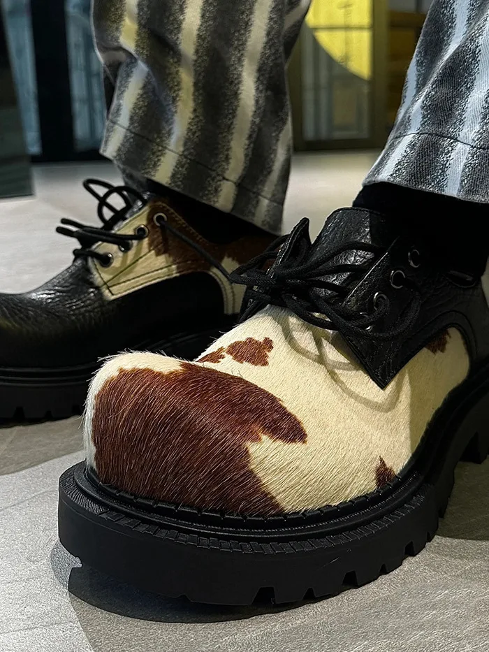 Cow Patterned PU Leather Men's Shoes Lace -up Contrast Color Casual Male Shoe Stylish Chunky Heels Spring