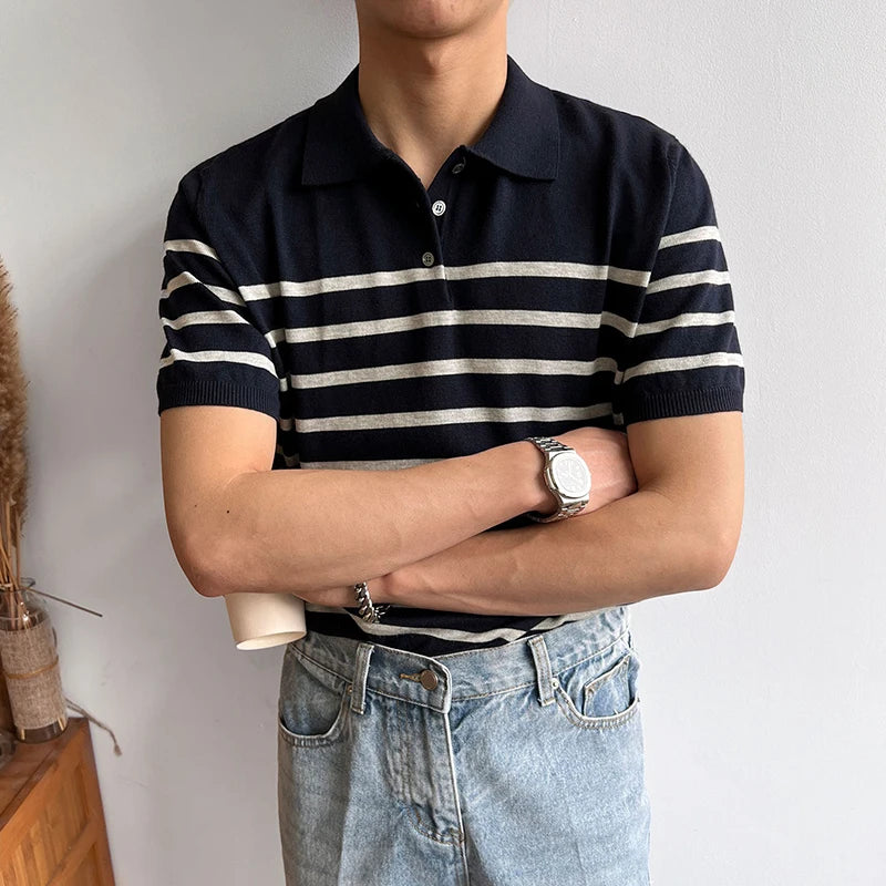 Fashion Striped Mens Knit Polo Shirts Slim Fit Short Sleeve Buttoned Lapel Knitted Polos T Shirt For Men Summer Casual Knitwear