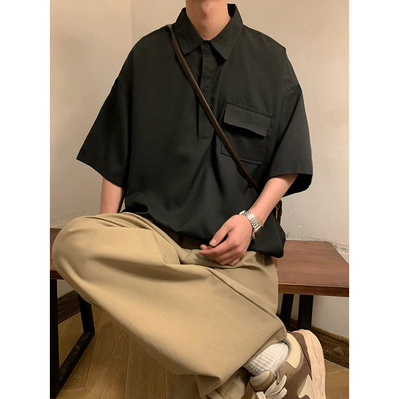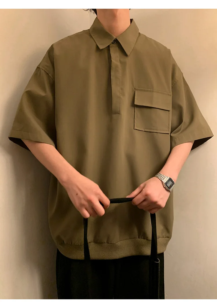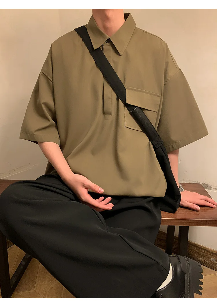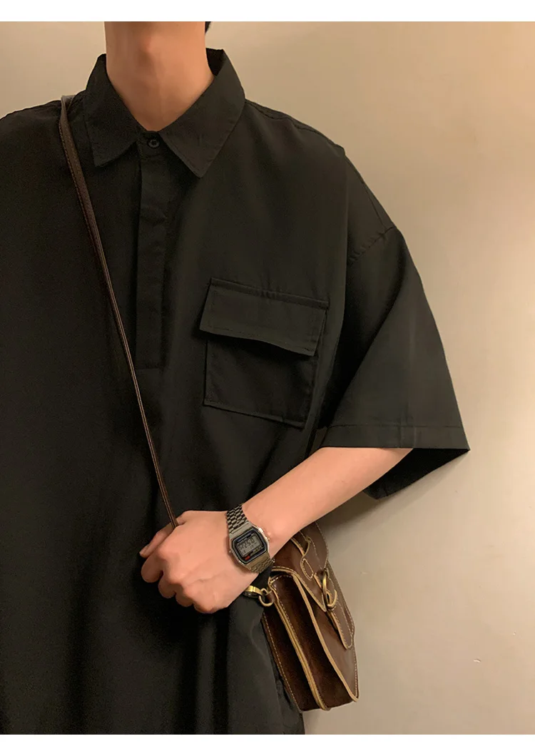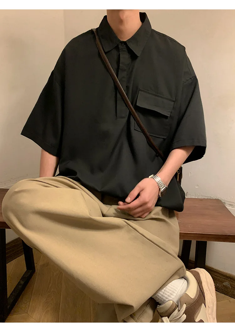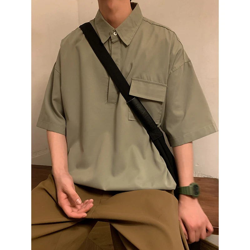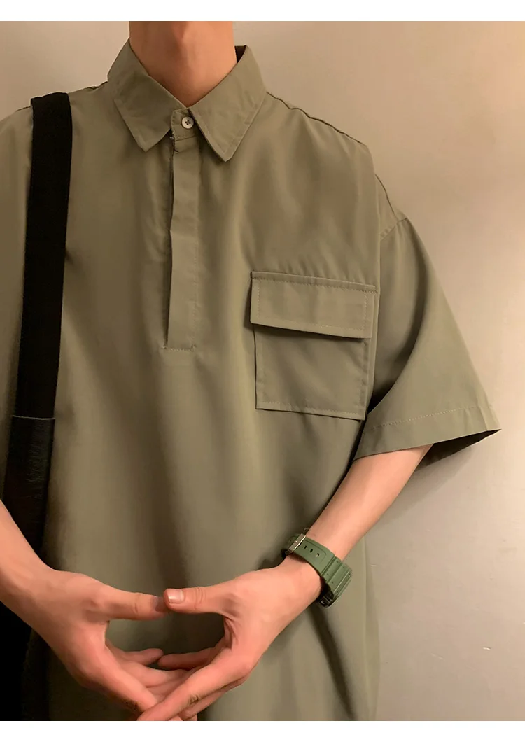 Korean Style Mens Cargo Shirt Men Casual Shirt Solid Short Sleeve Shirts Black Men's Fashion Brand Summer Man Blouse Male Top