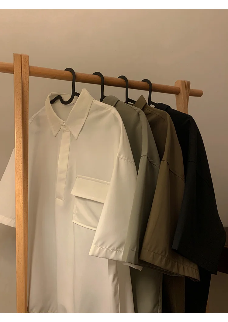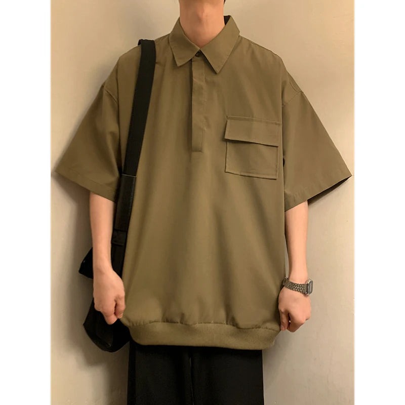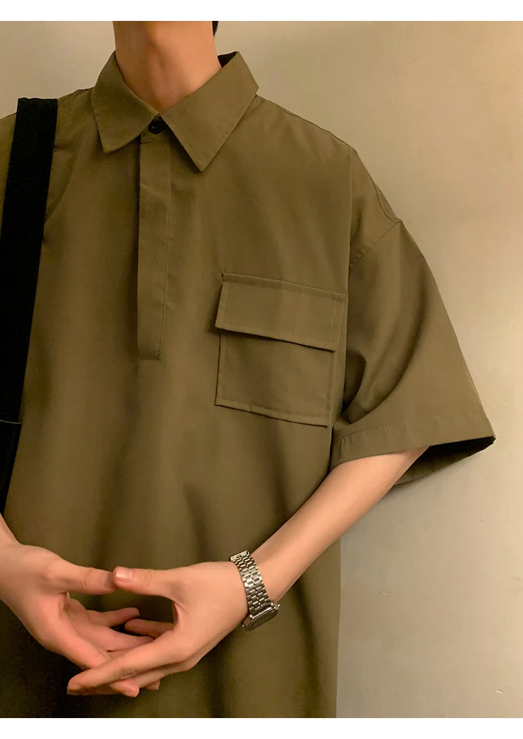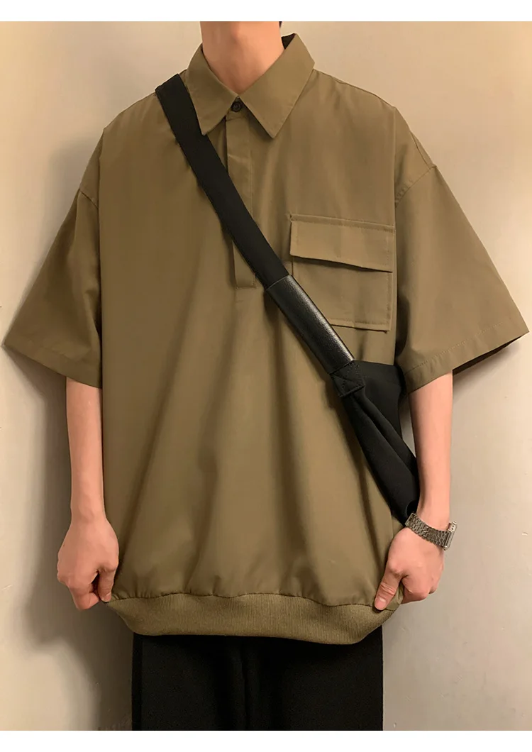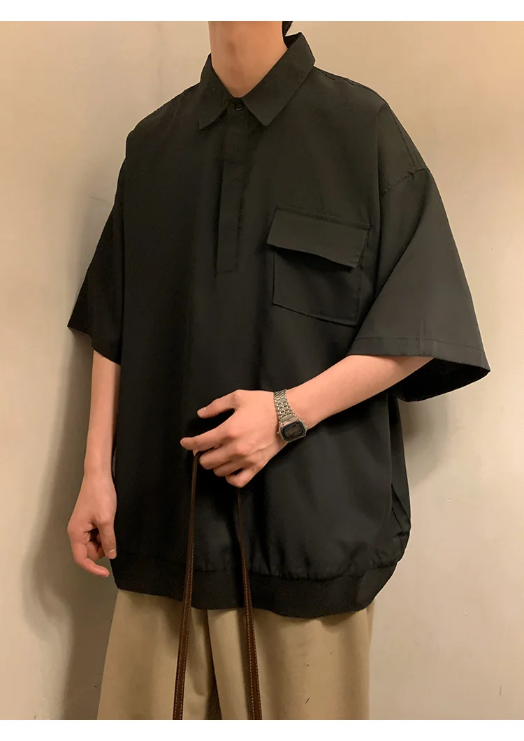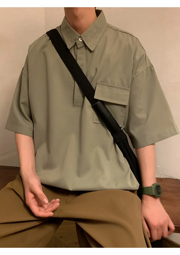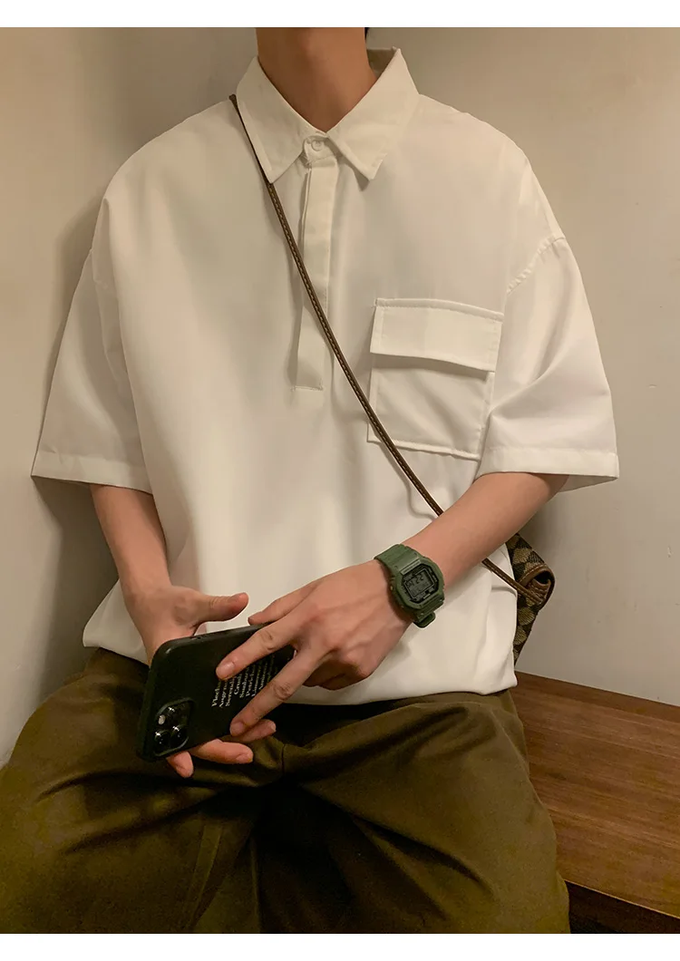 Korean Style Mens Cargo Shirt Men Casual Shirt Solid Short Sleeve Shirts Black Men's Fashion Brand Summer Man Blouse Male Top