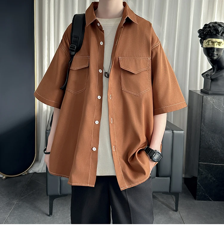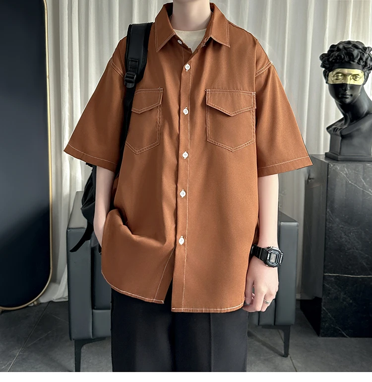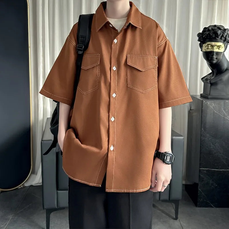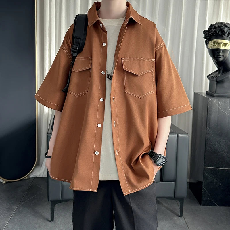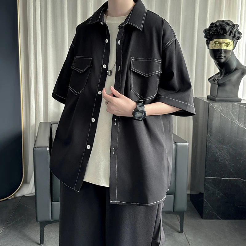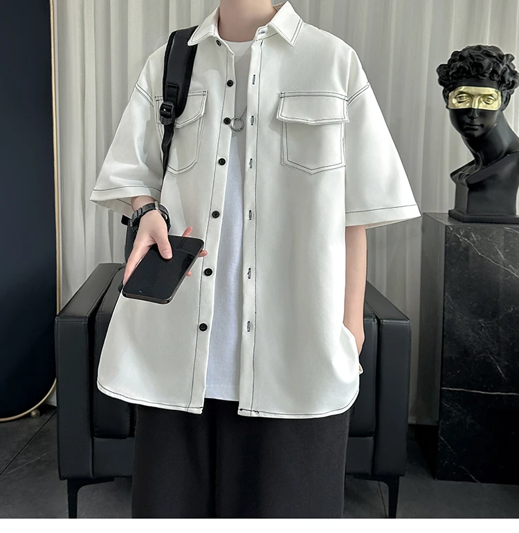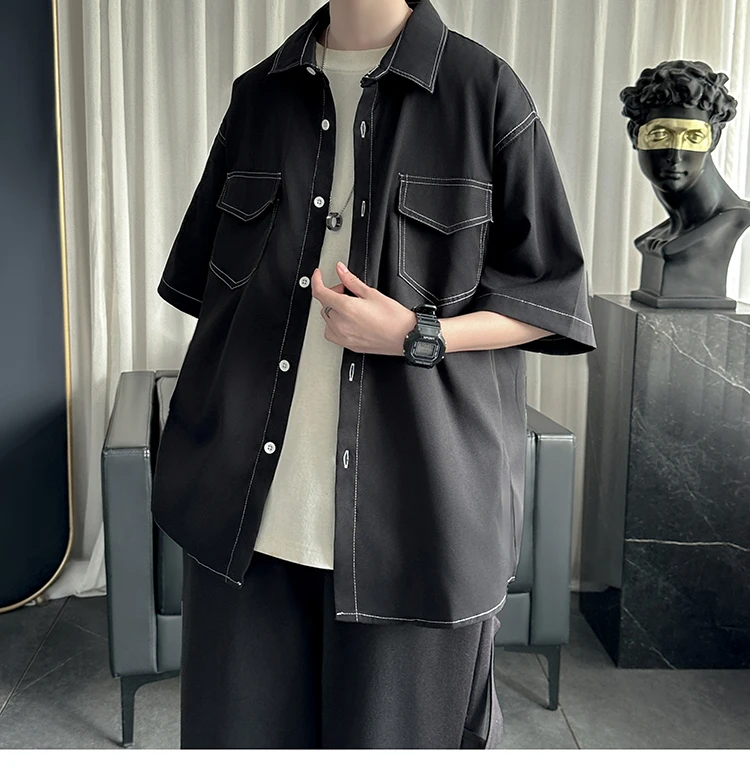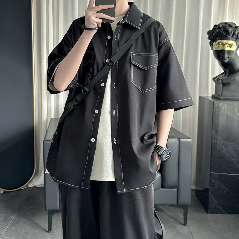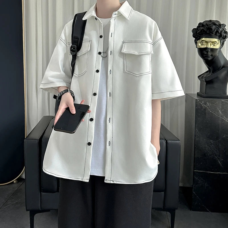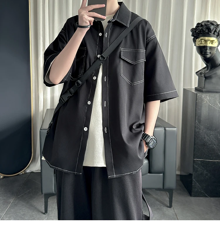 Summer Japanese Style Men Retro Shirts Short Sleeves Double Welt Pocket High Quality Oversize Casual Shirt for Man Black White