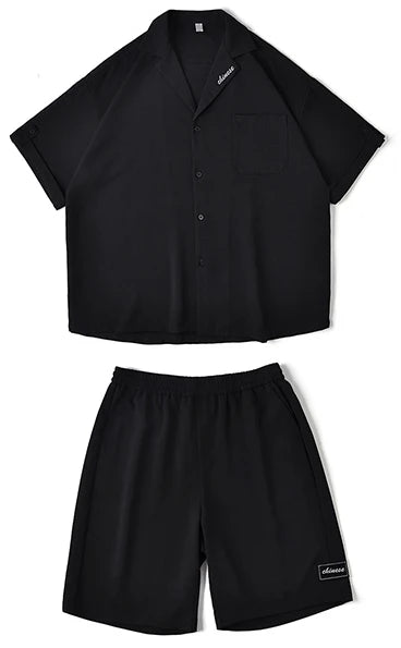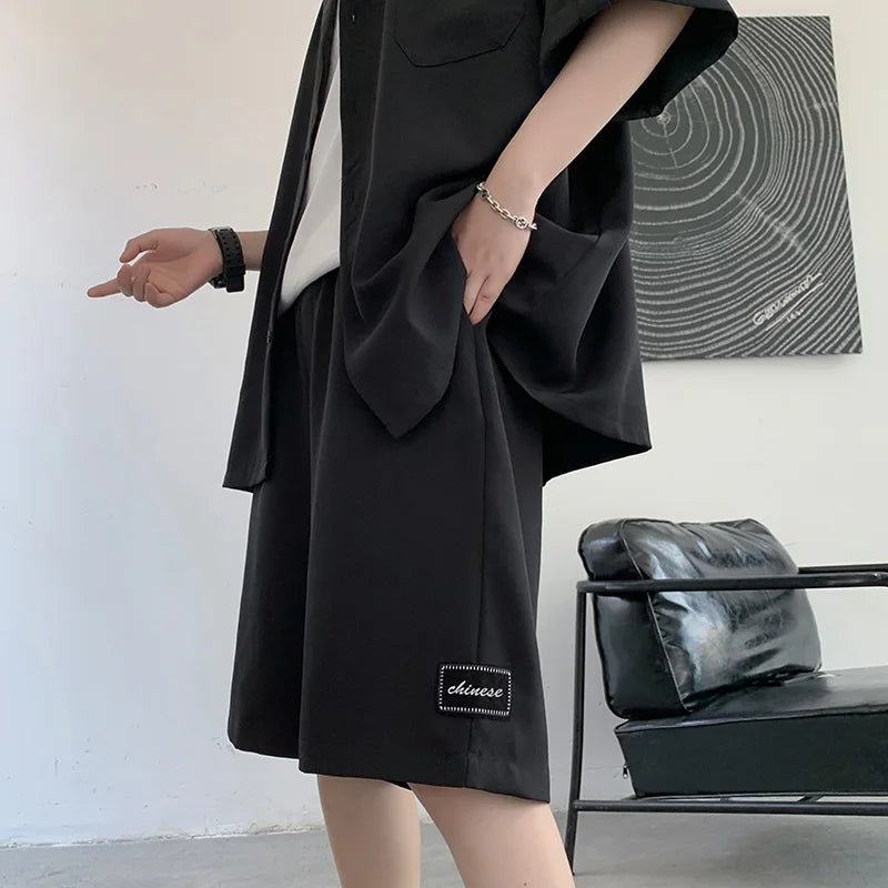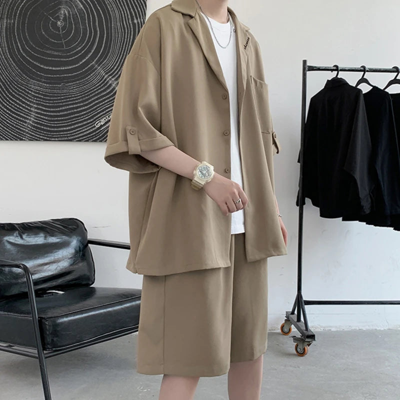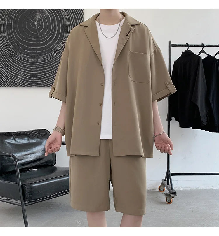Men's Sets Summer Handsome Notched Collar Half Length Sleeve Shirts Knee Solid Elastic Waist Shorts Korean Style Fashion