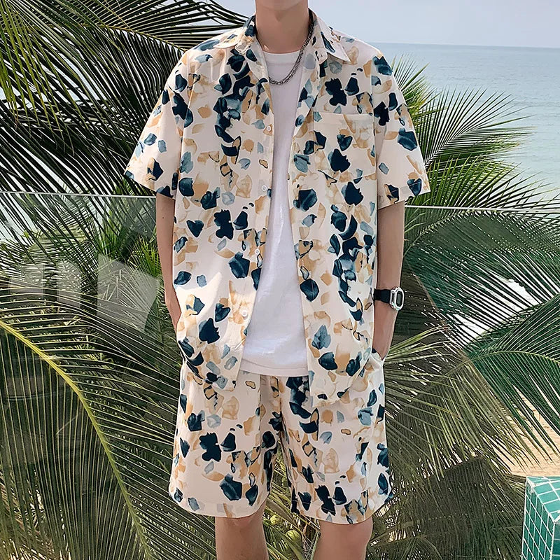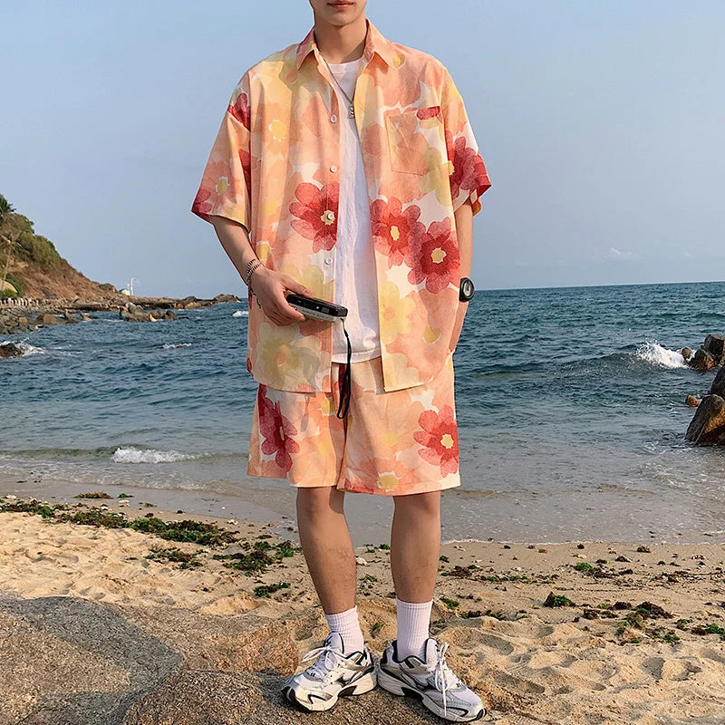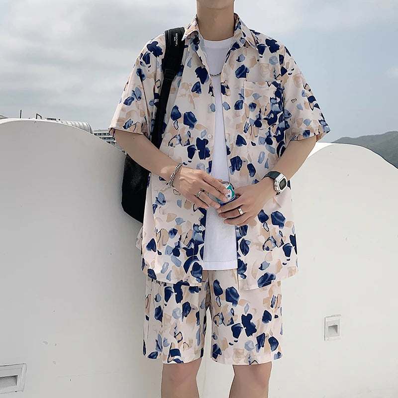 Summer Men Shorts Set Matching Shirts Letter Striped Floral Printing Outfits Short Sleeve Elastic Waist Thin Oversize Suit Man