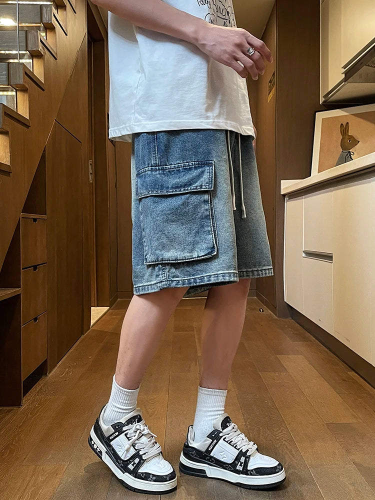 Summer Men's Cargo Denim Shorts Baggy Straight Fashion Casual Wide Leg Short Pants Big Pocket Beach Vacation Short Jeans Male