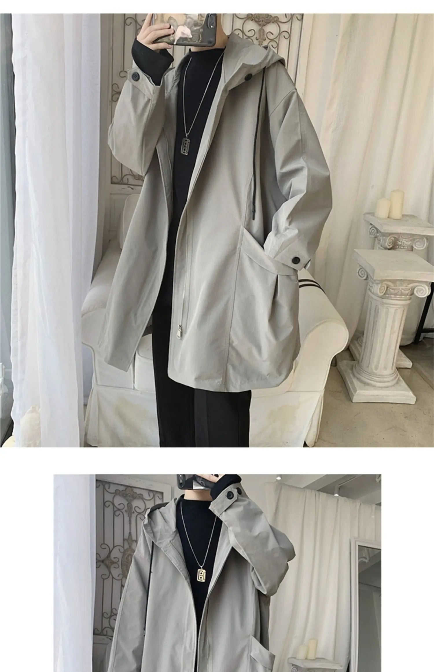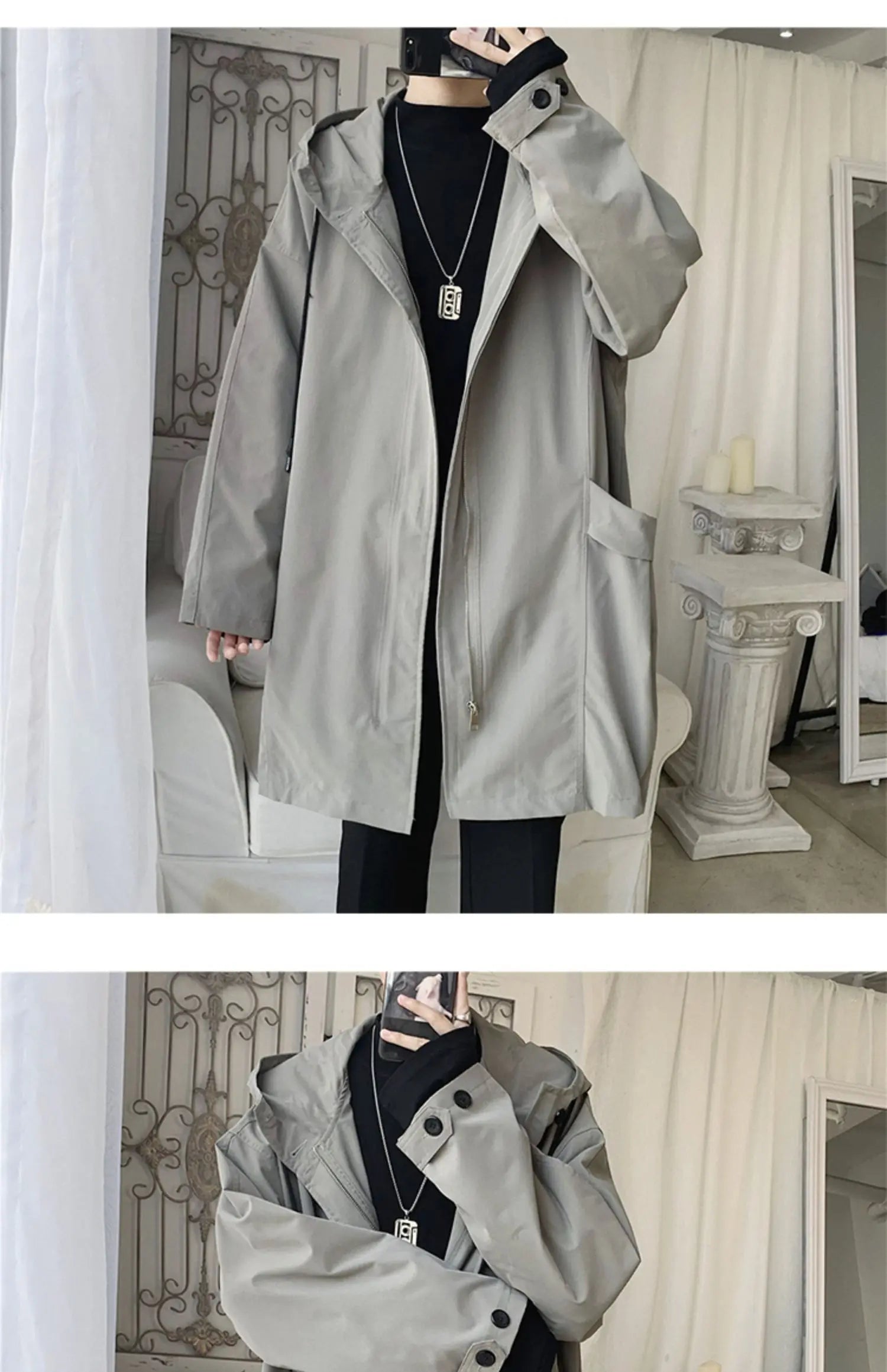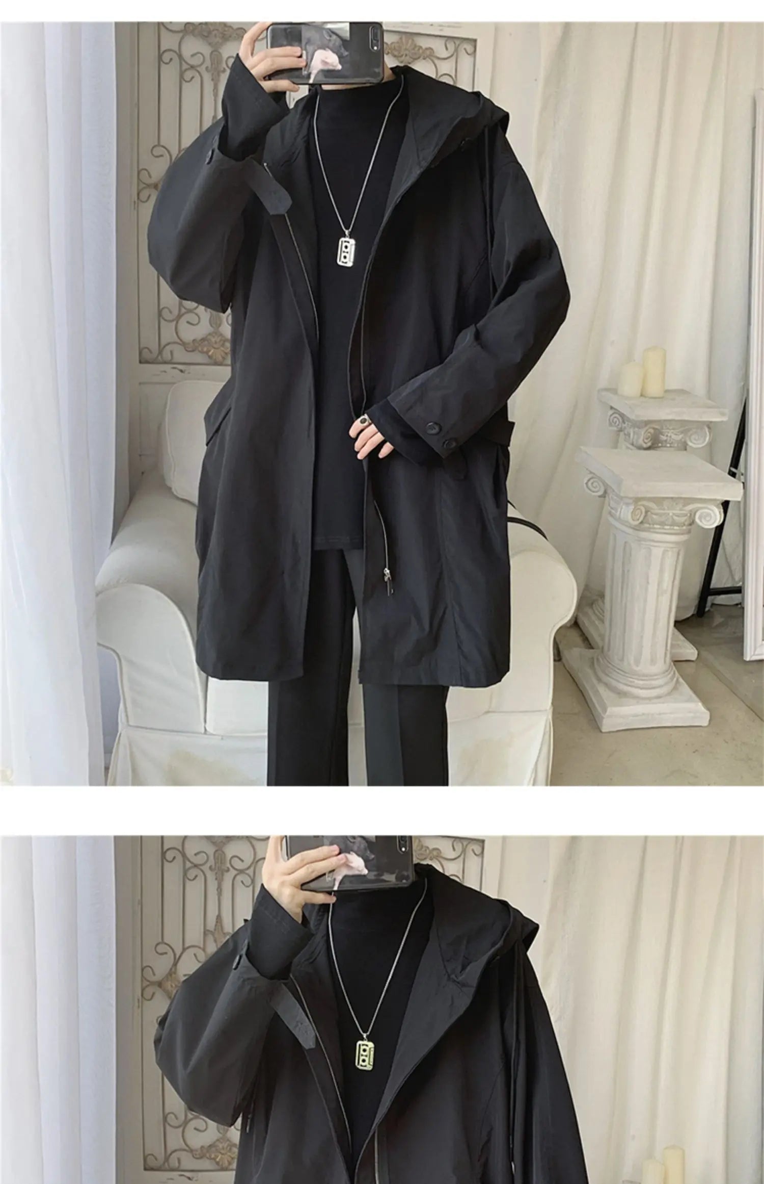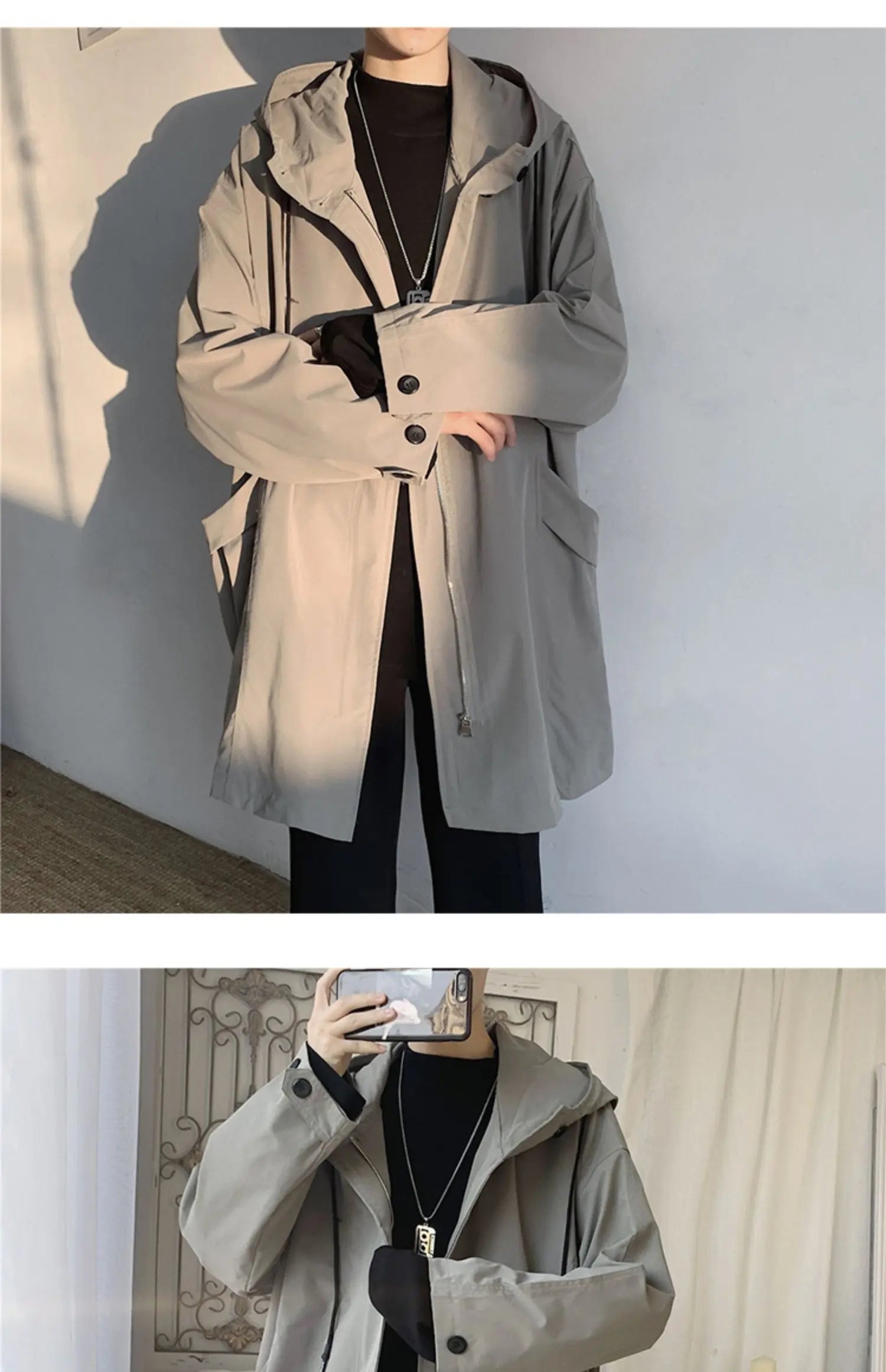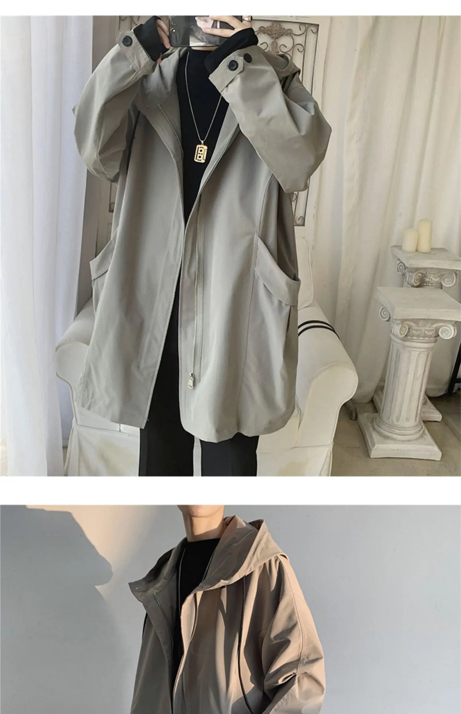 Hooded Trench Men Baggy Zip-up Overcoat Fashion Ulzzang Handsome Daily Pockets Mature Streetwear Personality Spring Autumn Soft
