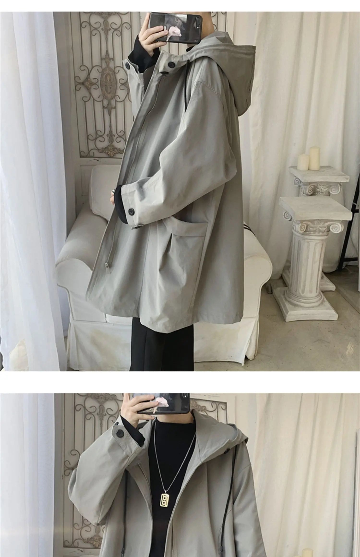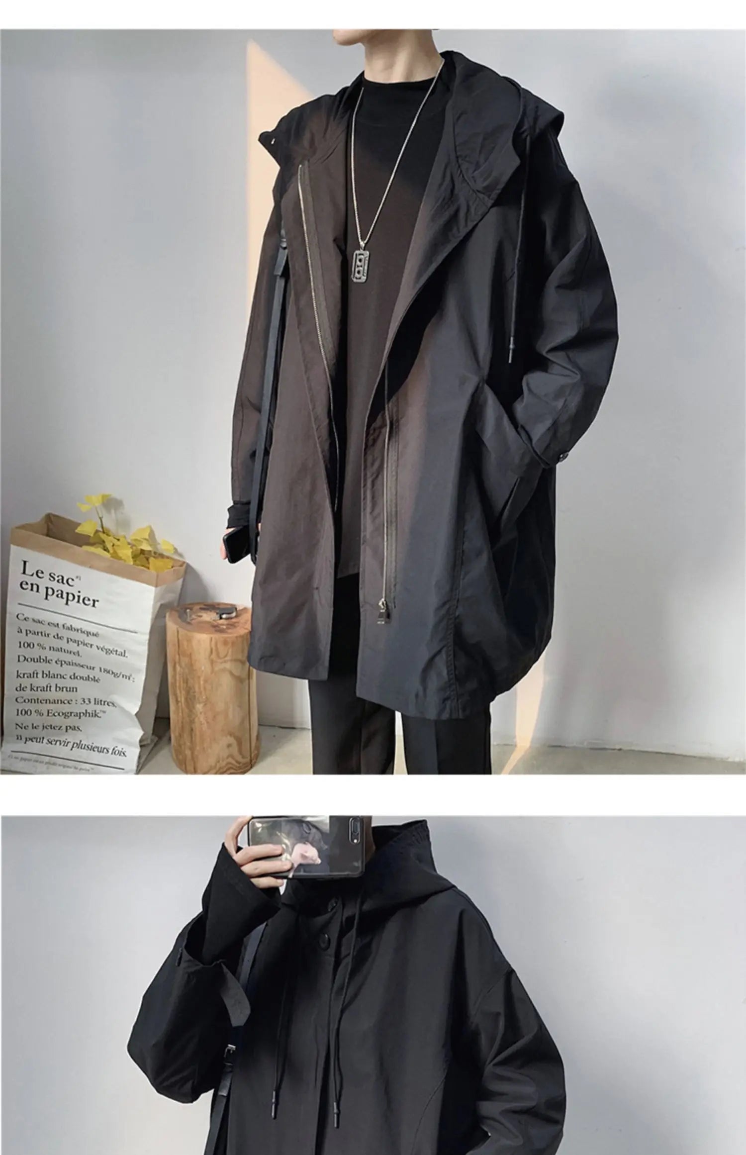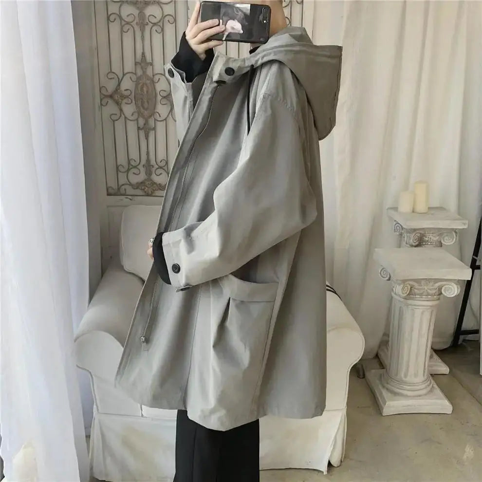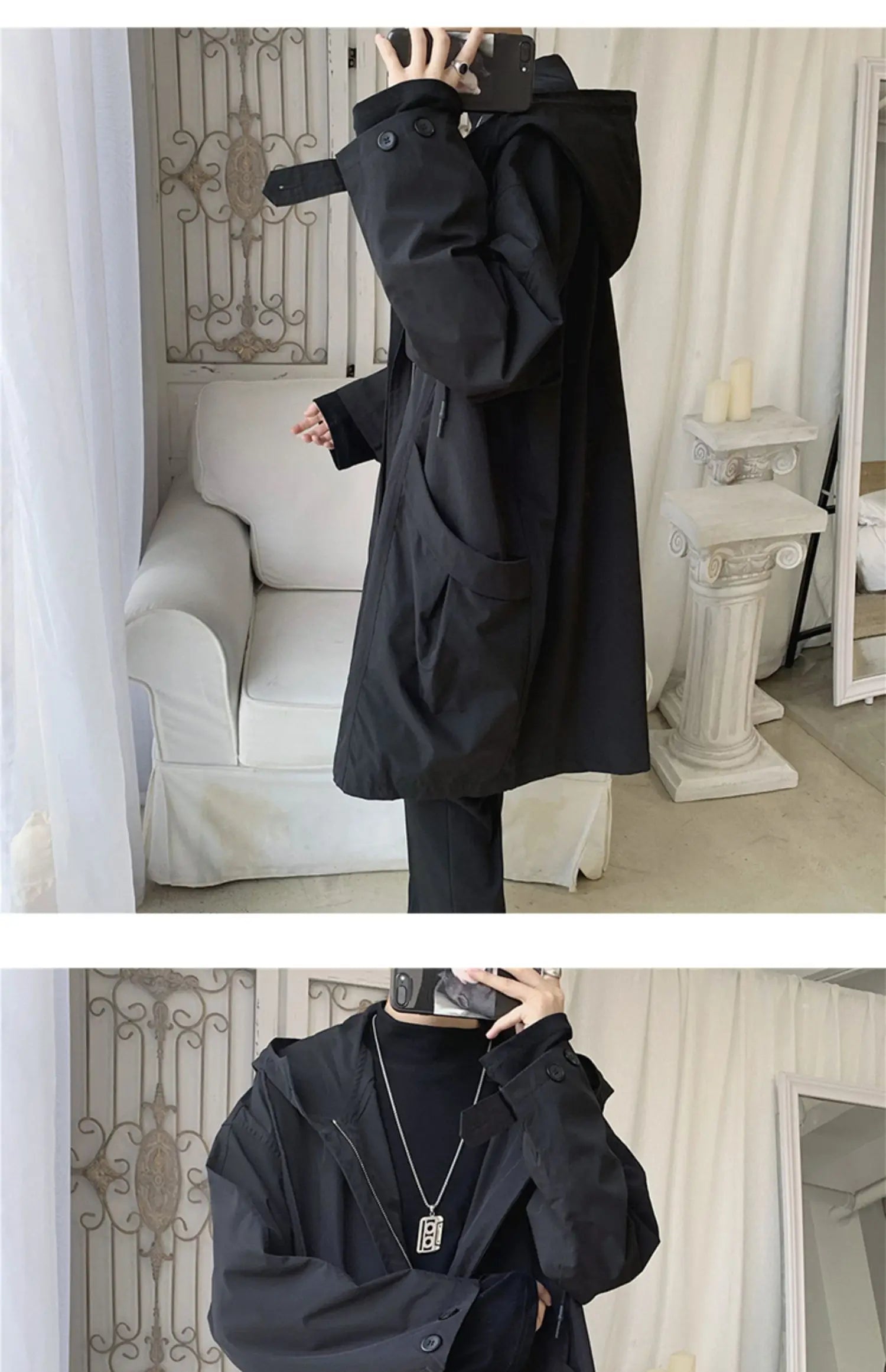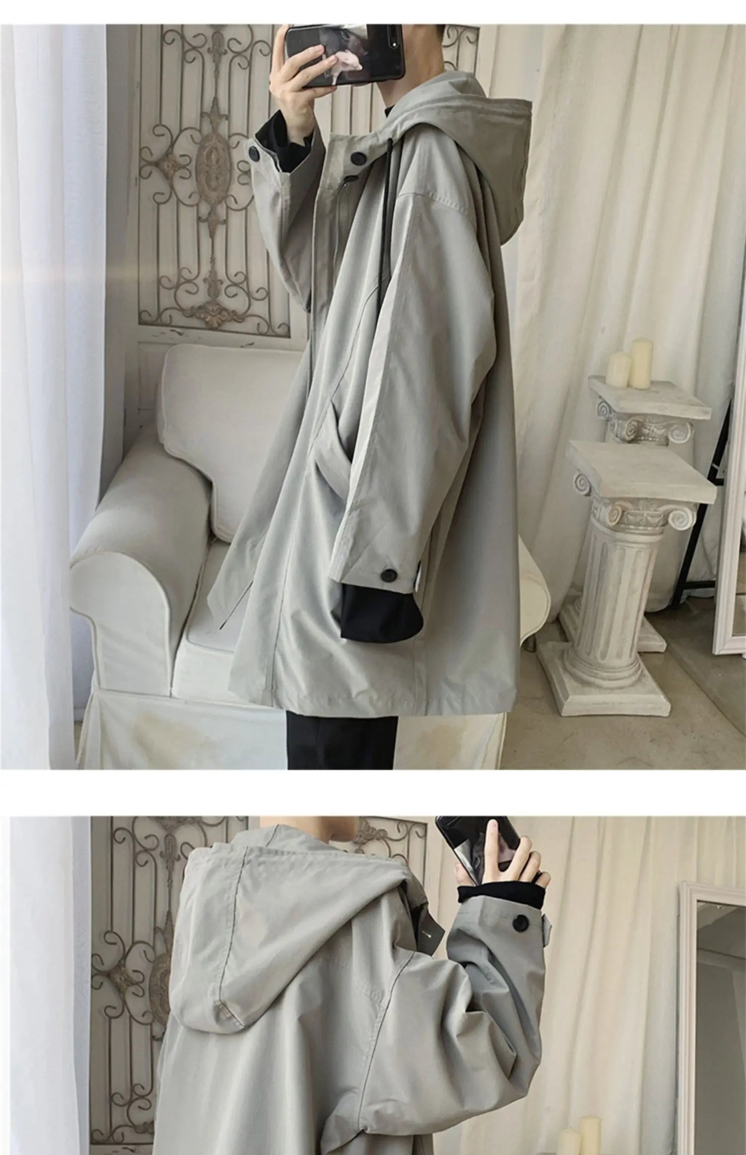 Hooded Trench Men Baggy Zip-up Overcoat Fashion Ulzzang Handsome Daily Pockets Mature Streetwear Personality Spring Autumn Soft