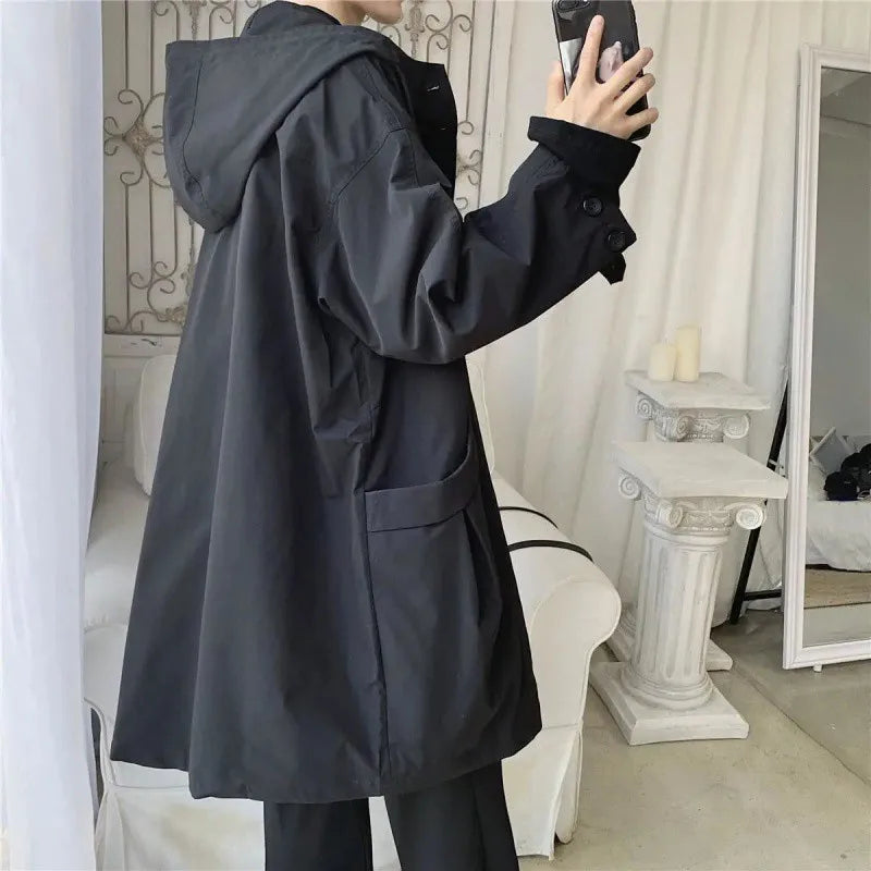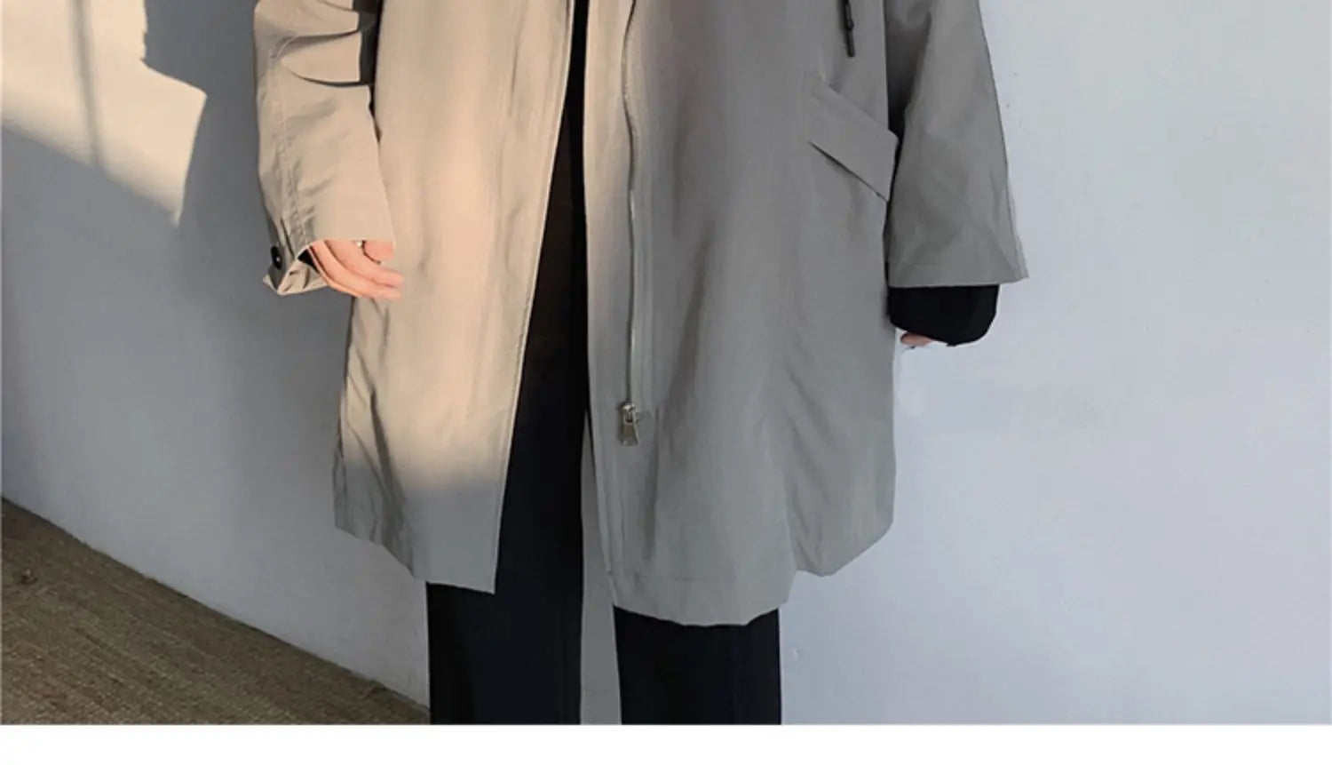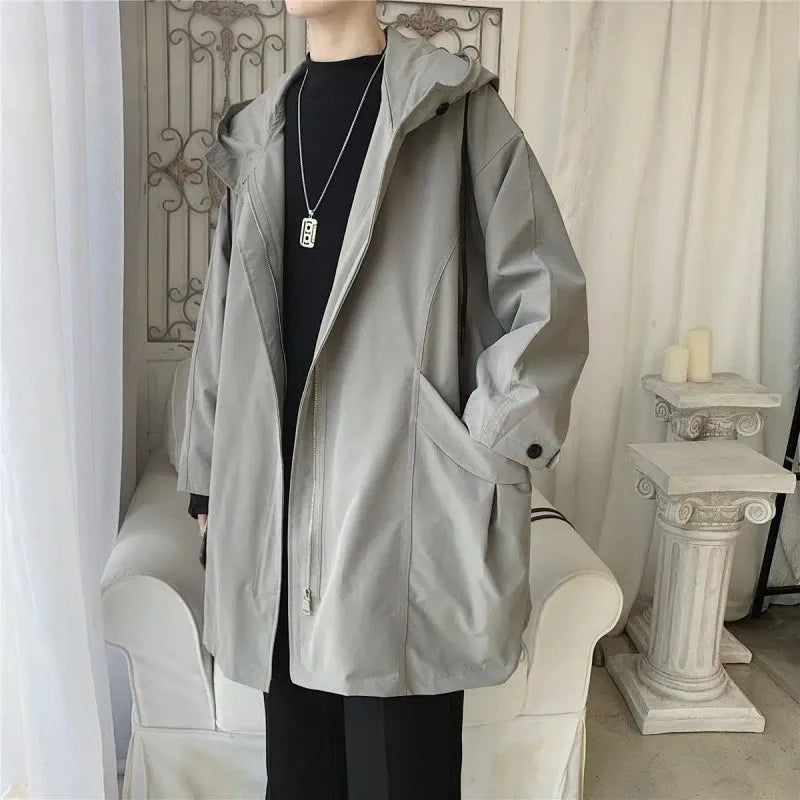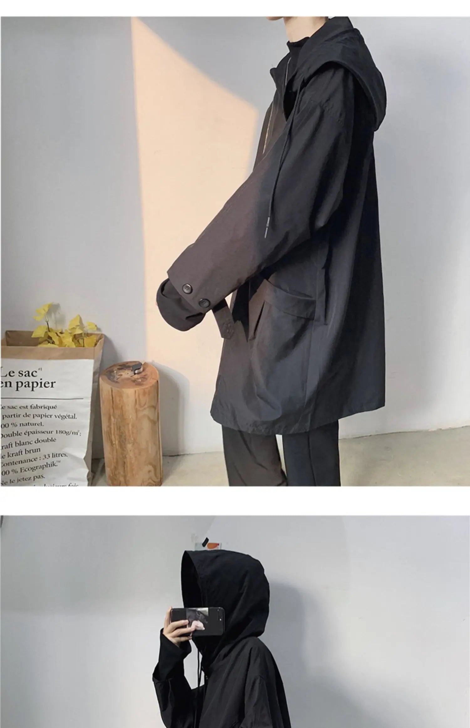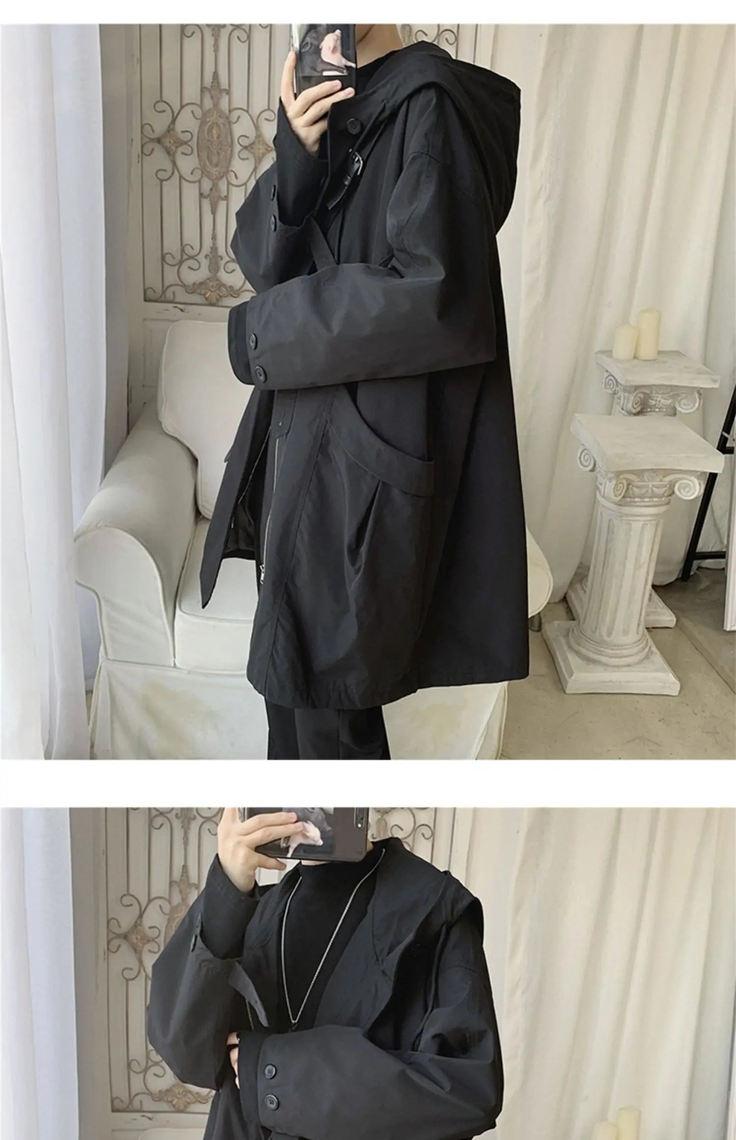 Hooded Trench Men Baggy Zip-up Overcoat Fashion Ulzzang Handsome Daily Pockets Mature Streetwear Personality Spring Autumn Soft