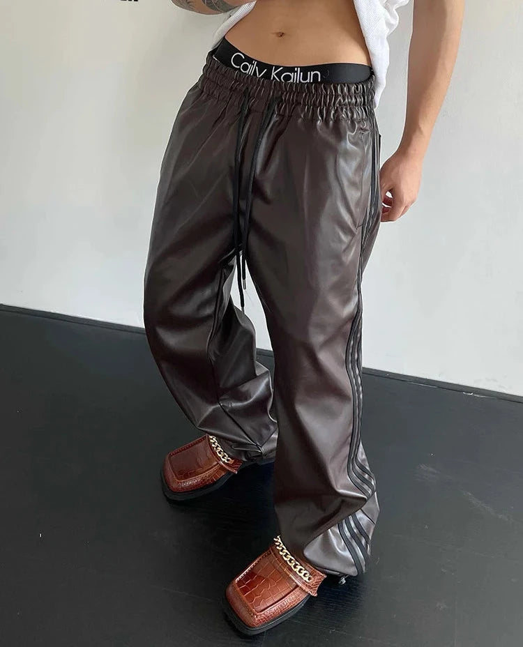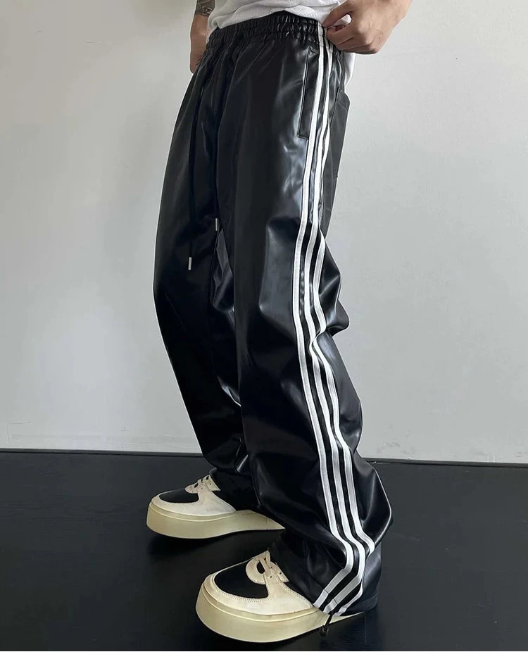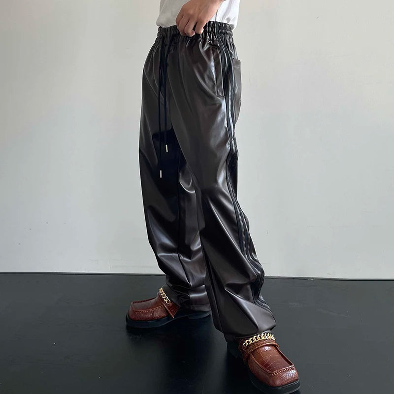Spring Autumn Cool Black Soft Stretchy Waterproof Pu Leather Pants for Men with Elastic Waist Loose Casual Clothes