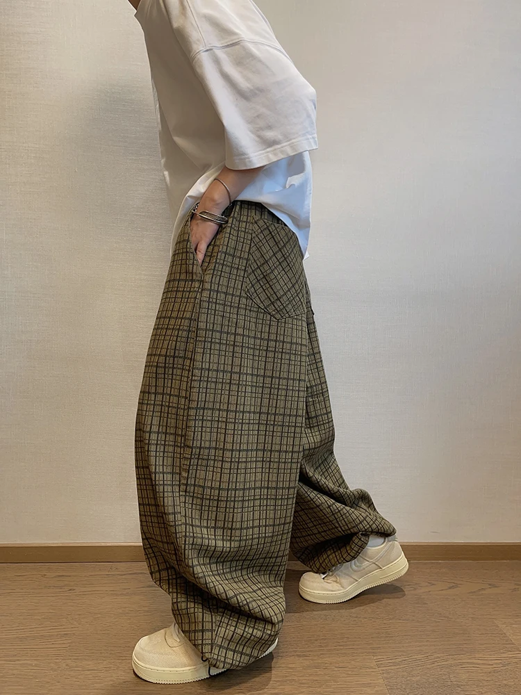 Spring Autumn Cool Oversized Long Flowy Baggy Wide Leg Pants for Mens Streetwear Loose Plaid Canvas Trousers