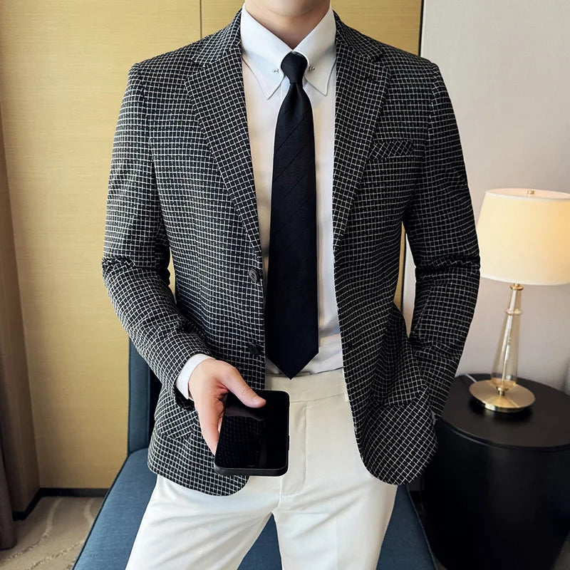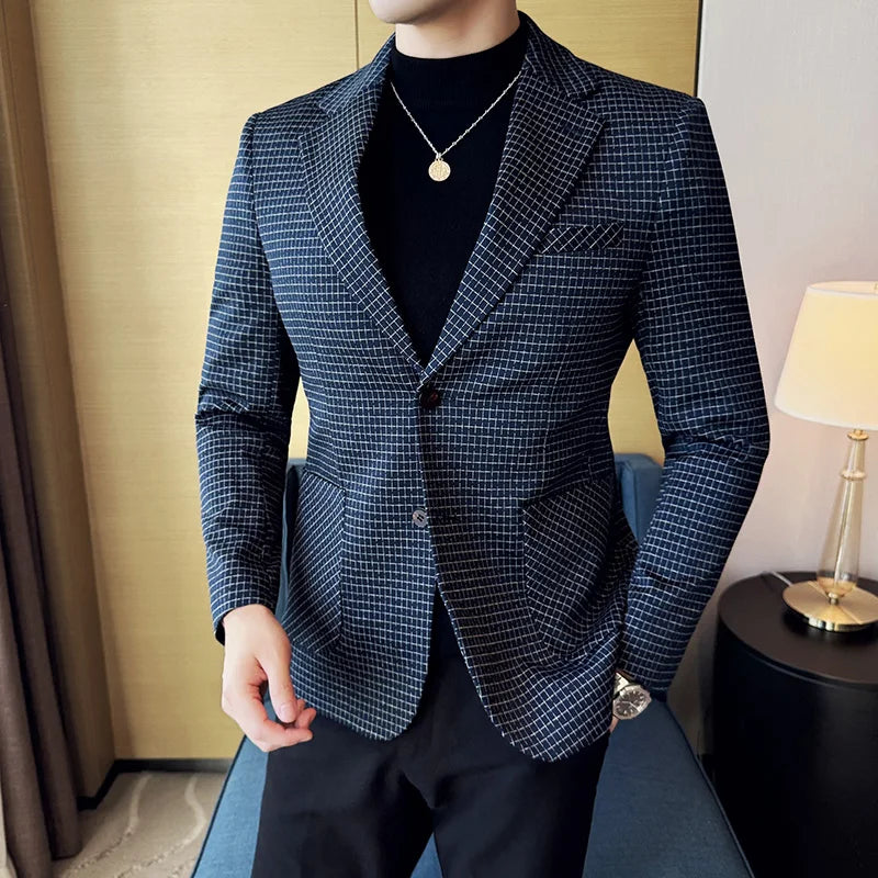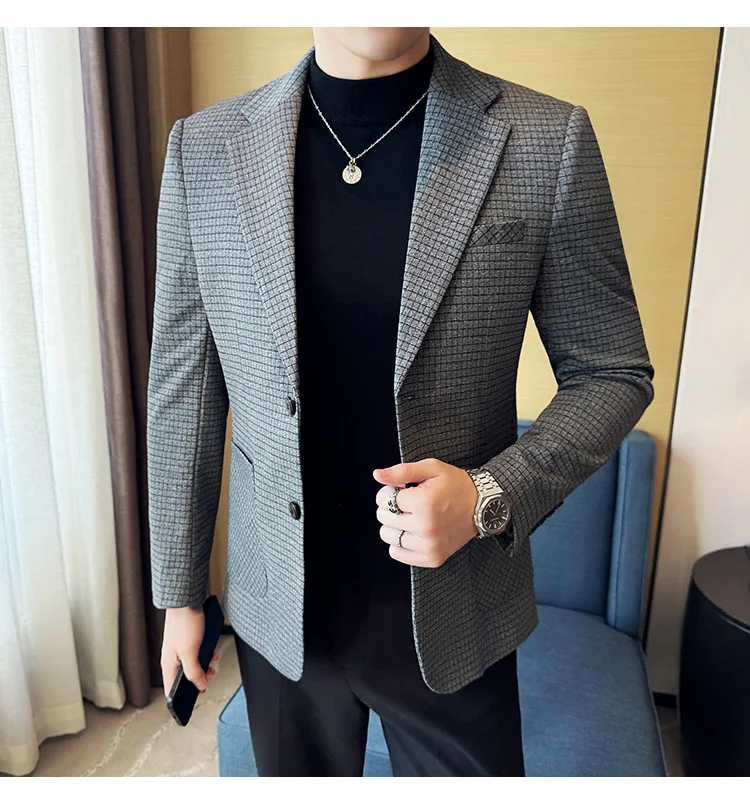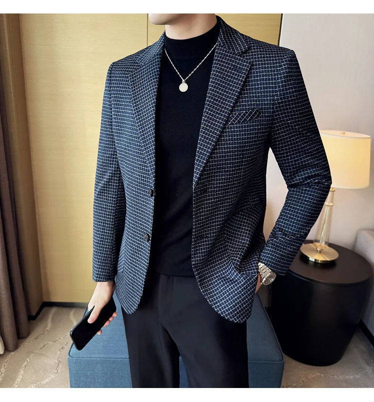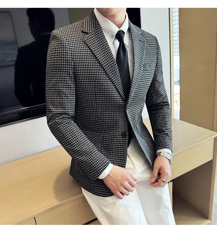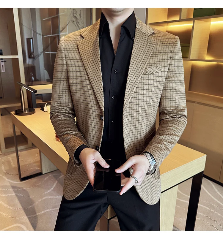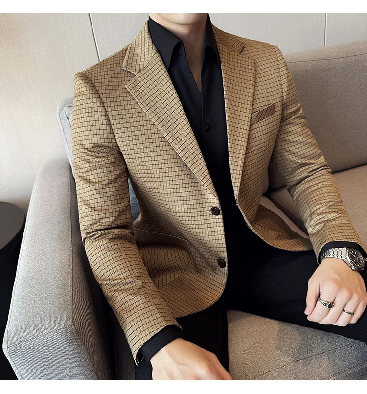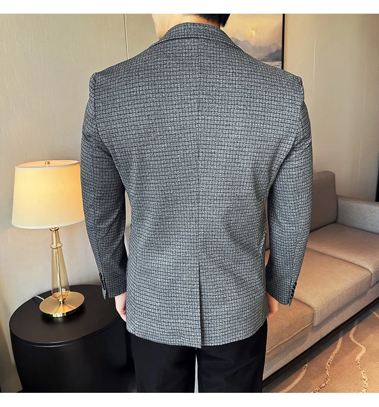 Fashion Men Plaid Blazer Jackets Fit Slim Luxury Man Suit Coat Korean Style Small Check Casual Overcoat Male