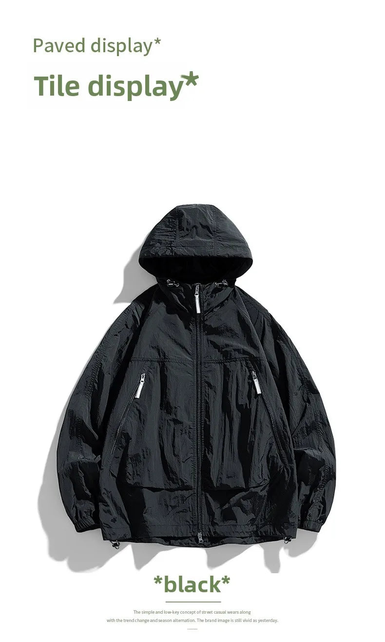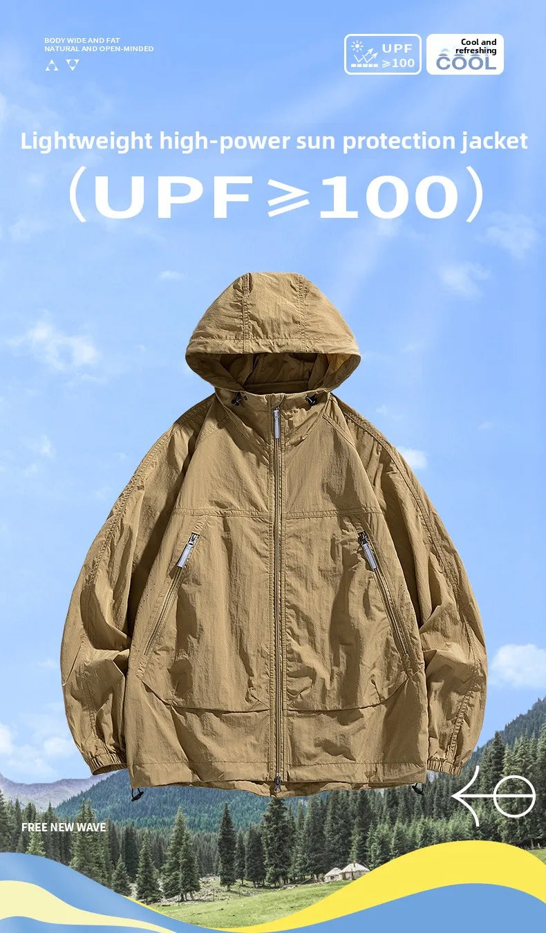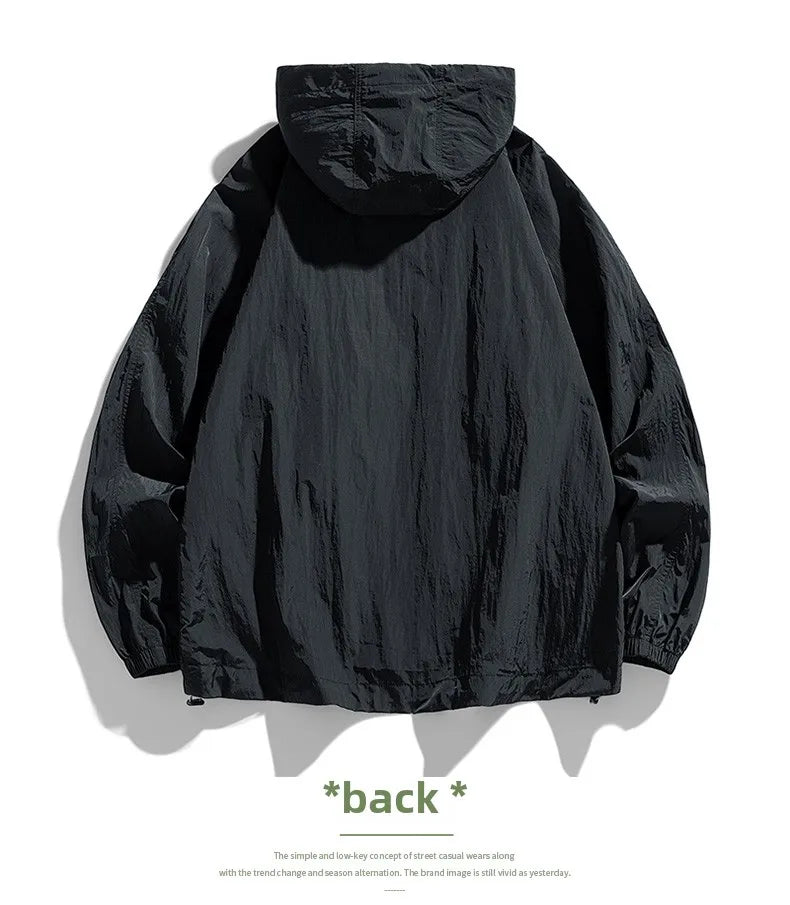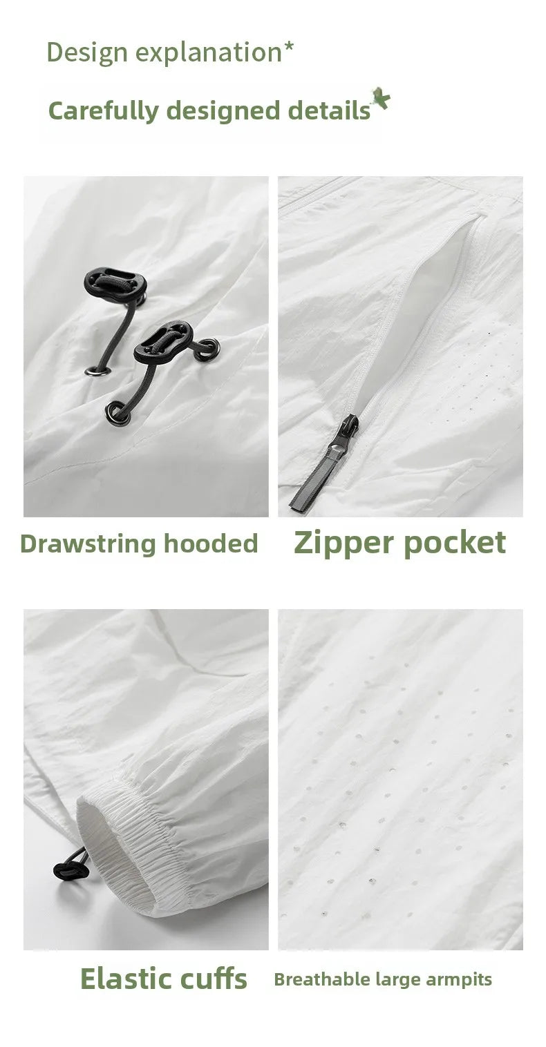 UPF50+Men's Hooded Windbreaker Sunscreen Jacket - Ultra Light Summer Zipper Pocket Elastic Cuffs Suitable for Outdoor Hiking