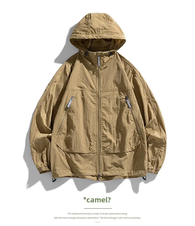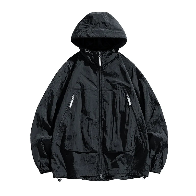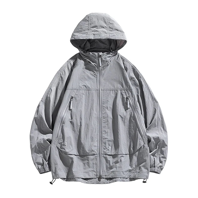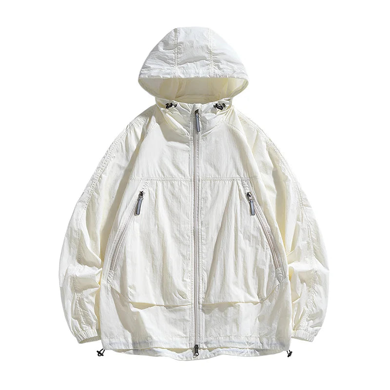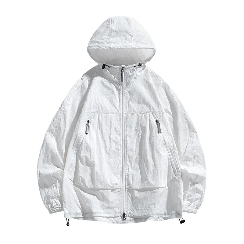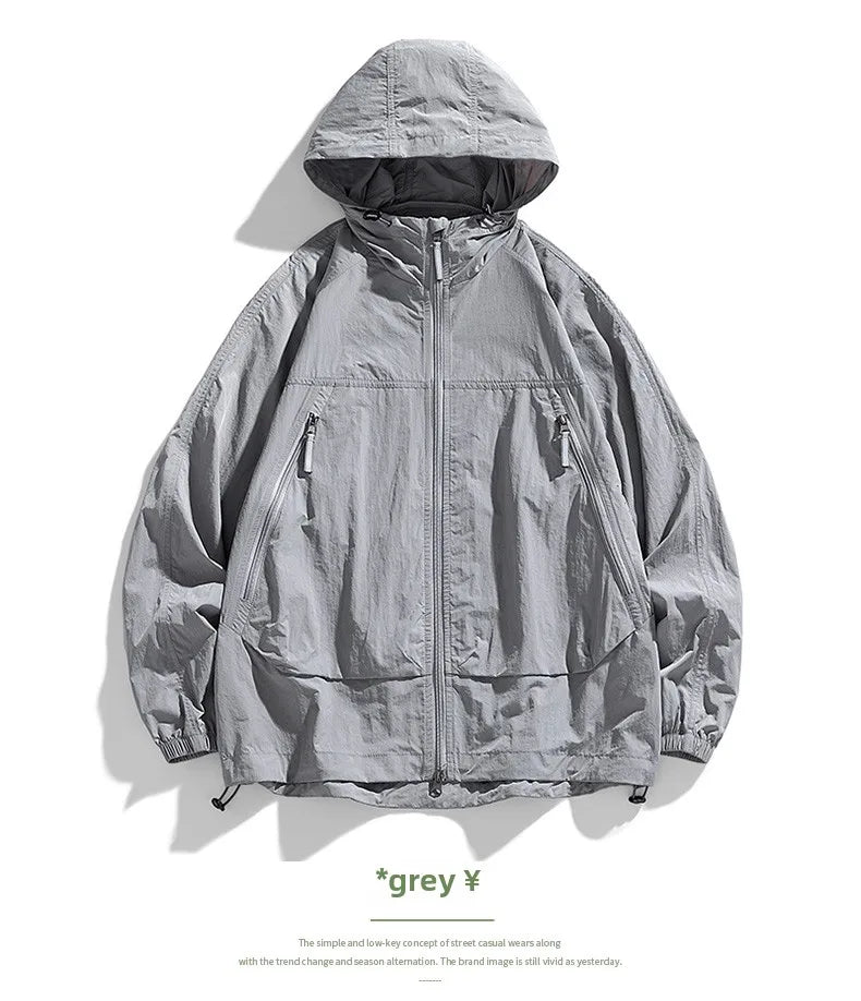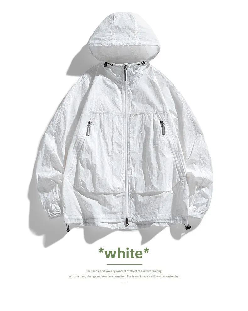 UPF50+Men's Hooded Windbreaker Sunscreen Jacket - Ultra Light Summer Zipper Pocket Elastic Cuffs Suitable for Outdoor Hiking