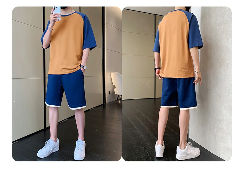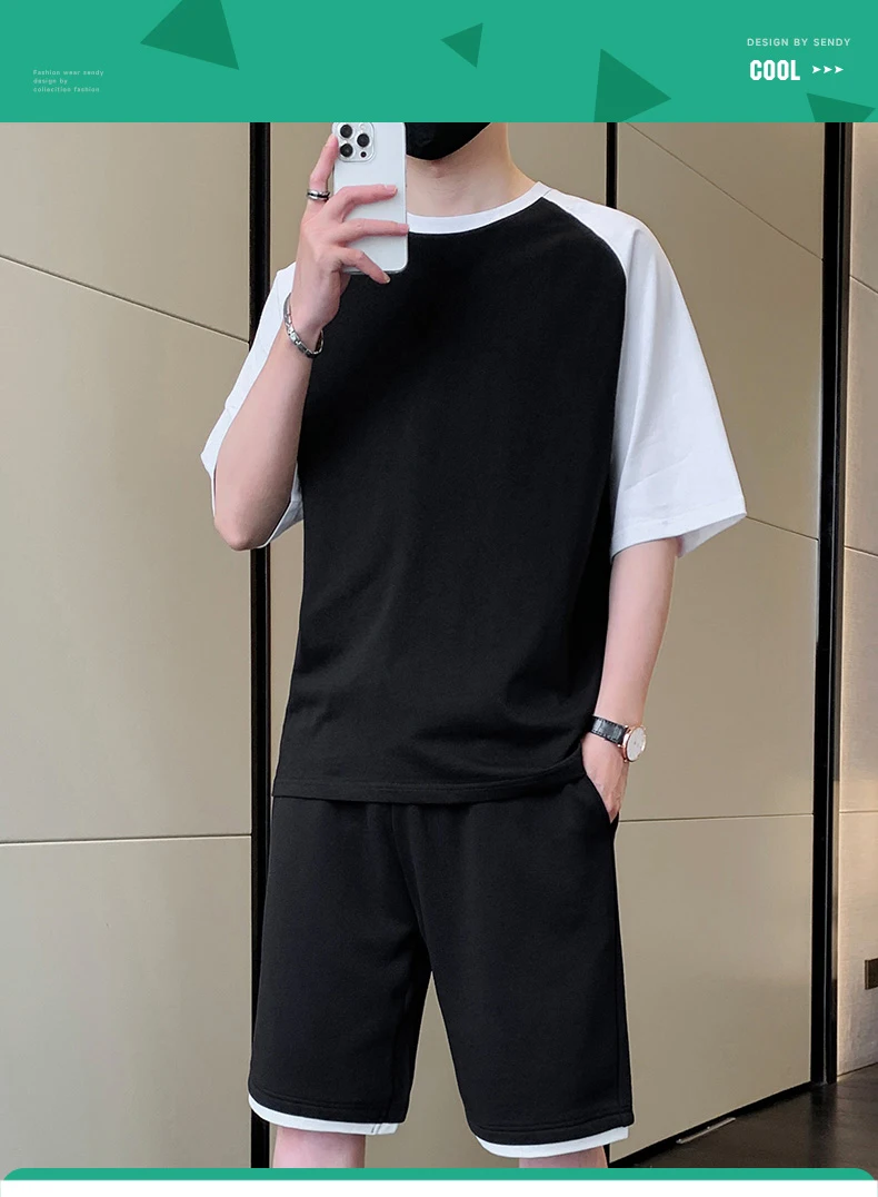 Korean Fashion 2 Piece Set Men Summer Clothes Patchwork Tracksuits Men Sports Wear Streetwear Outfits Men Clothing Pure Cotton