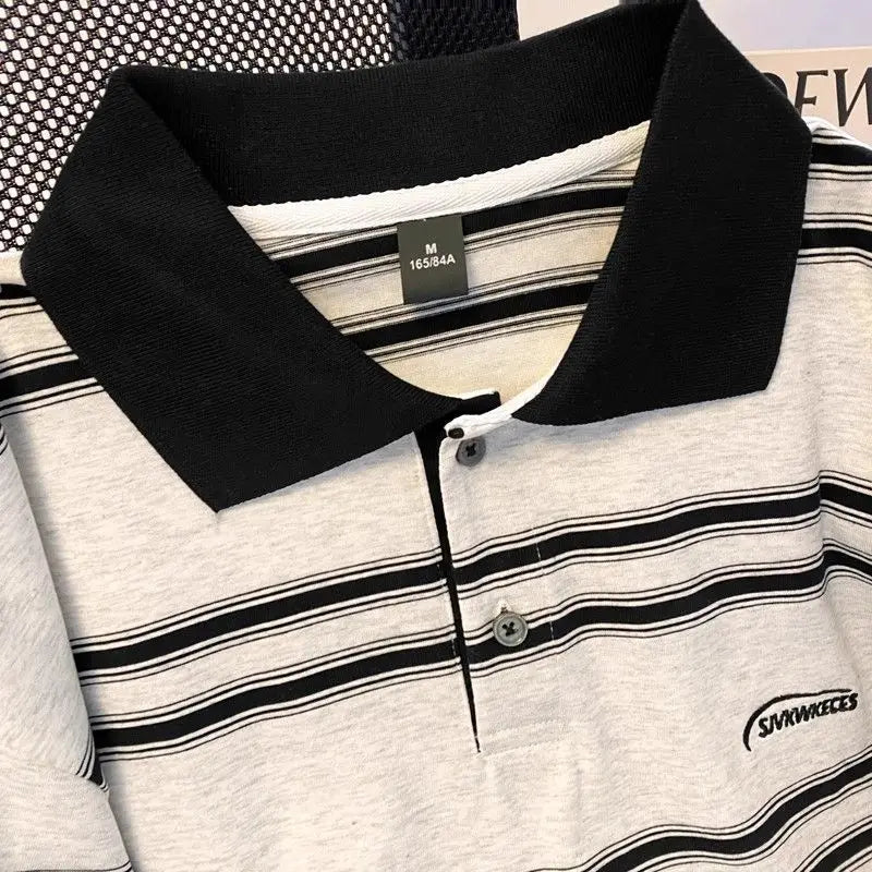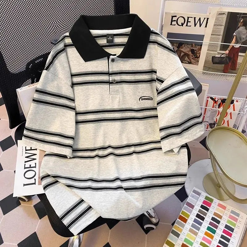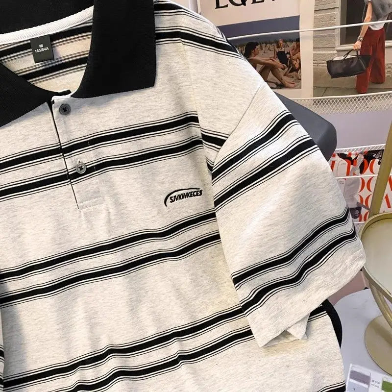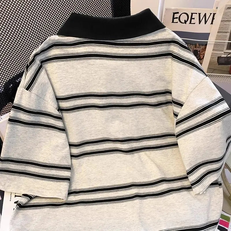 High street hip-hop men and women trendy personalized striped polo short sleeved couple summer loose retro casual Harajuku top
