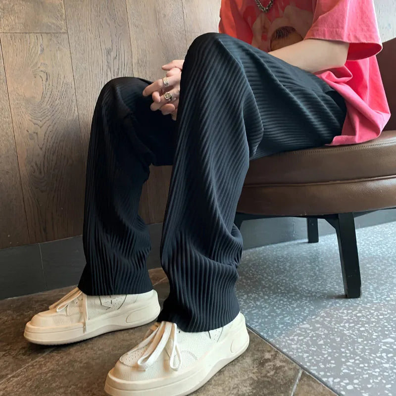 Summer Casual Pants Men Black Gray Ice Silk Pants Men Japanese Streetwear Hip-hop Loose Straight Trousers Mens Pleated Pants