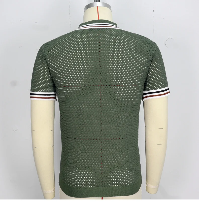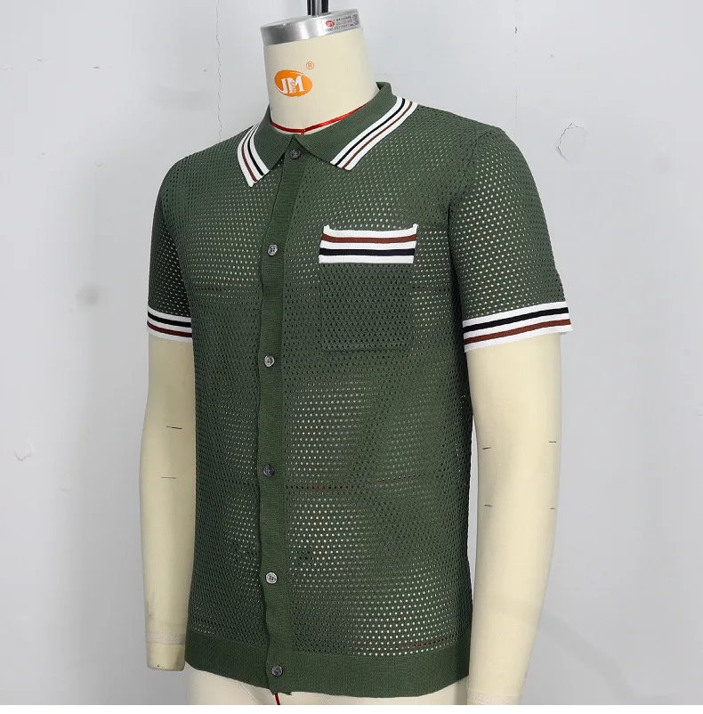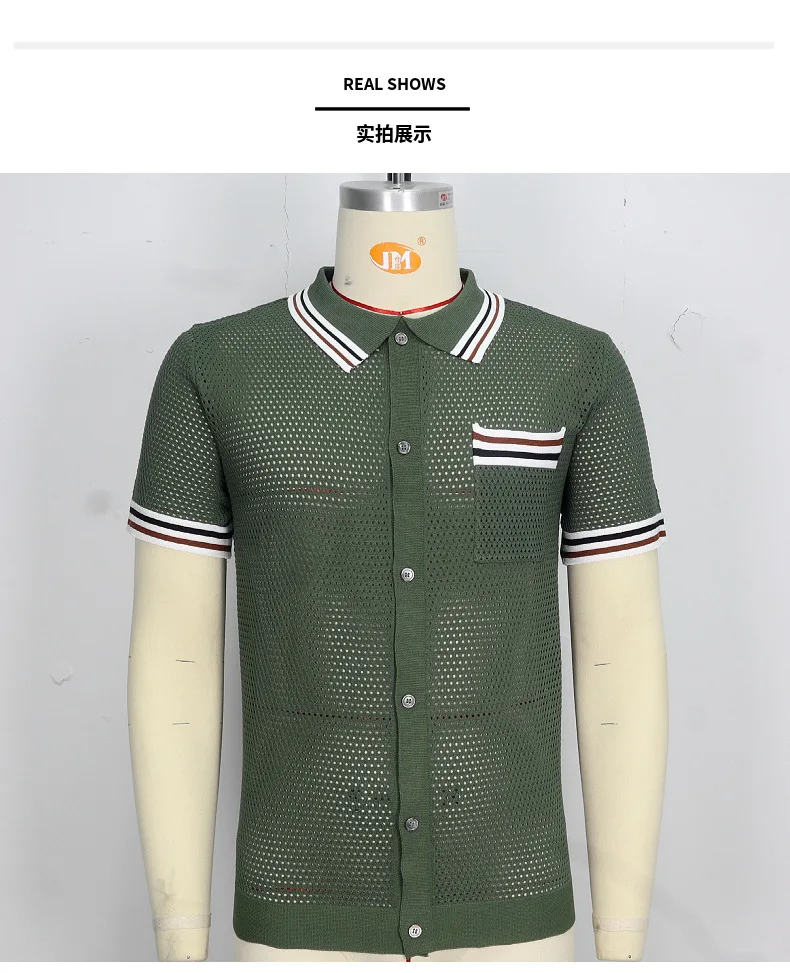Summer Men's Clothing Light Luxury Knit Hollow Out Pocket Short Sleeve Polo Shirt Lapel Button-down Solid Color Fashion Knitwear
